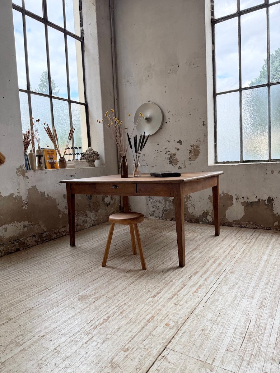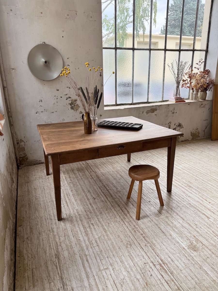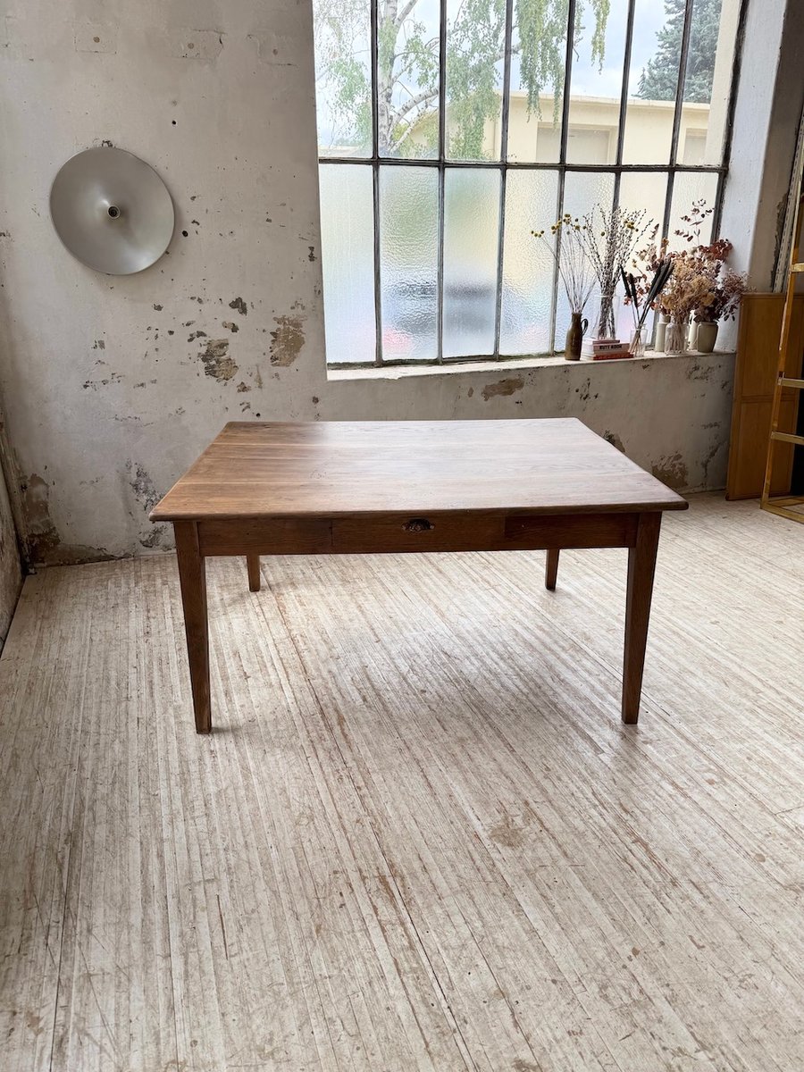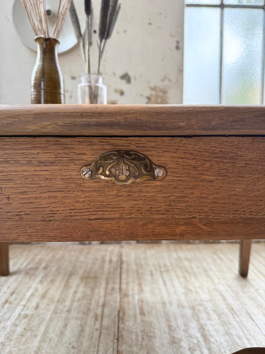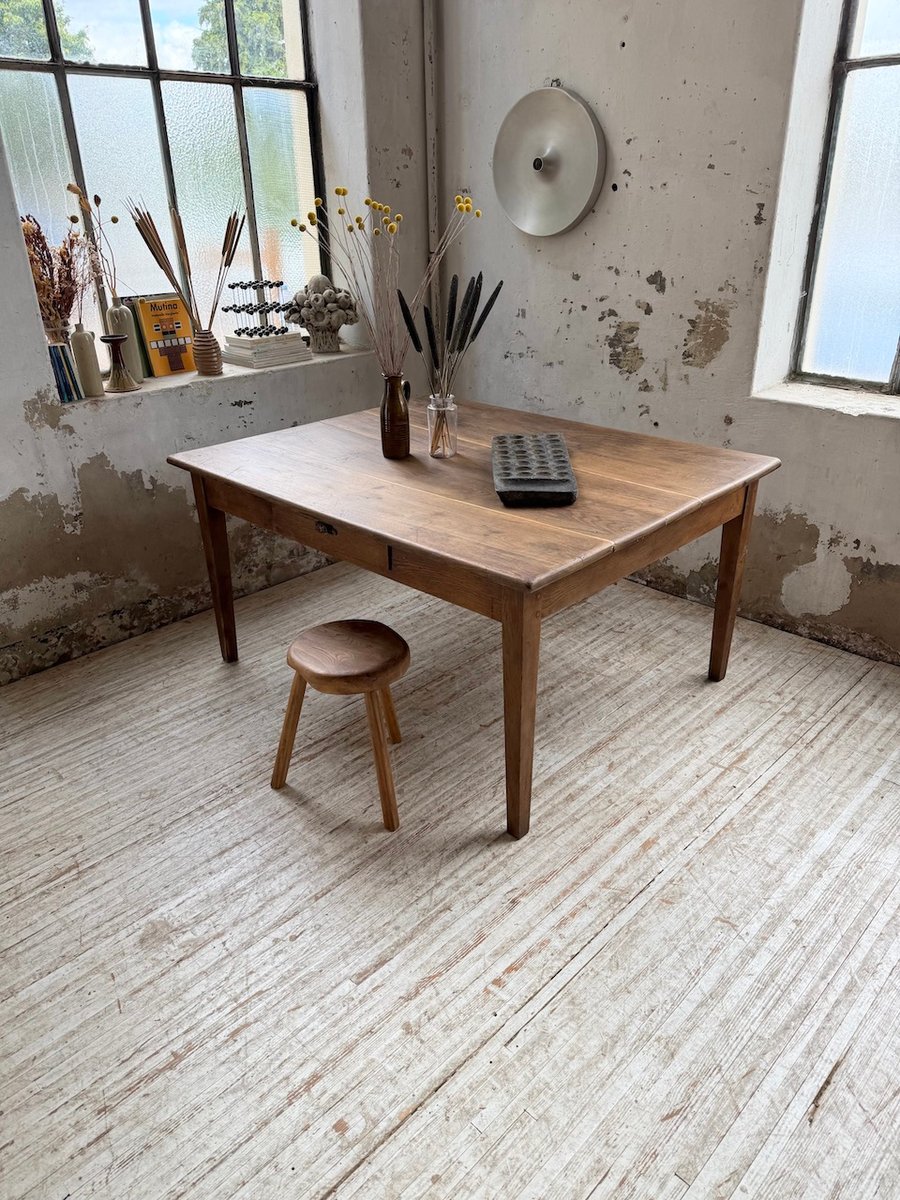 Nos encanta su forma única, con sus dimensiones casi cuadradas. Apoyada sobre cuatro patas cónicas, la pieza tiene una elegancia preciosa. Un cajón de almacenamiento rematado con un tirador en forma de concha. Totalmente restaurada, lijada, tratada y ligeramente teñida para resaltar el veteado. En muy buen estado general, esta mesa es antigua y, naturalmente, tiene una pátina limpia y posibles imperfecciones en la madera.