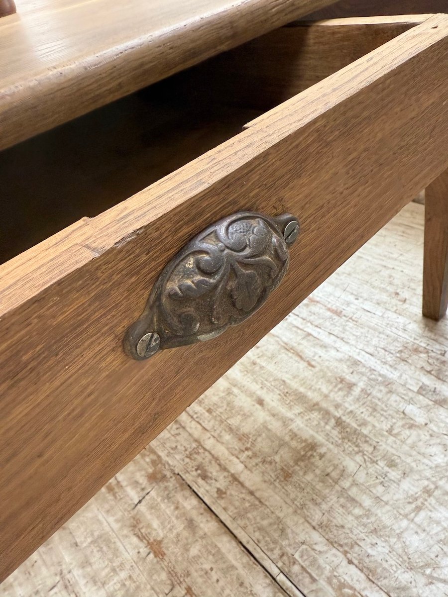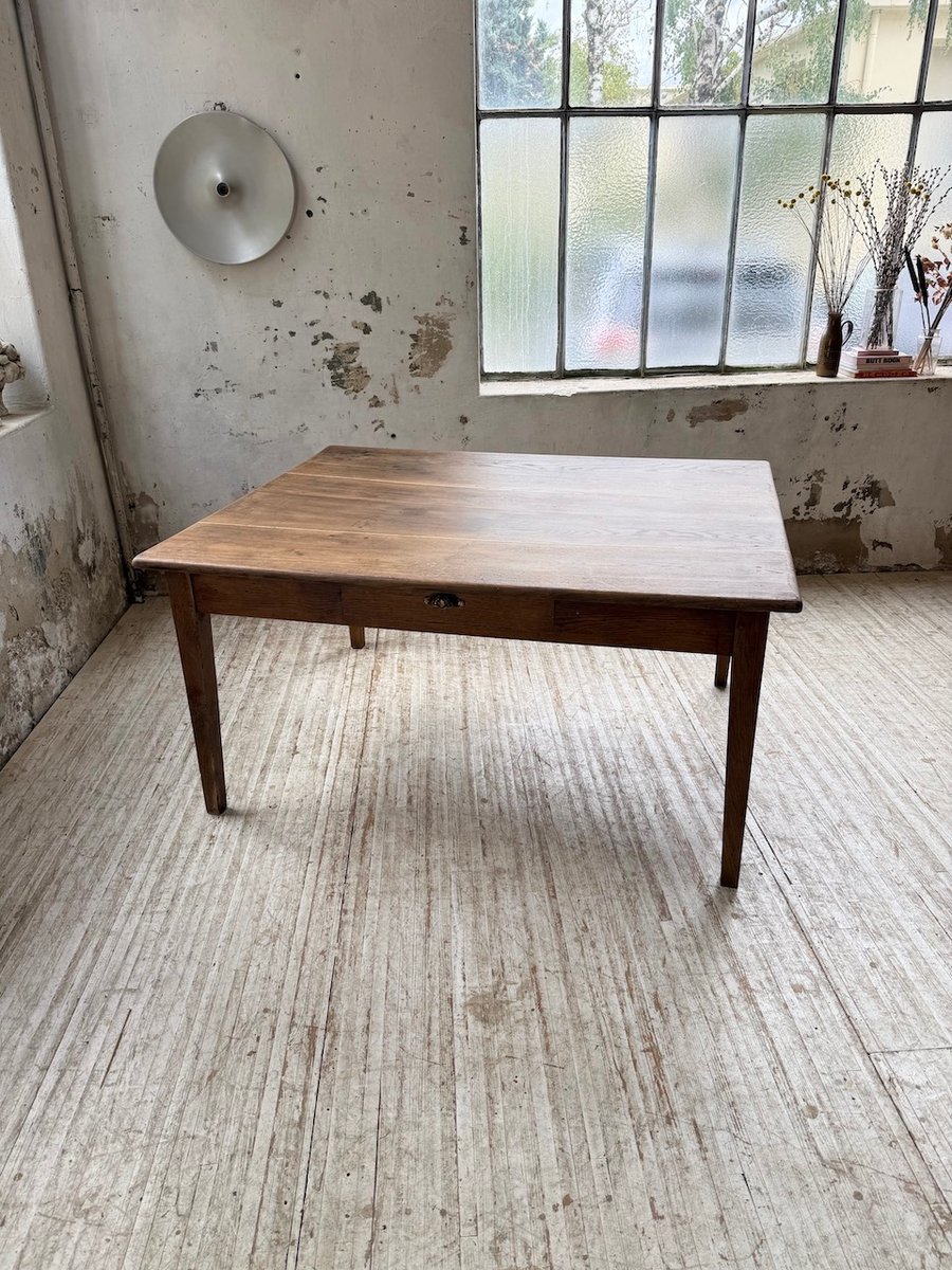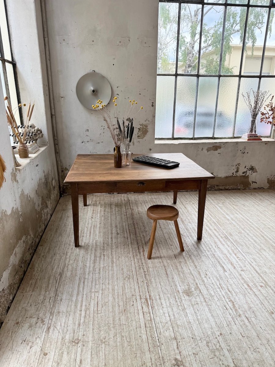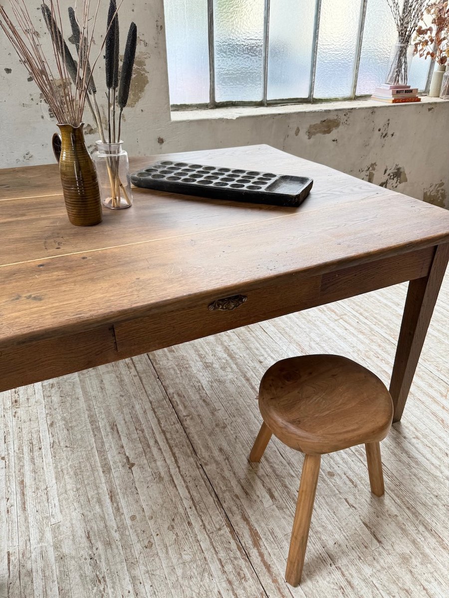 Nos encanta su forma única, con sus dimensiones casi cuadradas. Apoyada sobre cuatro patas cónicas, la pieza tiene una elegancia preciosa. Un cajón de almacenamiento rematado con un tirador en forma de concha. Totalmente restaurada, lijada, tratada y ligeramente teñida para resaltar el veteado. En muy buen estado general, esta mesa es antigua y, naturalmente, tiene una pátina limpia y posibles imperfecciones en la madera.