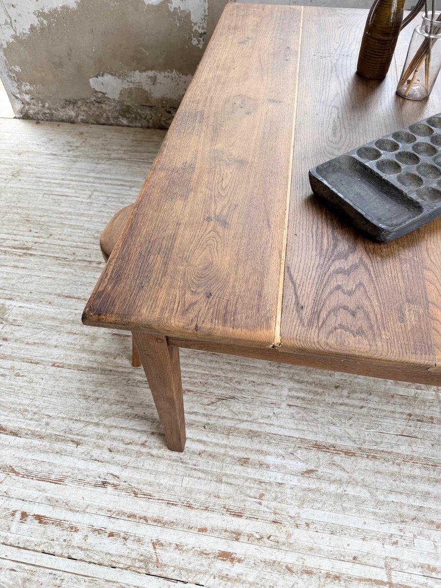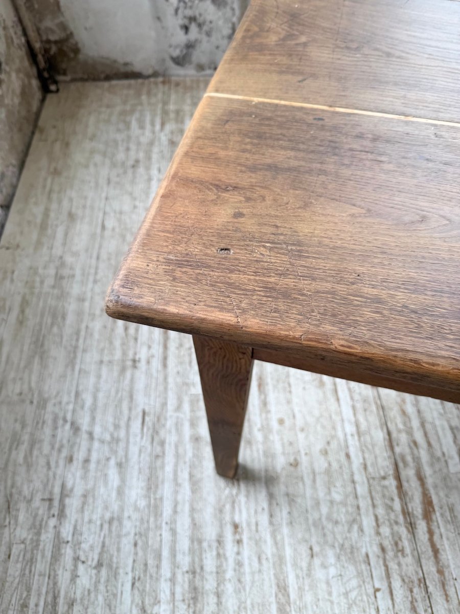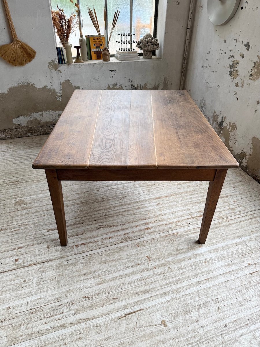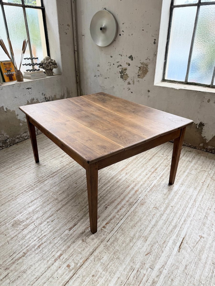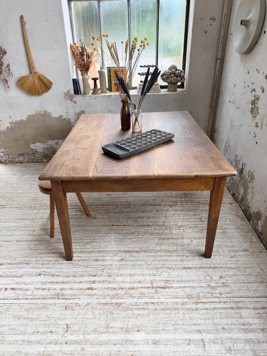 Nos encanta su forma única, con sus dimensiones casi cuadradas. Apoyada sobre cuatro patas cónicas, la pieza tiene una elegancia preciosa. Un cajón de almacenamiento rematado con un tirador en forma de concha. Totalmente restaurada, lijada, tratada y ligeramente teñida para resaltar el veteado. En muy buen estado general, esta mesa es antigua y, naturalmente, tiene una pátina limpia y posibles imperfecciones en la madera.