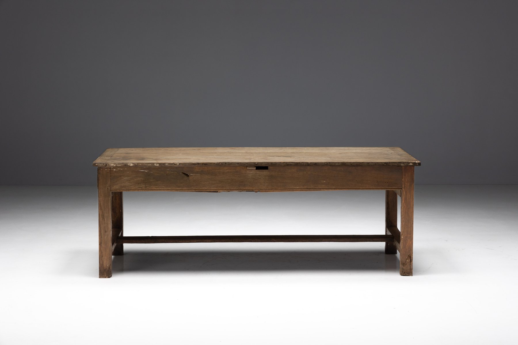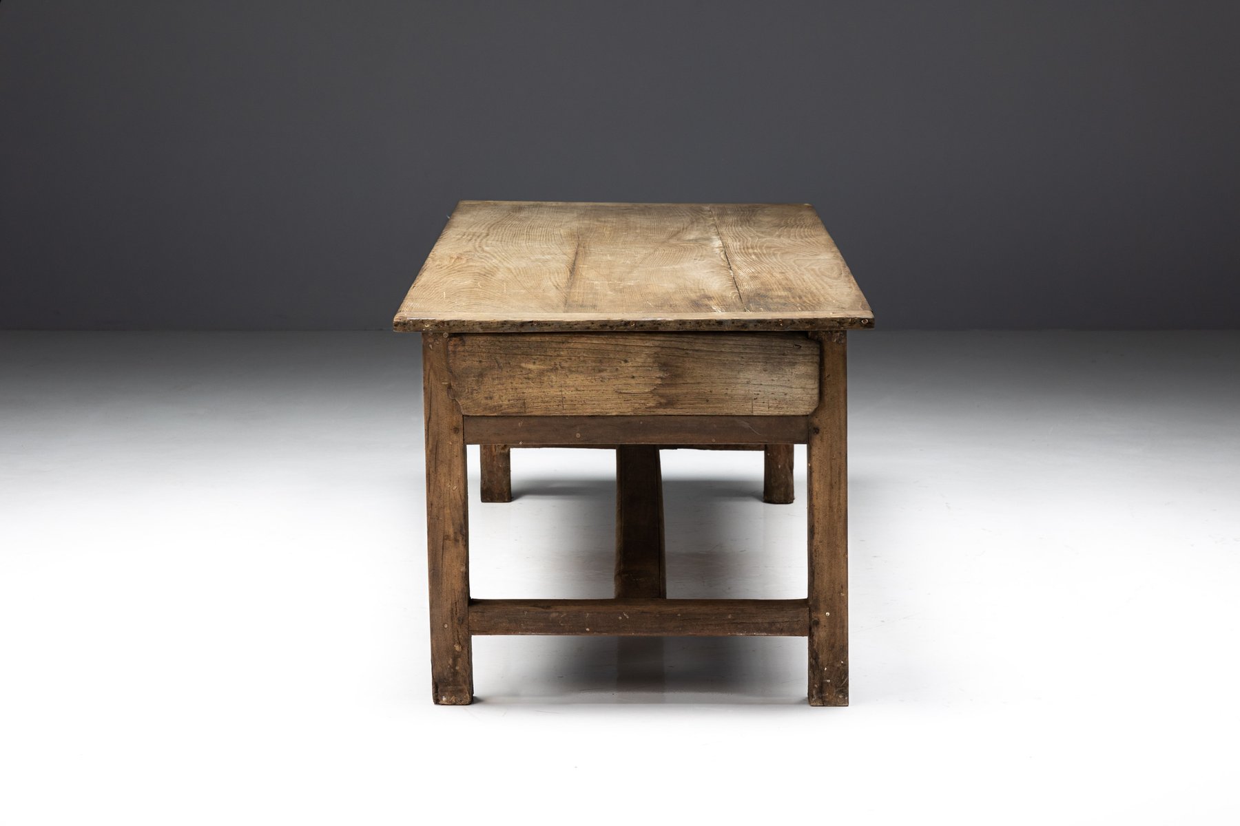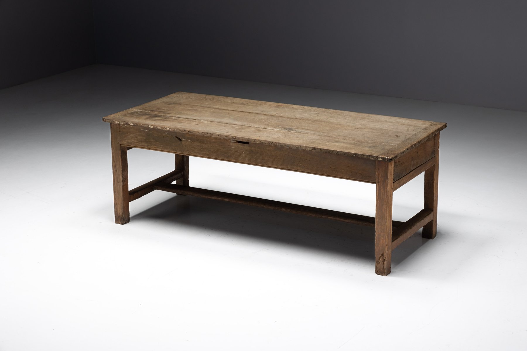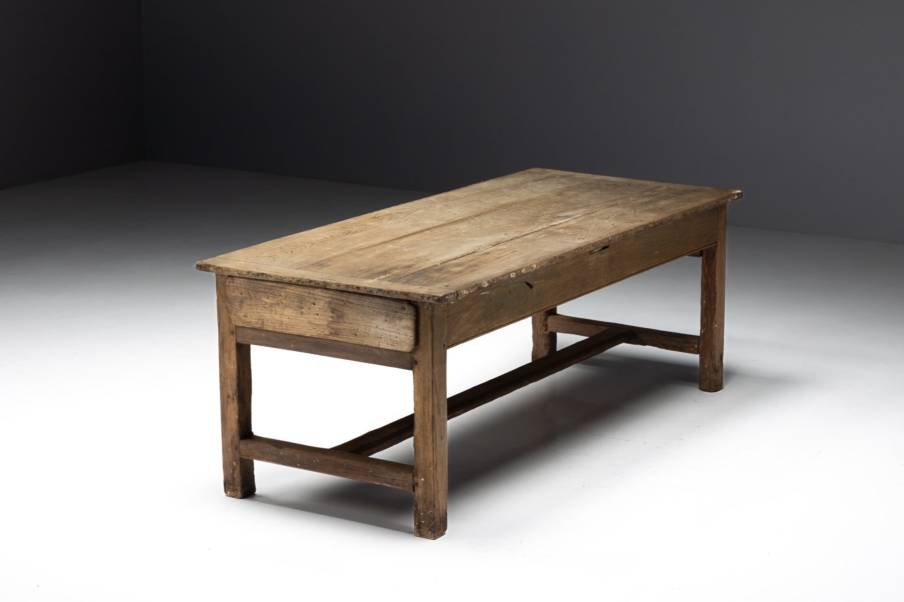 This rustic dining table originates from rural France in the 19th century and belongs to the tradition of Art Populaire, where function, durability, and local craftsmanship prevailed over formal design conventions. Crafted from solid wood, its generously proportioned plank top rests on a straightforward, sturdy base, reinforced by stretchers that speak to everyday agricultural use. The surface bears a richly developed patina, shaped by decades of domestic life, while subtle irregularities in the wood reveal the hand of the maker and the natural behavior of the material over time.