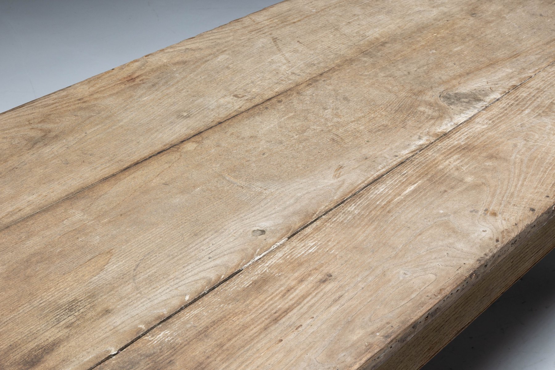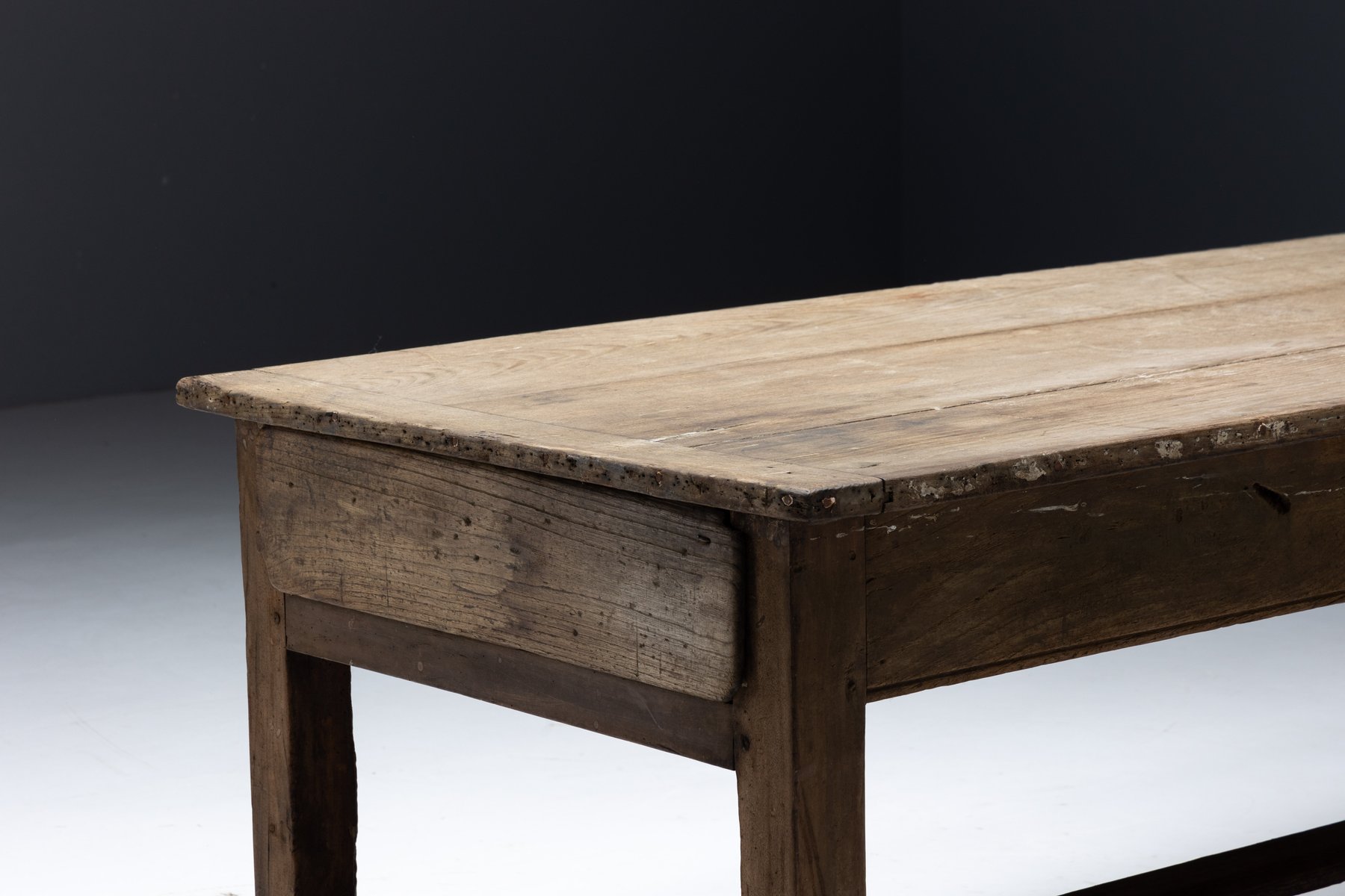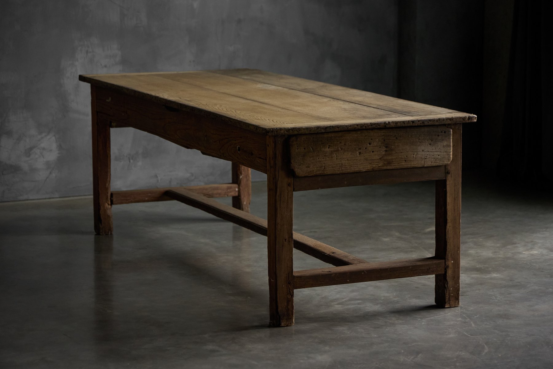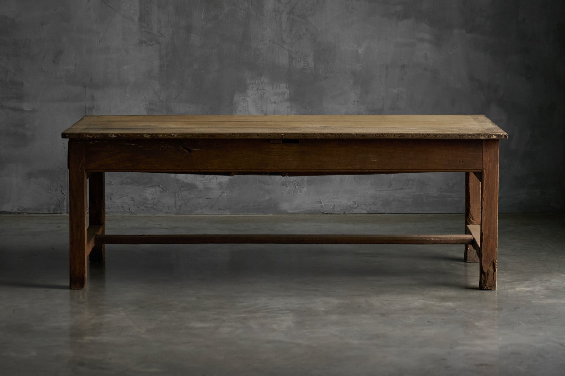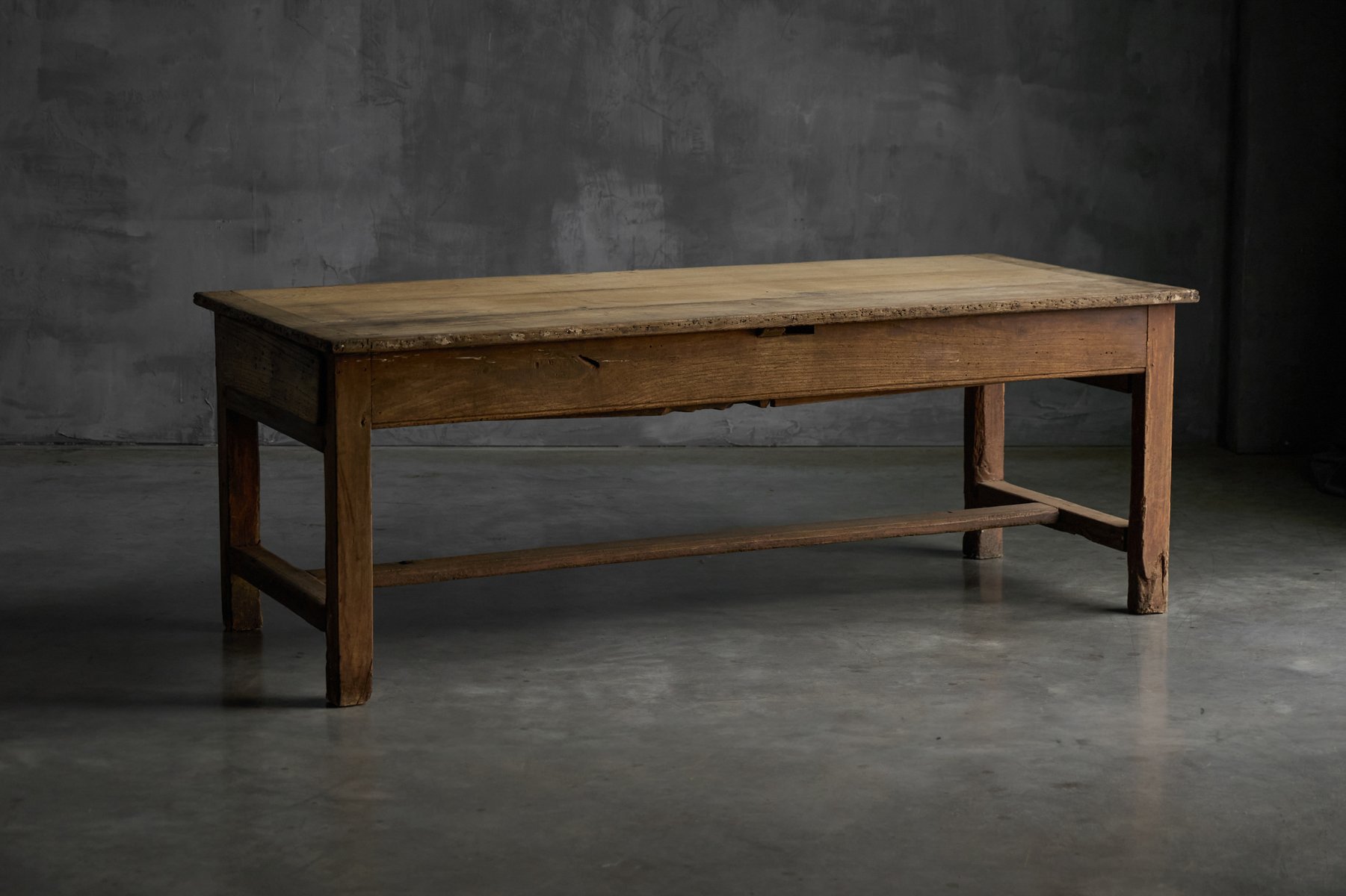 This rustic dining table originates from rural France in the 19th century and belongs to the tradition of Art Populaire, where function, durability, and local craftsmanship prevailed over formal design conventions. Crafted from solid wood, its generously proportioned plank top rests on a straightforward, sturdy base, reinforced by stretchers that speak to everyday agricultural use. The surface bears a richly developed patina, shaped by decades of domestic life, while subtle irregularities in the wood reveal the hand of the maker and the natural behavior of the material over time.