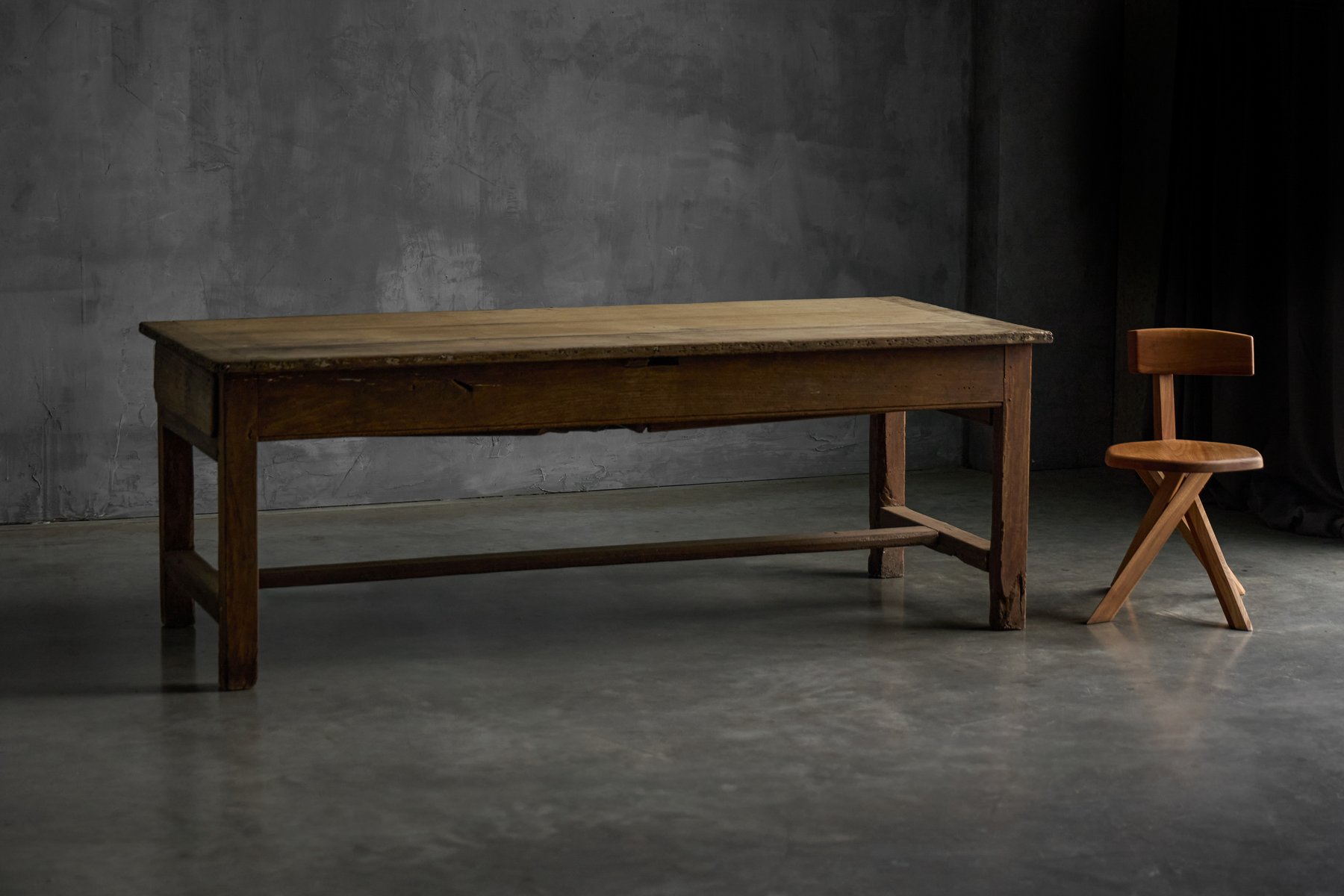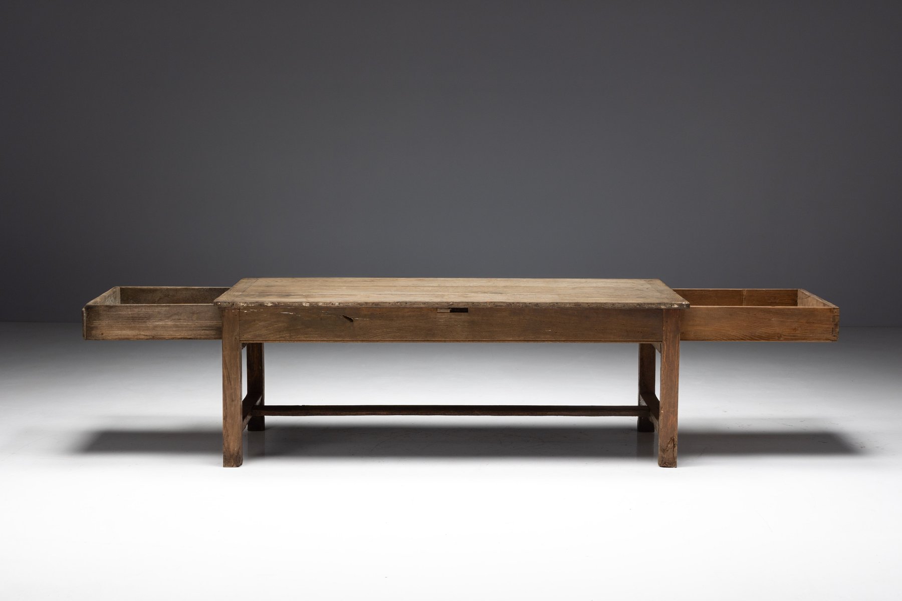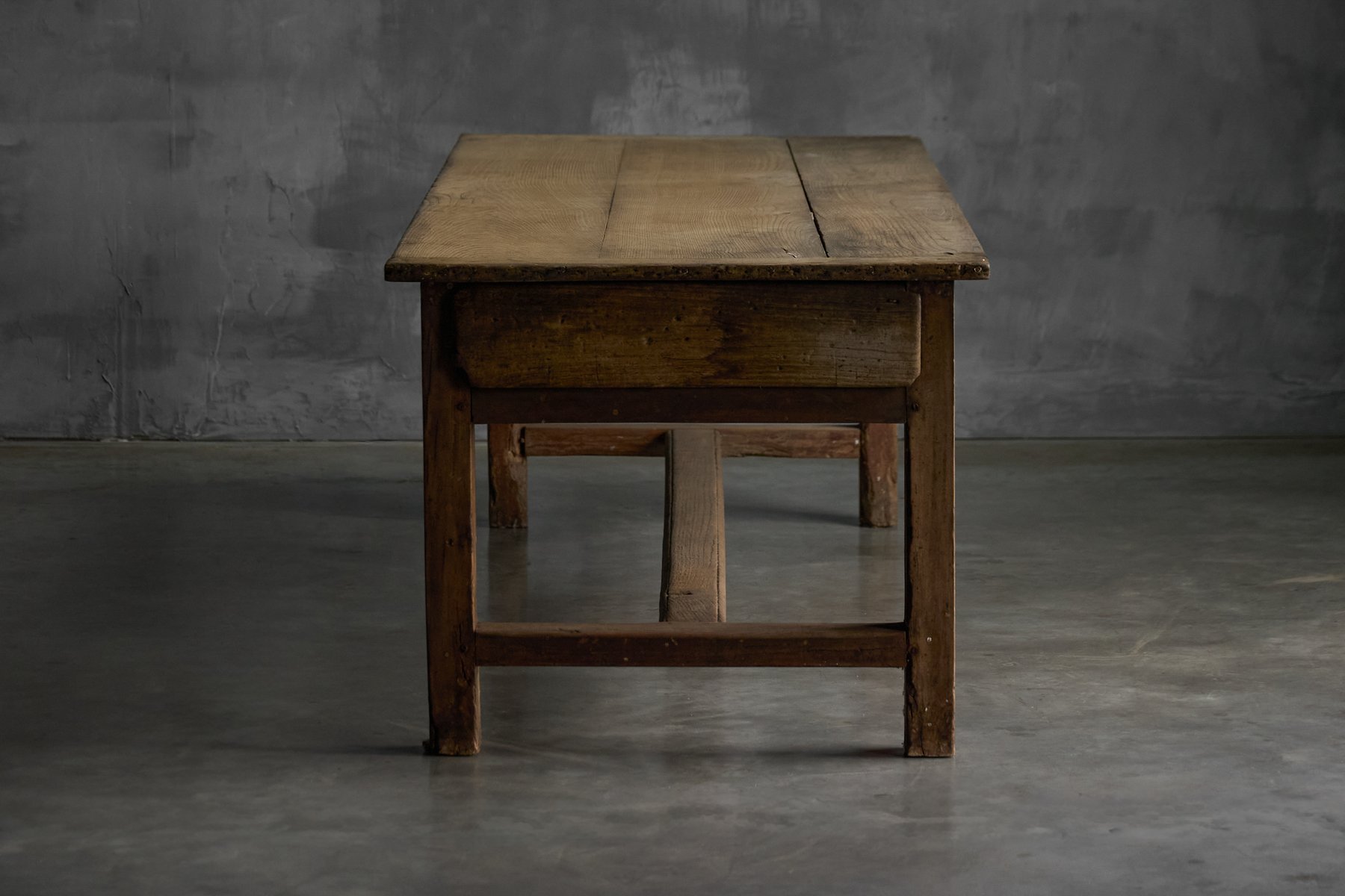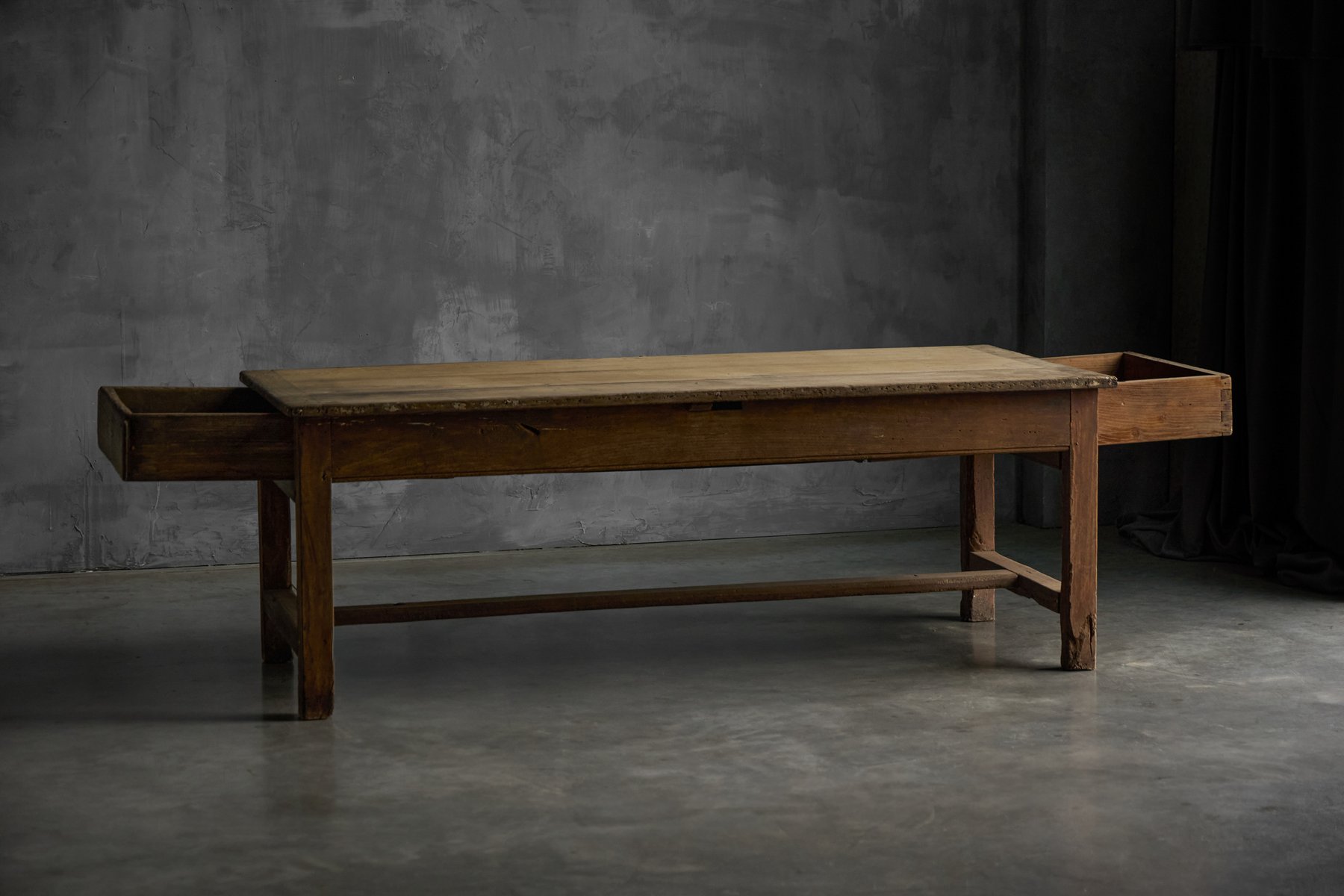 The presence of a drawer on each long side is a practical feature rarely preserved so intact, offering balanced storage while reinforcing the table’s utilitarian origins. Though unmarked, the table reflects the vernacular furniture-making practices of provincial French workshops rather than the output of a known designer, embodying the regional savoir-faire that defines Art Populaire. As with all our rustic and antique furniture, this piece has undergone a two-cycle preventive woodworm treatment to ensure long-term preservation and stability.
