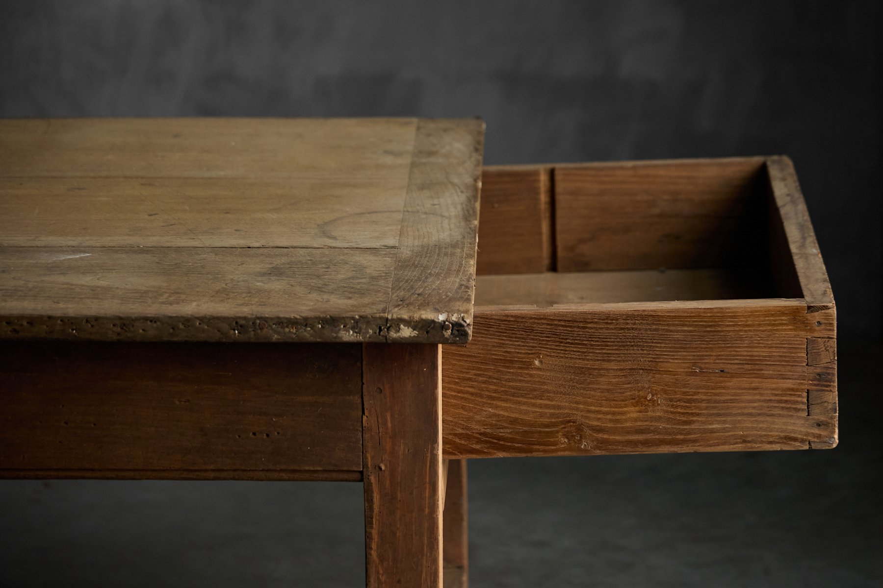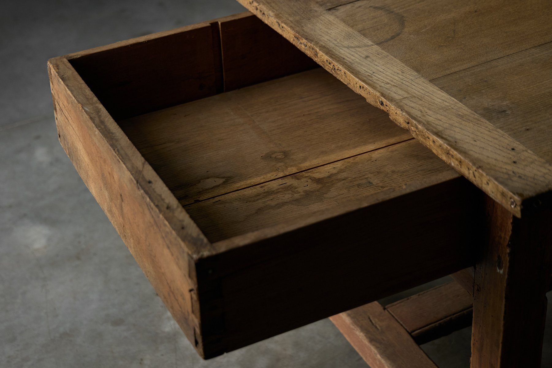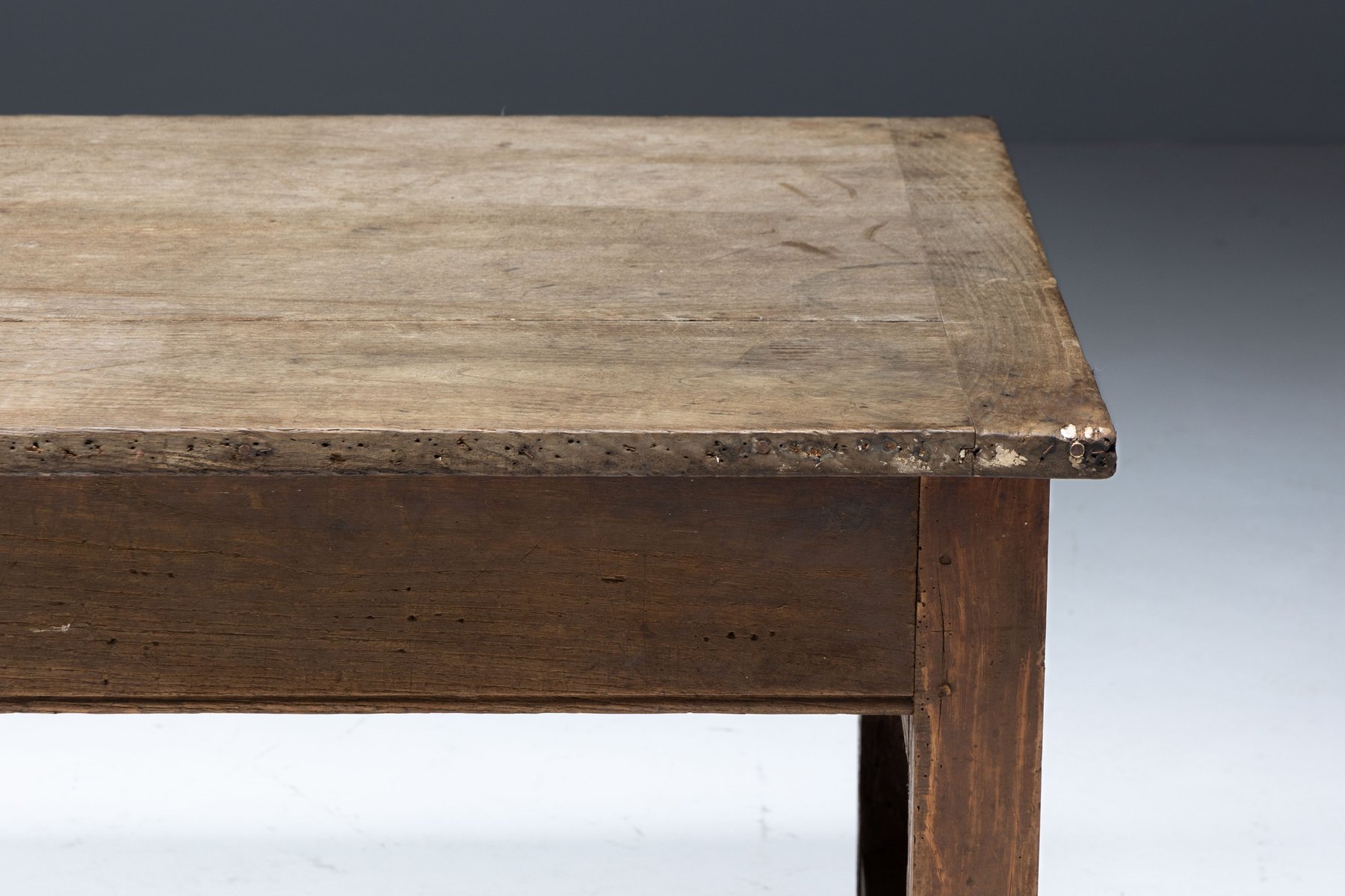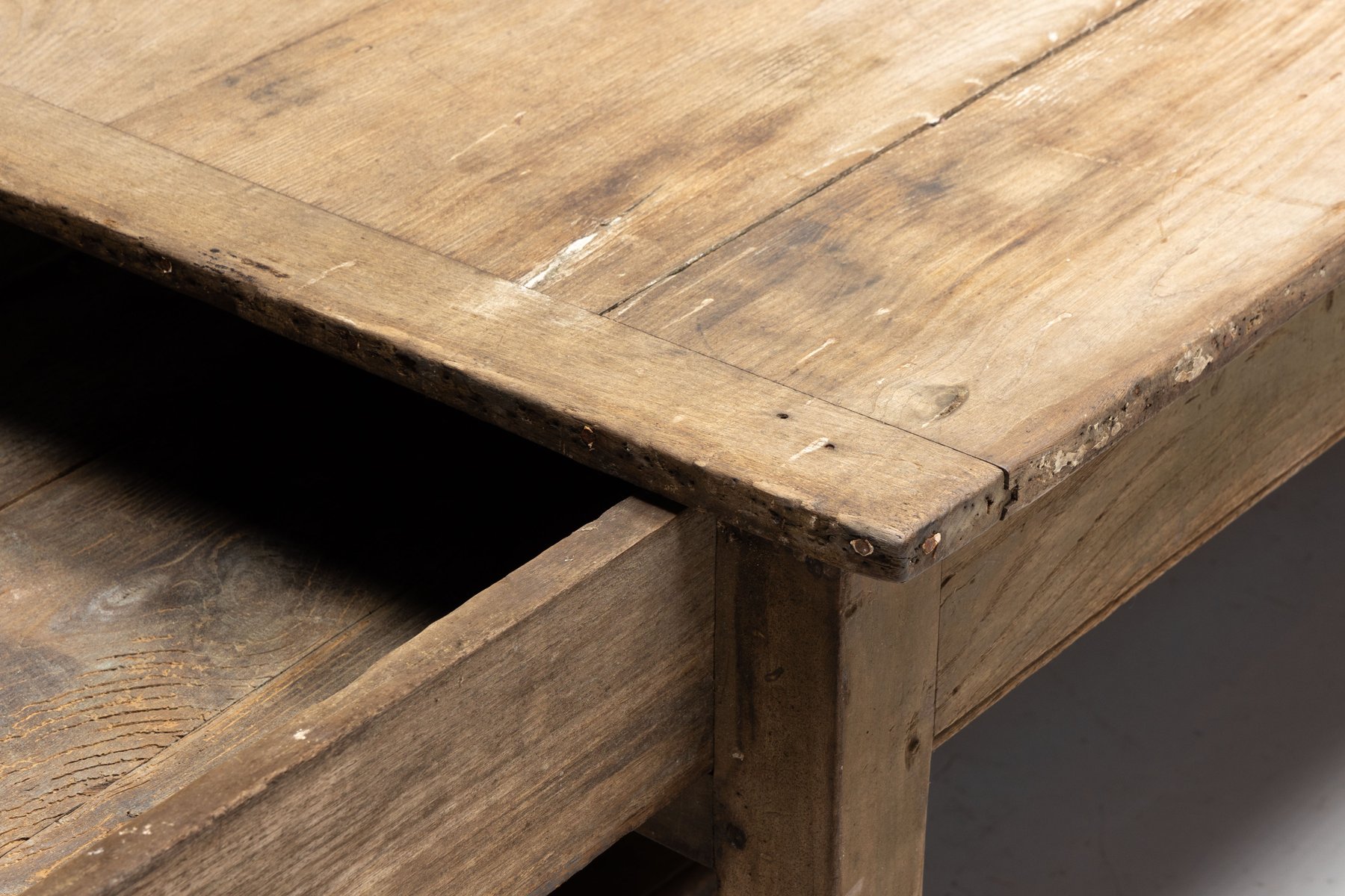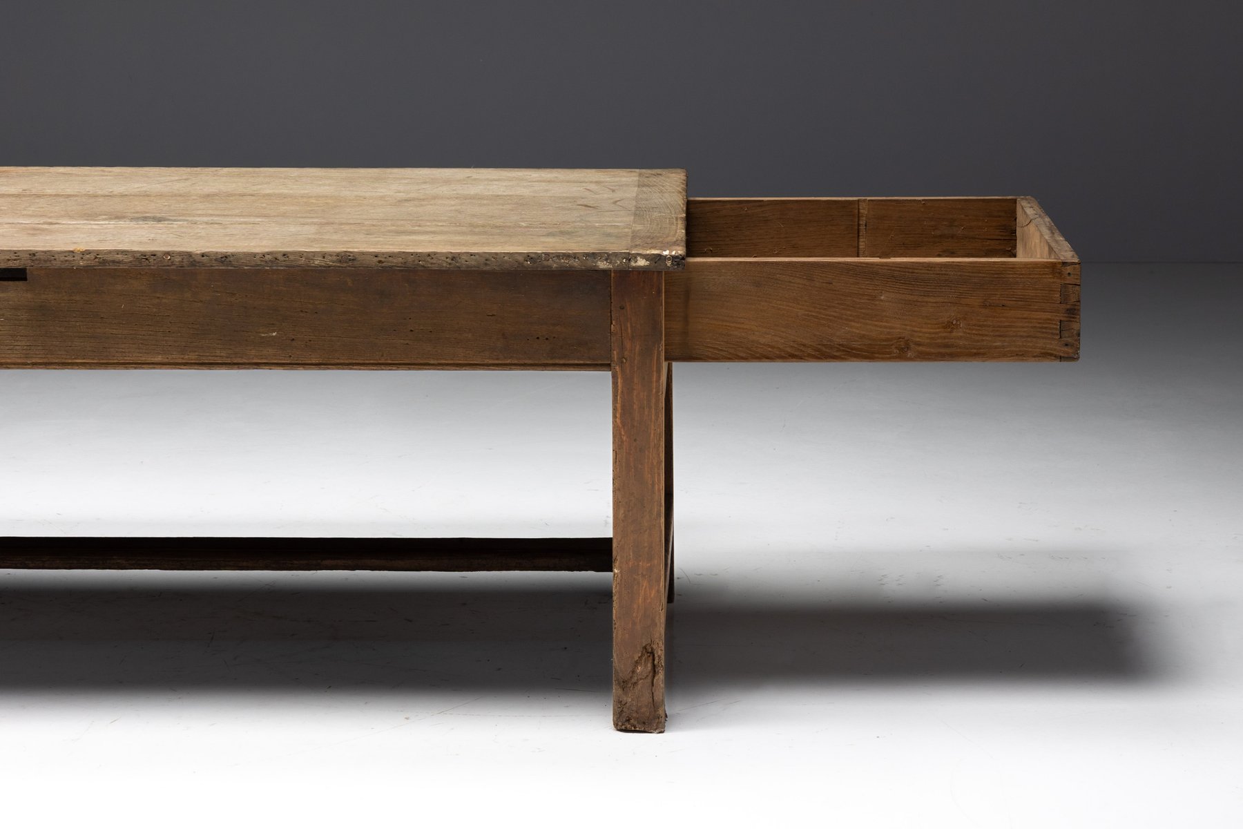 The presence of a drawer on each long side is a practical feature rarely preserved so intact, offering balanced storage while reinforcing the table’s utilitarian origins. Though unmarked, the table reflects the vernacular furniture-making practices of provincial French workshops rather than the output of a known designer, embodying the regional savoir-faire that defines Art Populaire. As with all our rustic and antique furniture, this piece has undergone a two-cycle preventive woodworm treatment to ensure long-term preservation and stability.