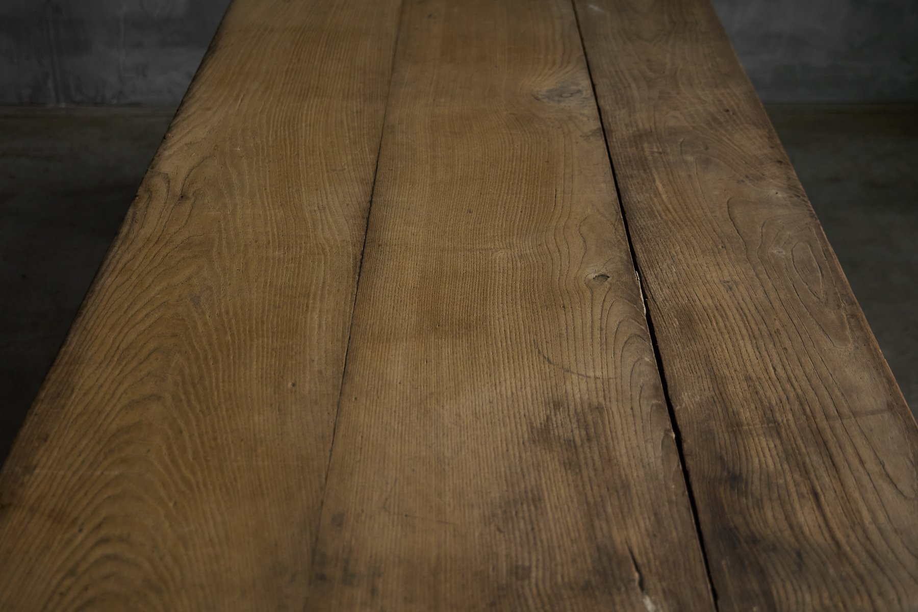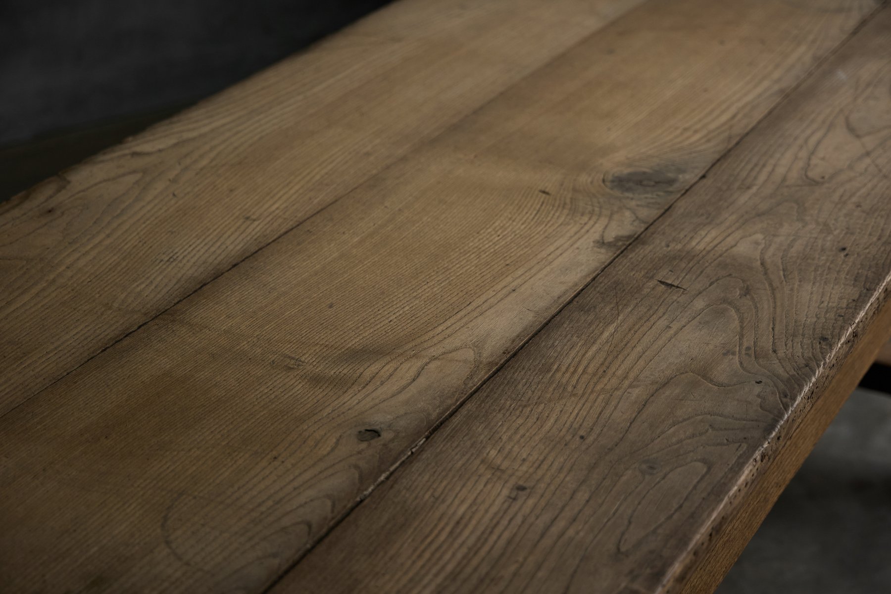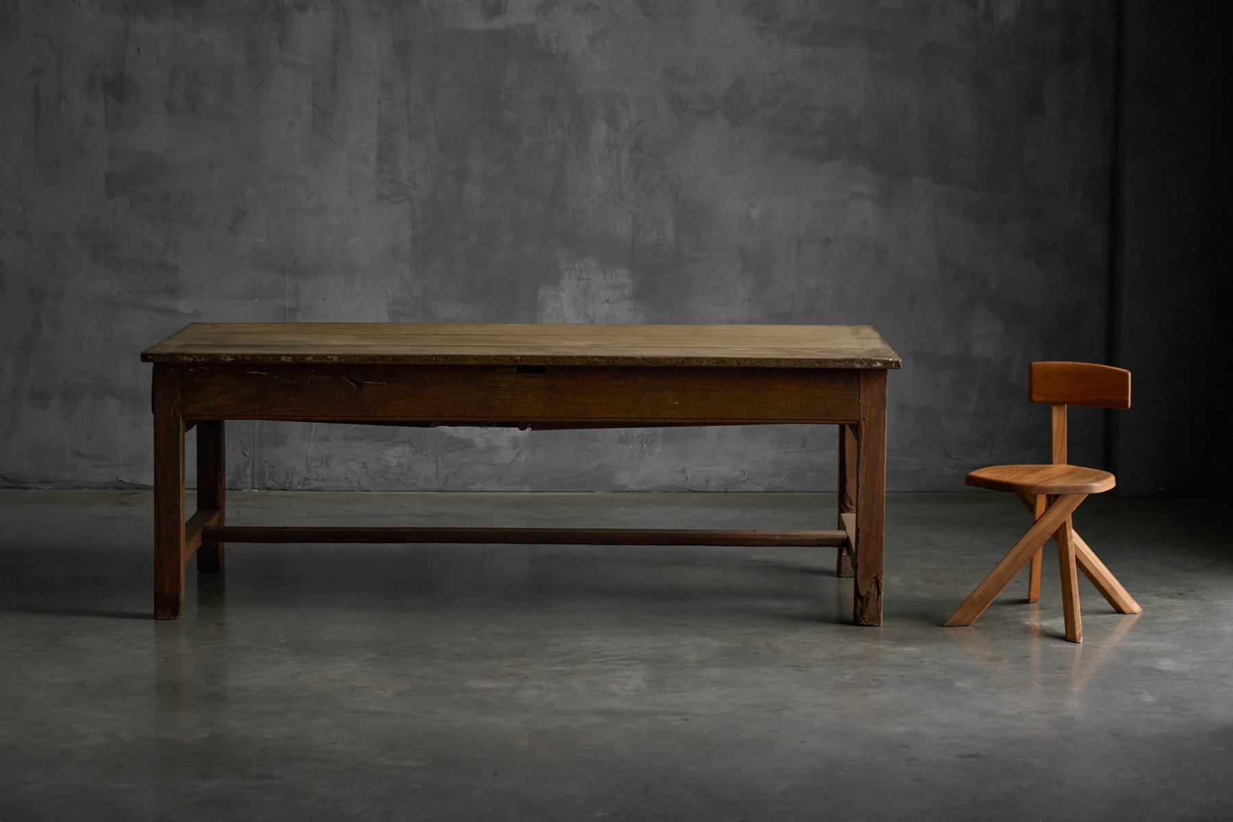 Esta mesa de comedor rústica tiene su origen en la Francia rural del siglo XIX y pertenece a la tradición del Art Populaire, donde la funcionalidad, la durabilidad y la artesanía local prevalecían sobre las convenciones formales del diseño. Fabricada en madera maciza, su generosa superficie de tablones descansa sobre una base sencilla y robusta, reforzada con travesaños que denotan su uso agrícola cotidiano. La superficie presenta una pátina muy desarrollada, moldeada por décadas de vida doméstica, mientras que las sutiles irregularidades de la madera revelan la mano del fabricante y el comportamiento natural del material a lo largo del tiempo. La presencia de un cajón en cada lado largo es una característica práctica que rara vez se conserva tan intacta, ya que ofrece un almacenamiento equilibrado y refuerza los orígenes utilitarios de la mesa. Aunque no está marcada, la mesa refleja las prácticas vernáculas de fabricación de muebles de los talleres provinciales franceses, más que la producción de un diseñador conocido, y encarna el savoir-faire regional que define el Art Populaire. Al igual que todos nuestros muebles rústicos y antiguos, esta pieza ha sido sometida a un tratamiento preventivo contra la carcoma en dos ciclos para garantizar su conservación y estabilidad a largo plazo.