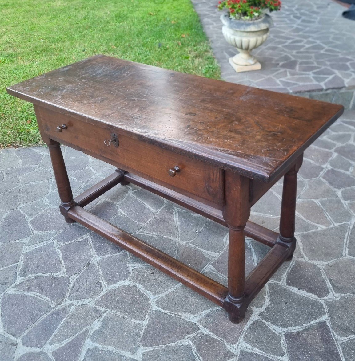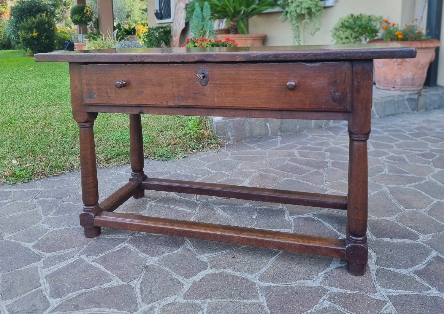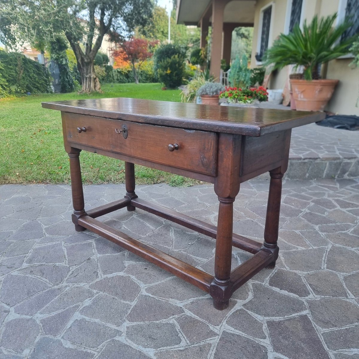 Despite the passage of time, the structure has remained perfectly stable and well-balanced. Thus, every mark of the wood becomes a trace of the past, a detail that adds character and authenticity. This table is not just a piece of furniture, but a tangible fragment of Italian history.