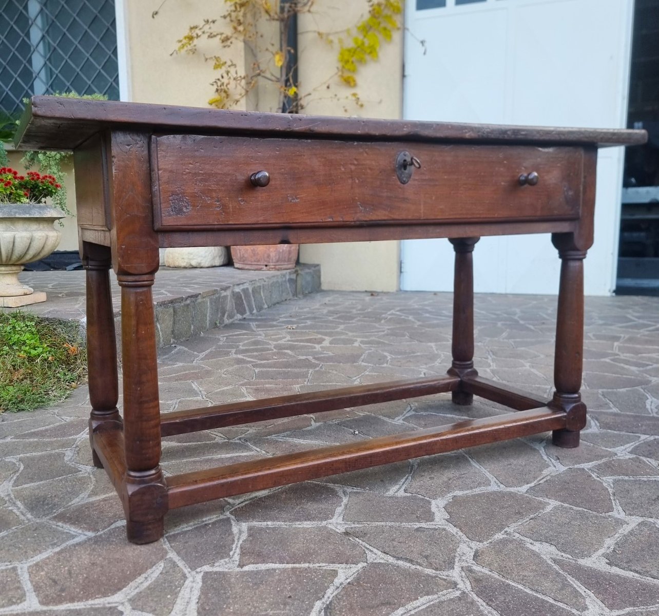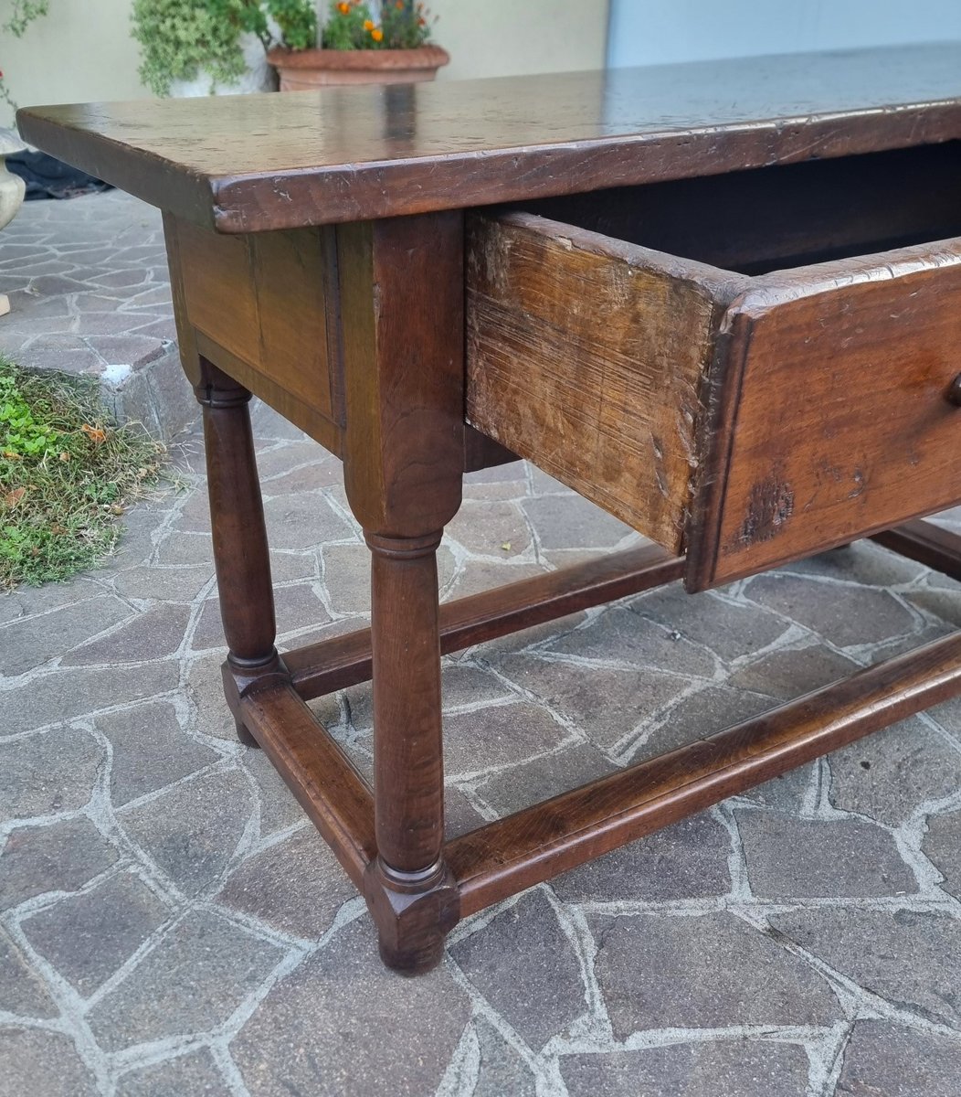 Oak, chosen for its hardness and durability, gives this table exceptional solidity. Furthermore, the period craftsmanship, visible in the joints and turned legs, testifies to the exceptional level of 17th-century Tuscan craftsmanship.