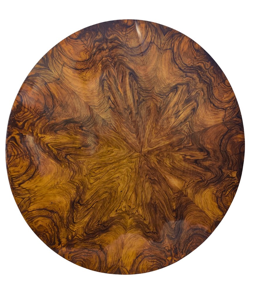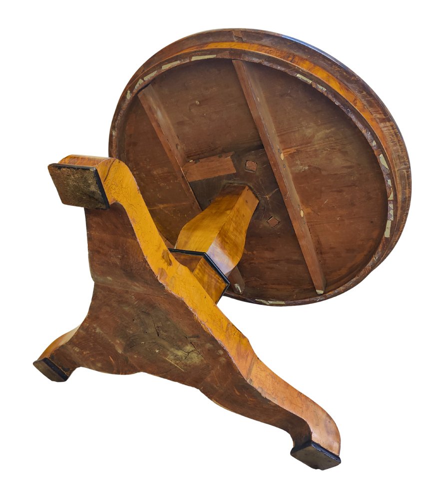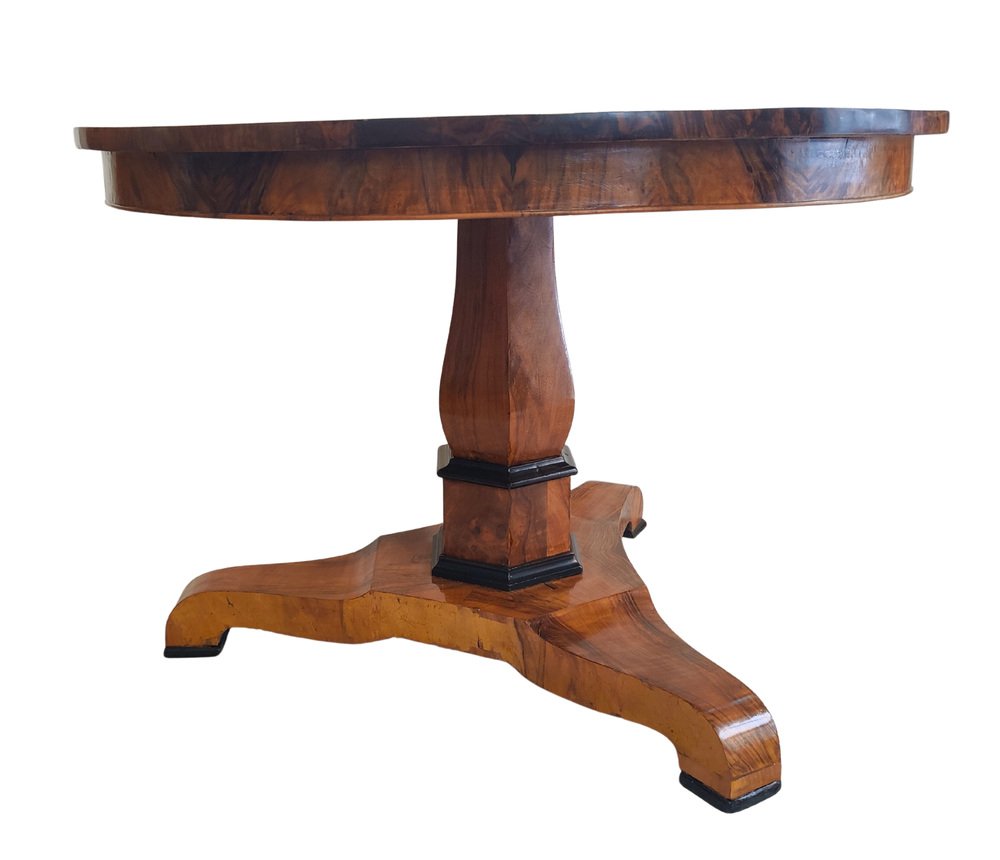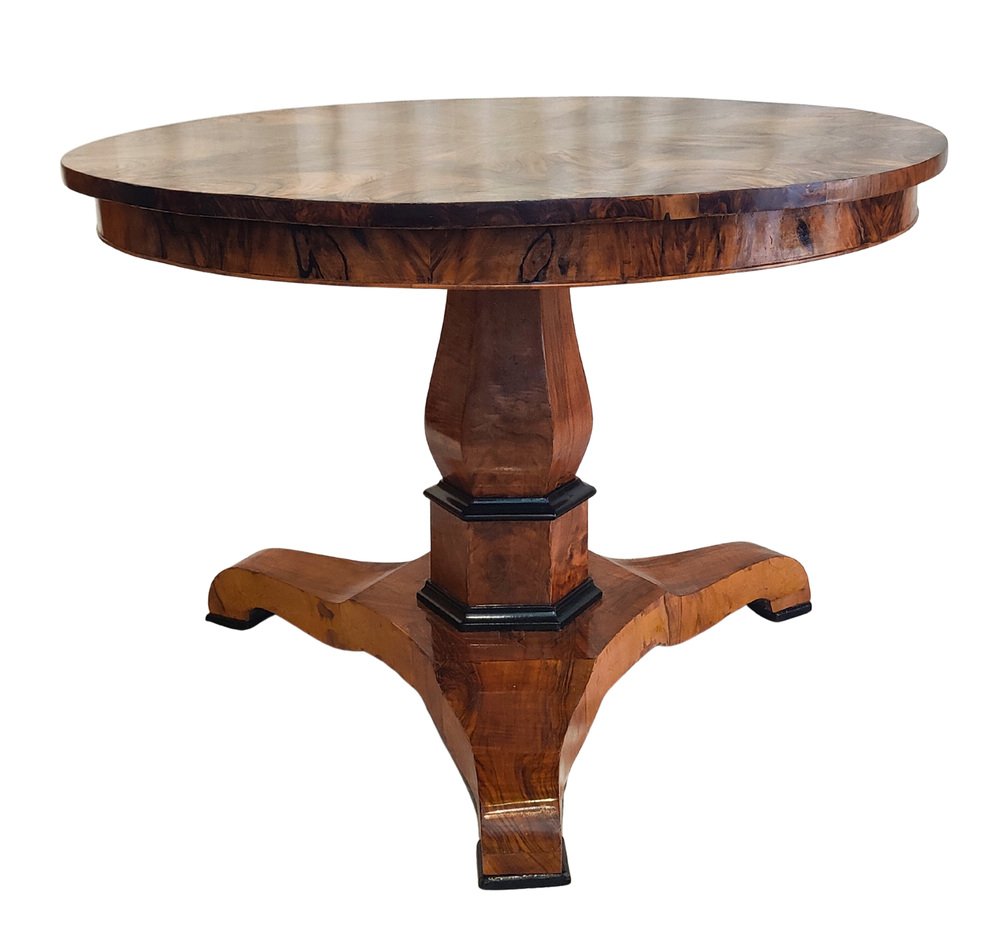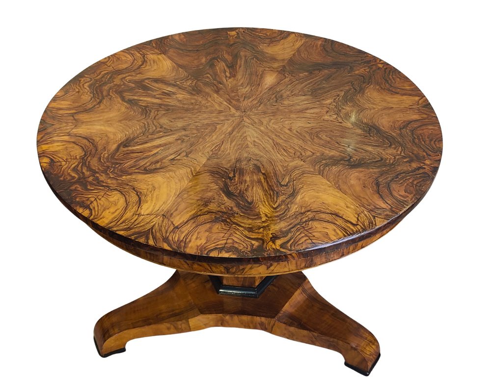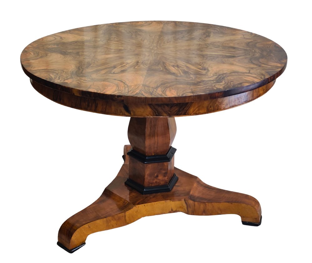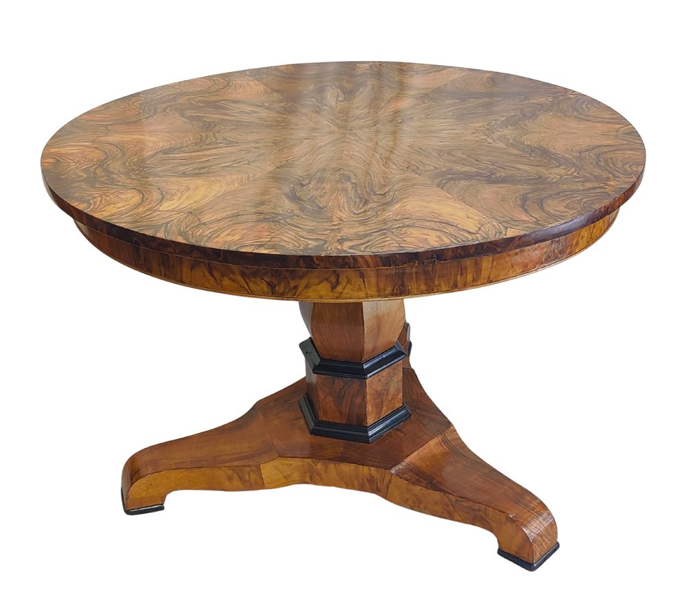 Refined Biedermeier round salon table in walnut from the early 19th century. The circular top is veneered in richly figured walnut burl arranged in a radiating starburst that reads beautifully from every angle. The thick apron sits on an octagonal column and a sculptural tri-form base, all walnut veneered, with ebonized collars and foot blocks that underline the clear geometry typical of Biedermeier design. The surface has been professionally restored and hand-polished with shellac, giving a deep, warm gloss while preserving the character of the timber. Underside construction and joinery are consistent with period craftsmanship.