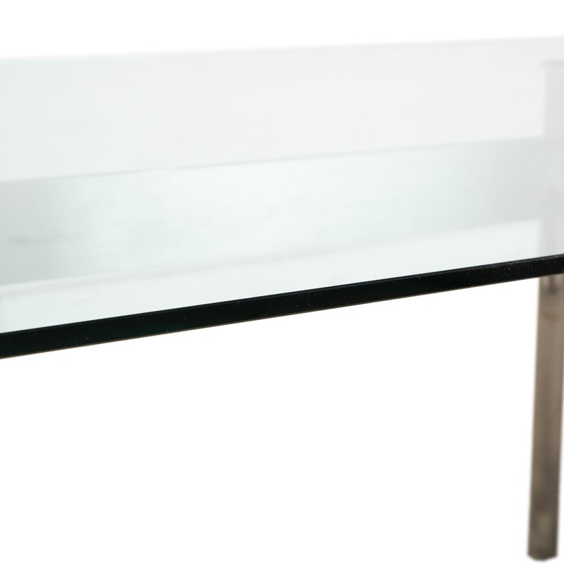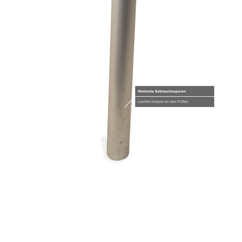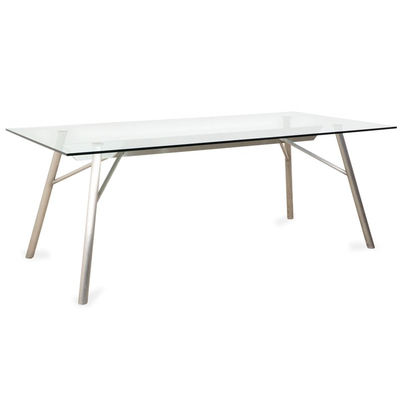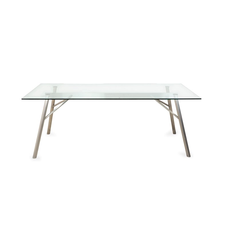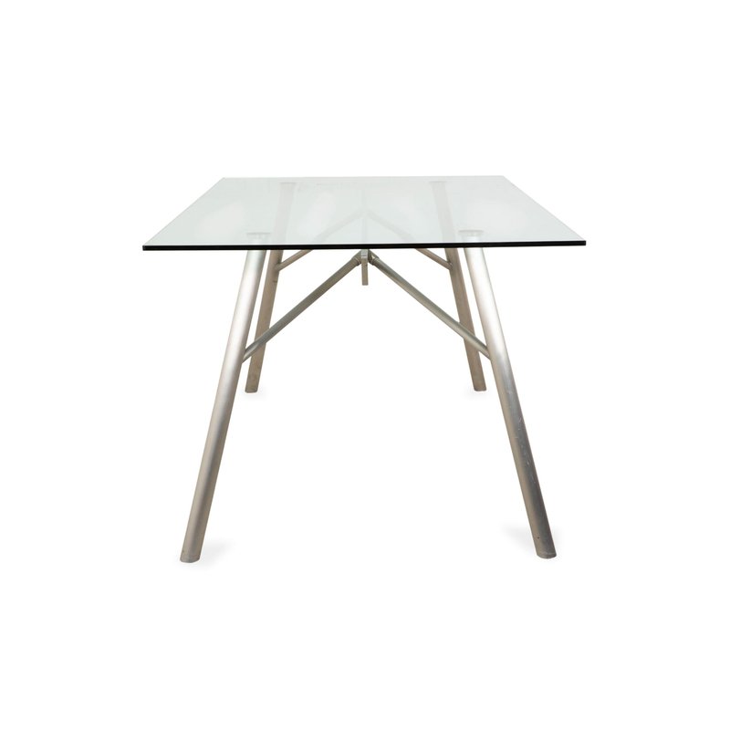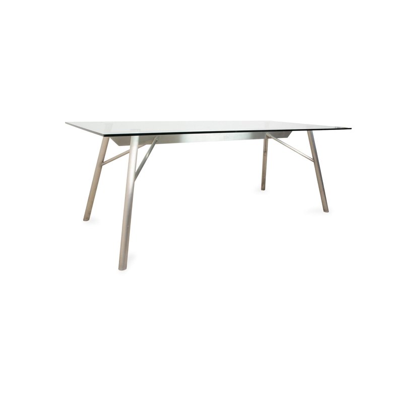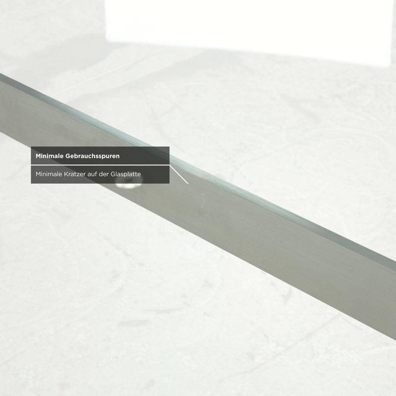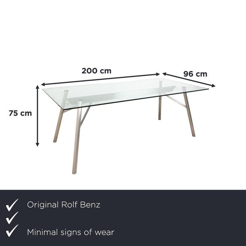 This Rolf Benz glass table is an architectural statement that doesn't impose itself, but rather allows the room to breathe. with its generous dimensions of 200 x 96 cm, it comfortably seats 6 to 8 people without appearing bulky. The tabletop consists of a large expanse of clear glass, offering an unobstructed view of the floor and allowing light to flow freely – perfect for making even smaller rooms feel larger. The frame is finished in matte silver (gray/aluminum look) and impresses with its technical sophistication: The four tubular legs are slightly splayed, giving the table a dynamic and stable appearance. They are connected beneath the glass top by a visible metal structure, reminiscent of the framework of a modern bridge, further emphasizing its technical character.