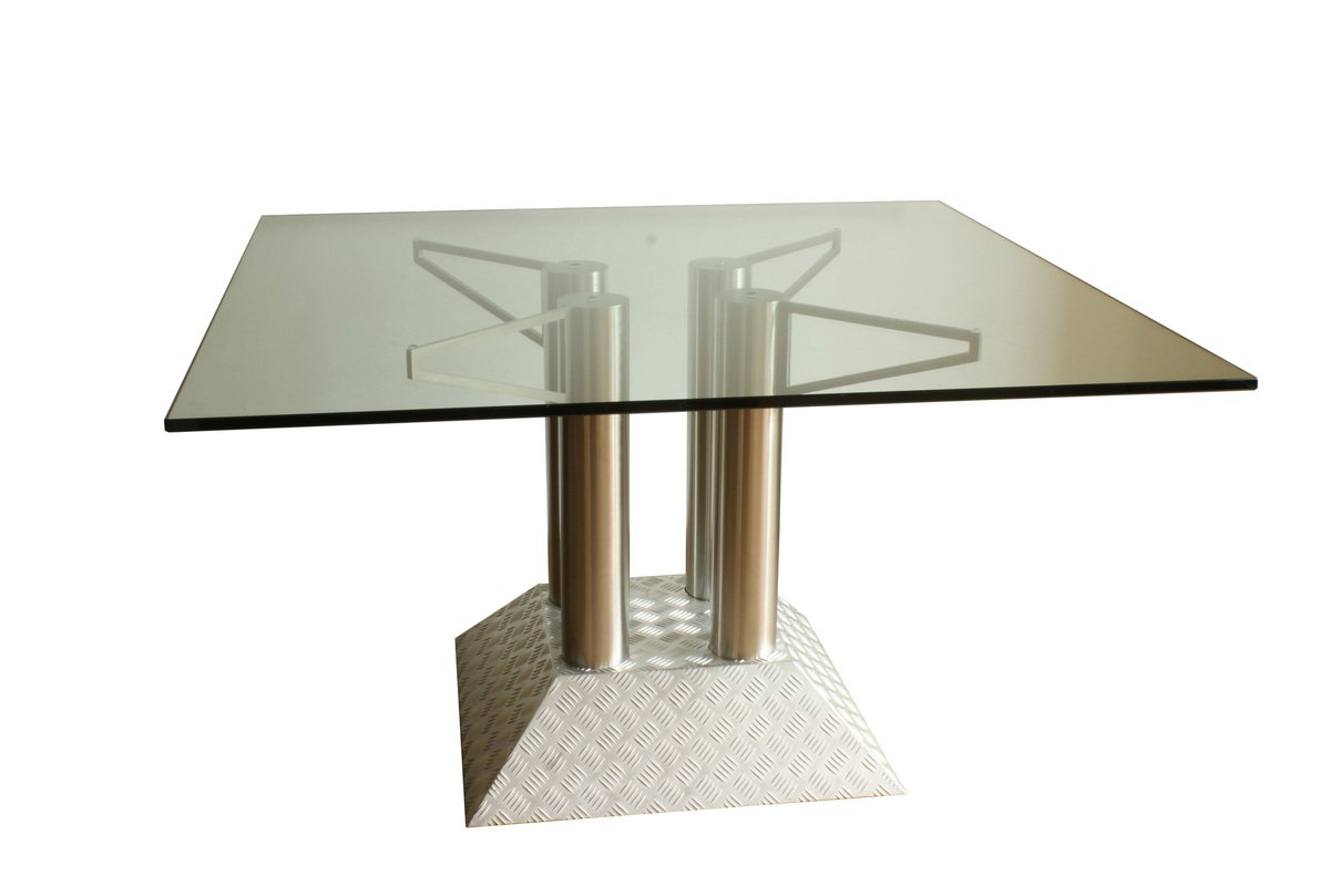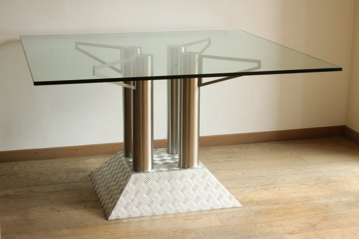 Mesa posmoderna industrial con tubos de acero inoxidable y cuadros Diamond Checker con tablero de vidrio, años 90