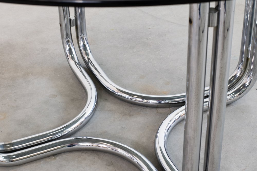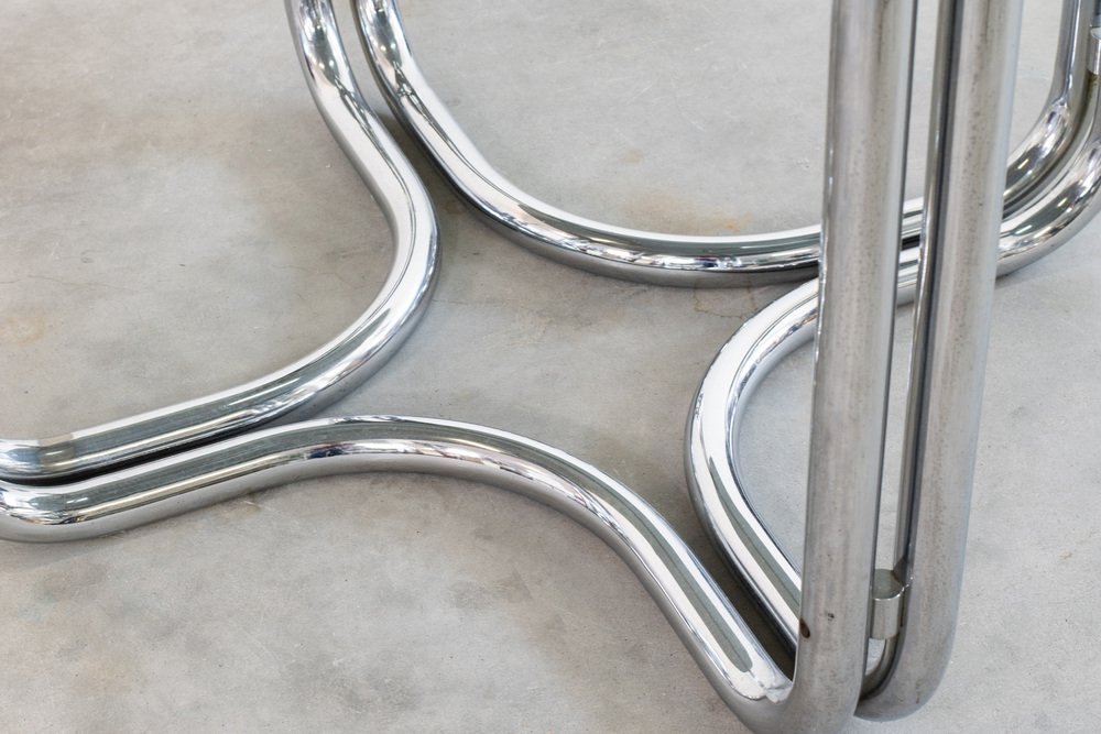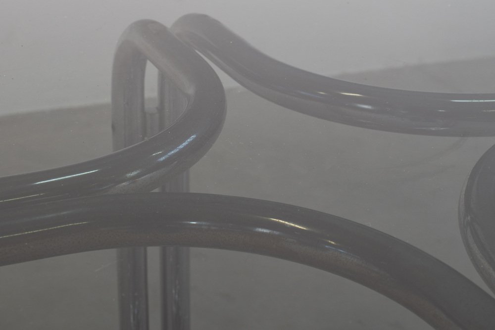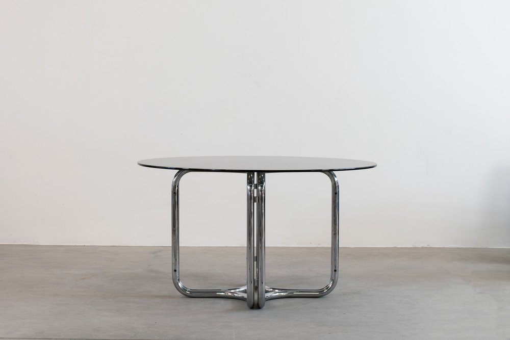 Mesa redonda con base de acero y tablero de vidrio de Giotto Stoppino, años 70