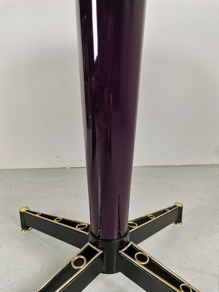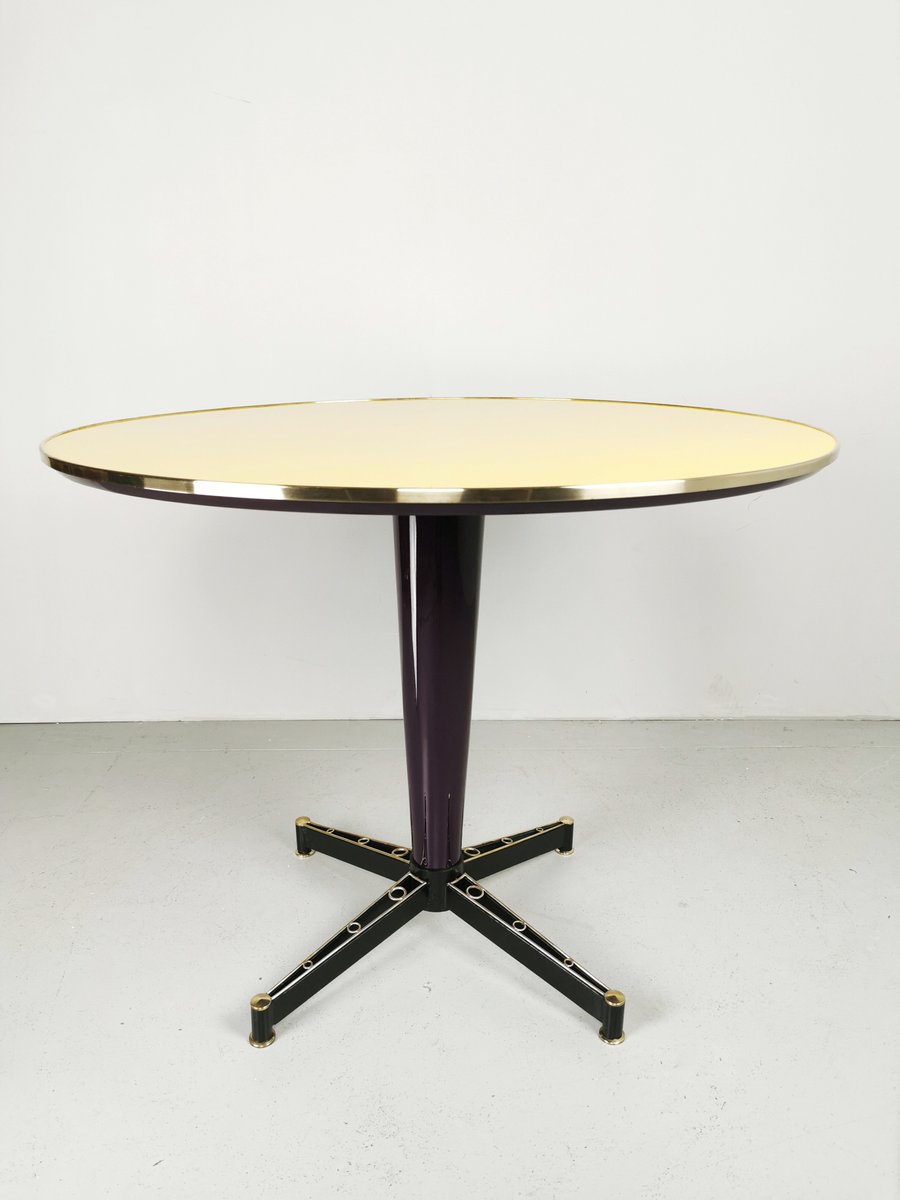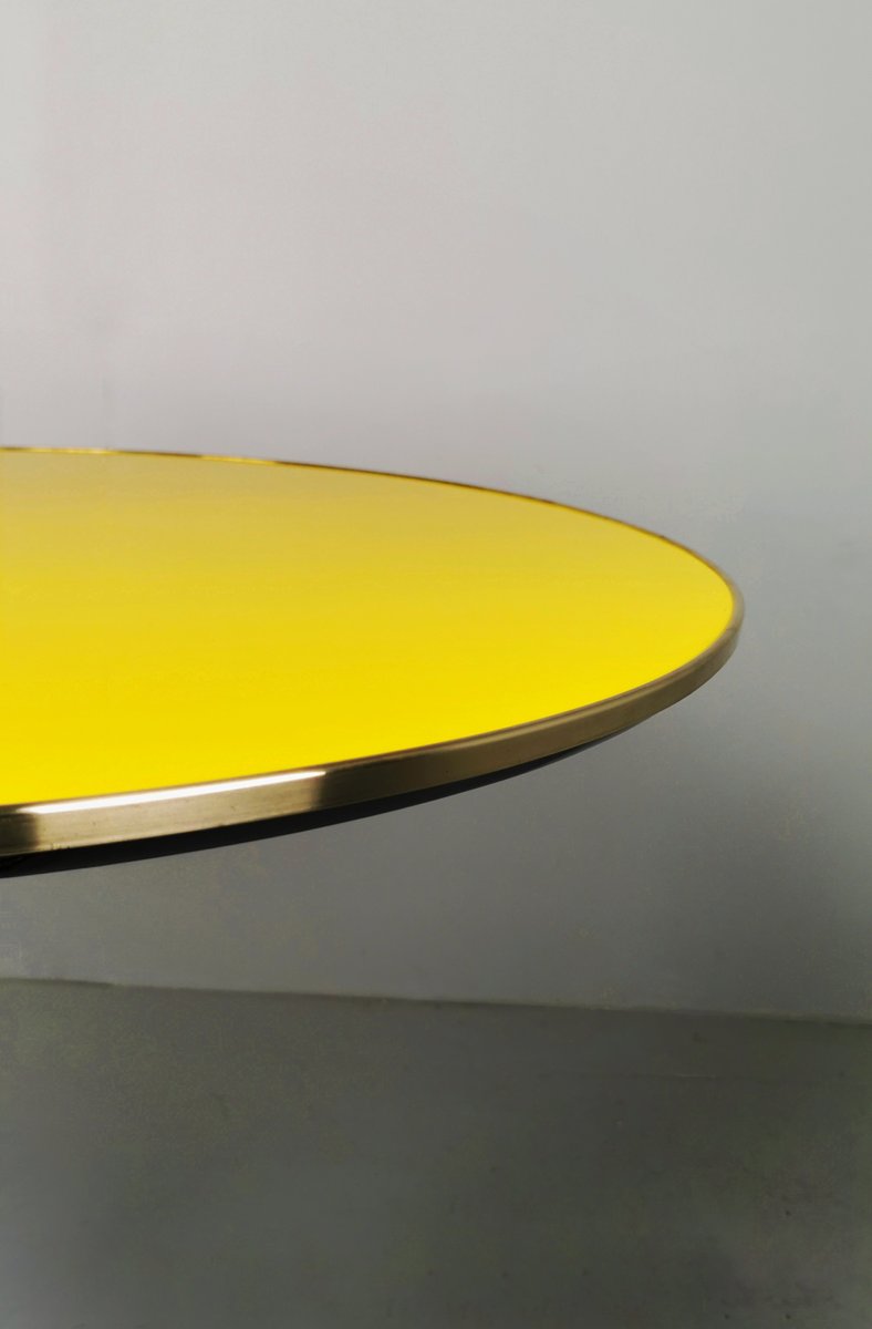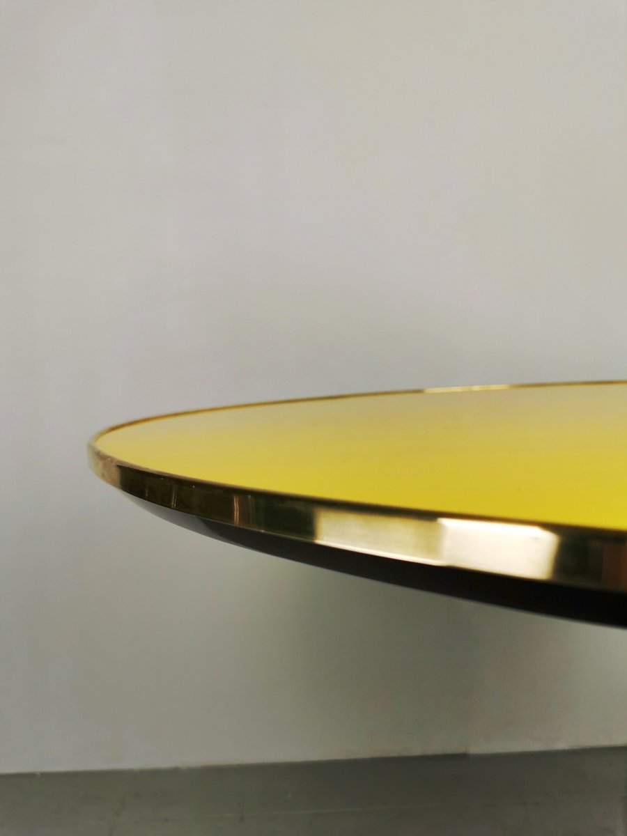Mesa redonda lacada en amarillo con borde de latón, años 50