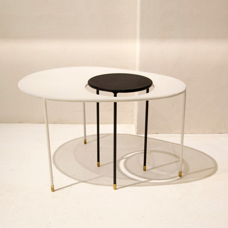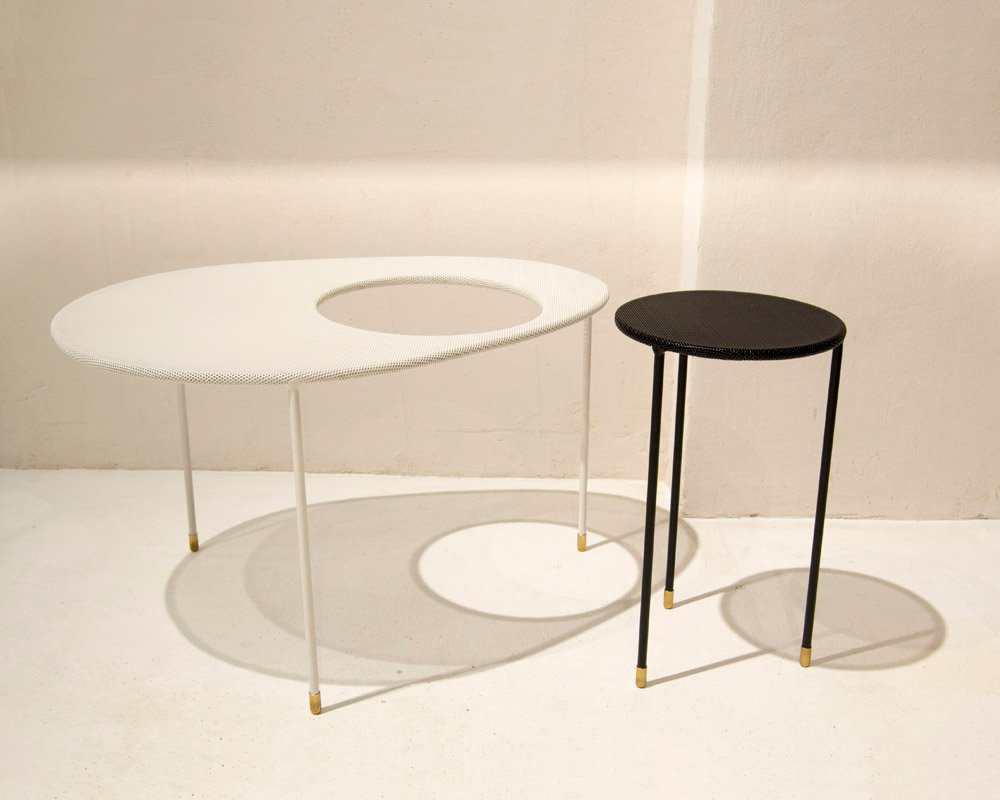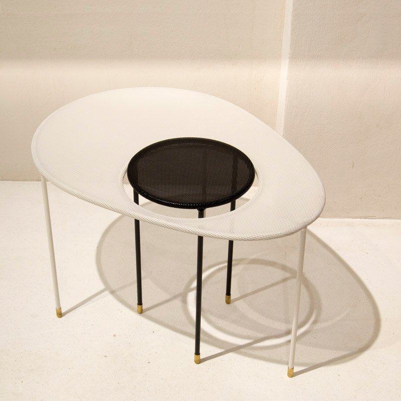 After the war, Matégot established Parisian workshop, dedicated to experimental, handcrafted furniture and objects. His designs explored a variety of materials, like metal, glass, Formica, woods, textiles, and leather. His most successful designs incorporated metal tubing and perforated sheet metal, with a technique he patented and named Rigitulle in 1952. He developed a machine that could bend and fold sheet metal like a piece of fabric, which was used to create a number of distinctive designs, such as the Java Table Lamp, Soumba Tables, Bagdad Lamp, Satellite Pendants, and Nagasaki Chairs. After few years, Matégot opened a second workshop, called Société Matégot, in Casablanca, where he was able to broaden his production to include small