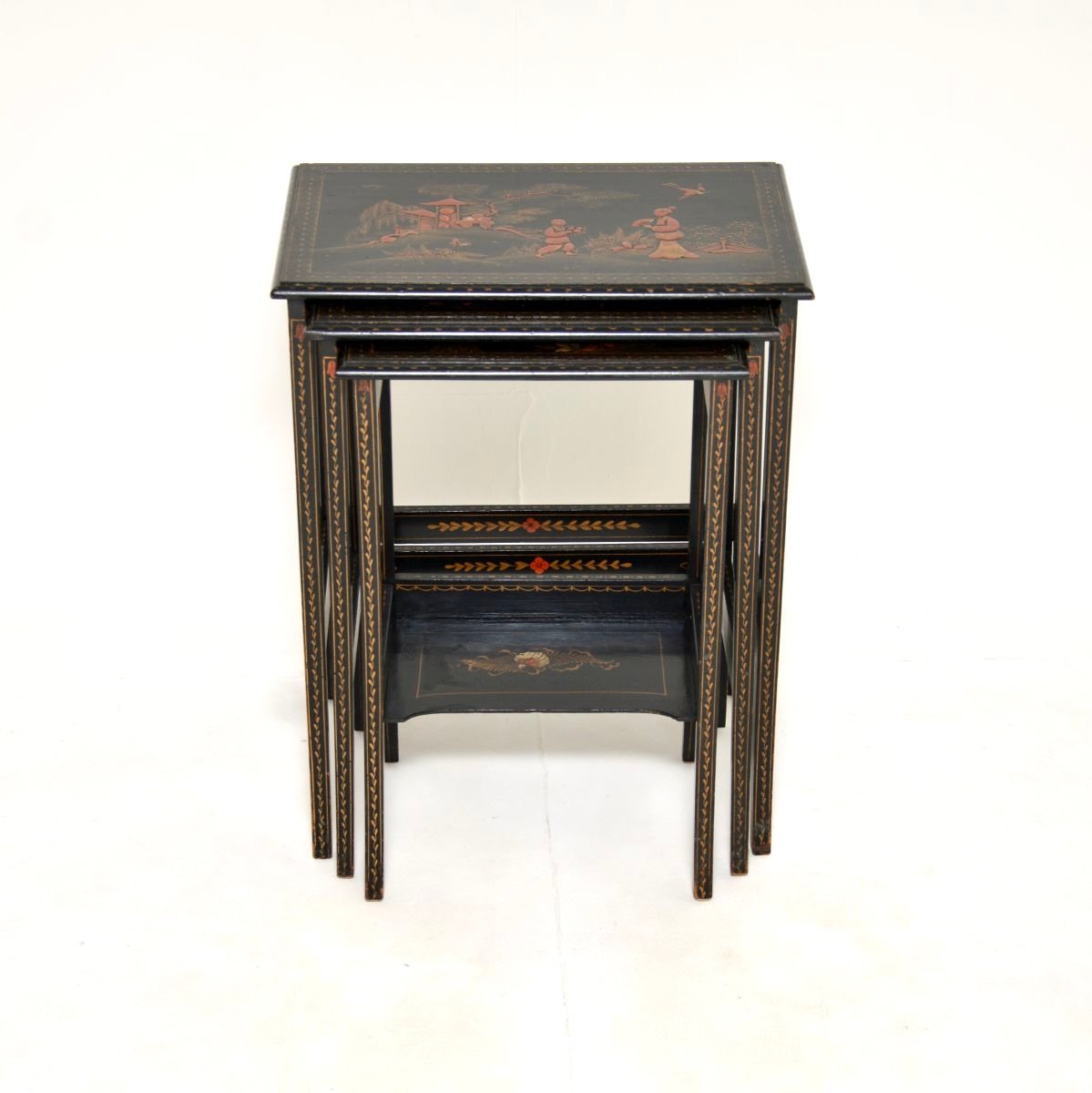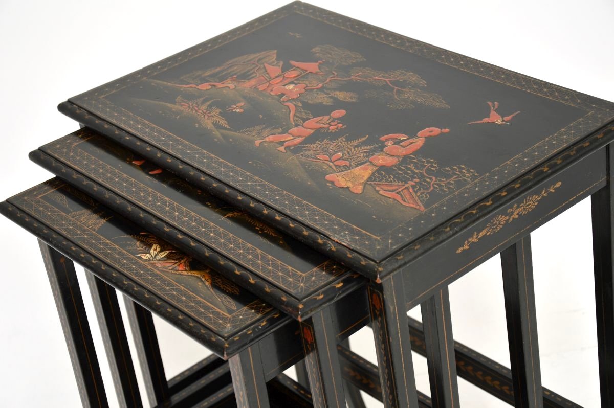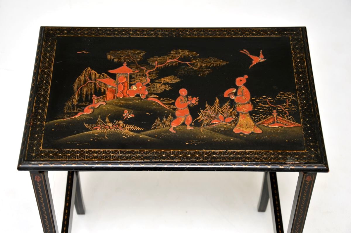 A beautiful antique Edwardian lacquered chinoiserie nest of tables. They were made in England in the oriental style, they date from around 1900-1920.