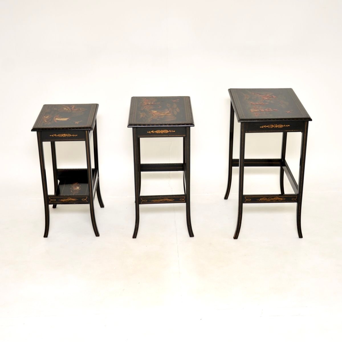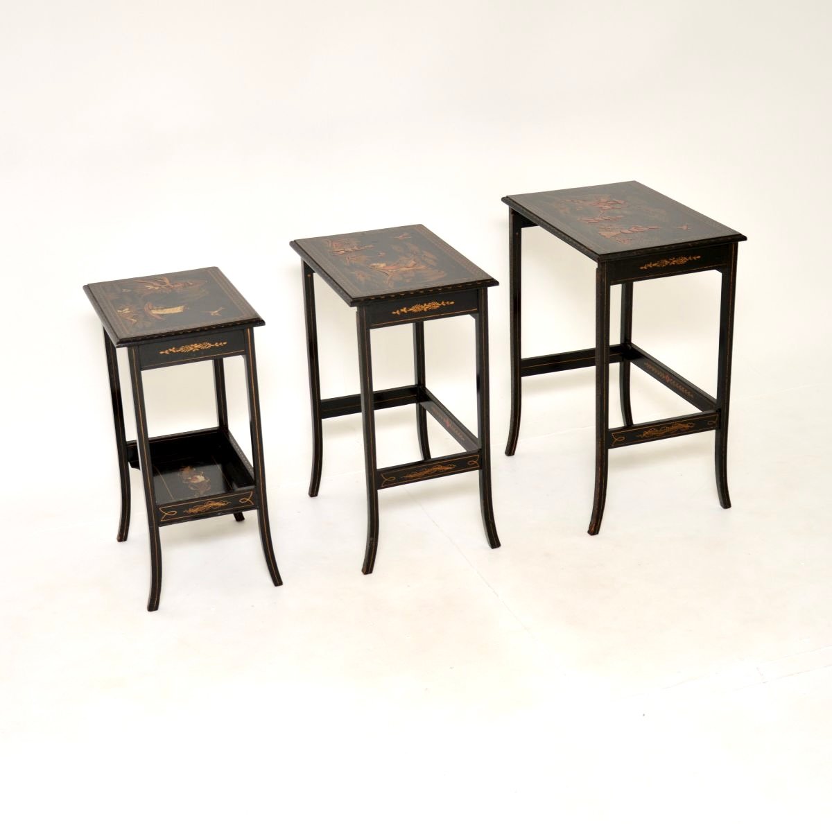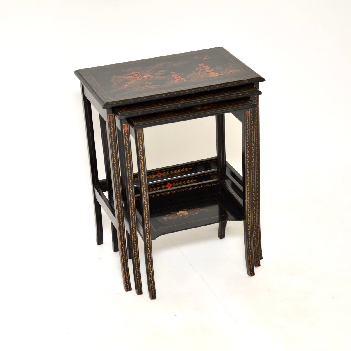 A beautiful antique Edwardian lacquered chinoiserie nest of tables. They were made in England in the oriental style, they date from around 1900-1920.