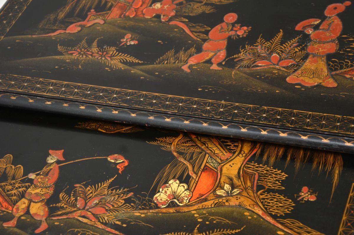 The condition is very good for their age, they are clean and structurally sound. There is just some surface wear and rubbing to the lacquered decorations, mostly on the top table and seen in the images.