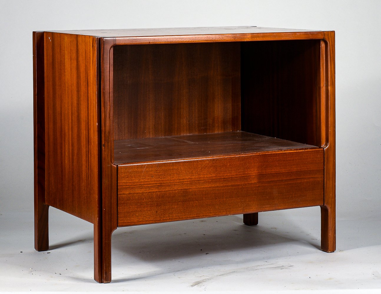 Mesita de noche vintage de madera con cajón y compartimento abierto de Stilwood