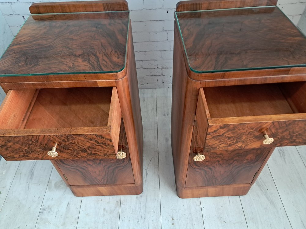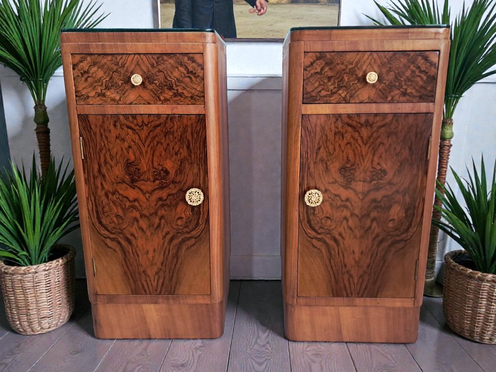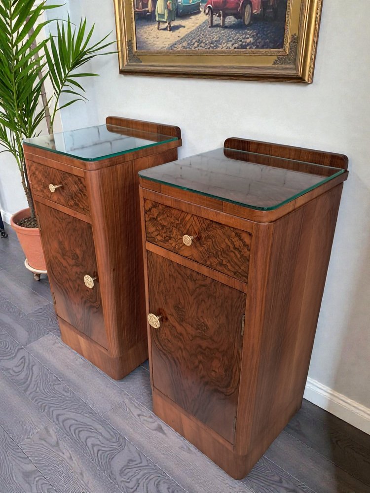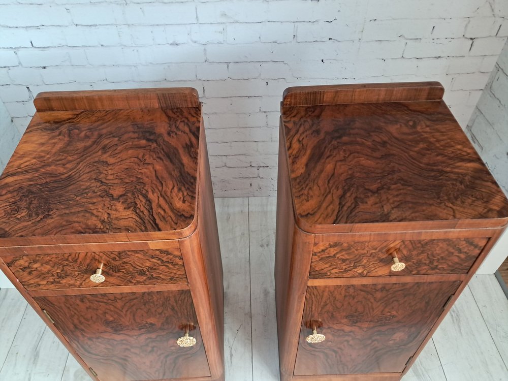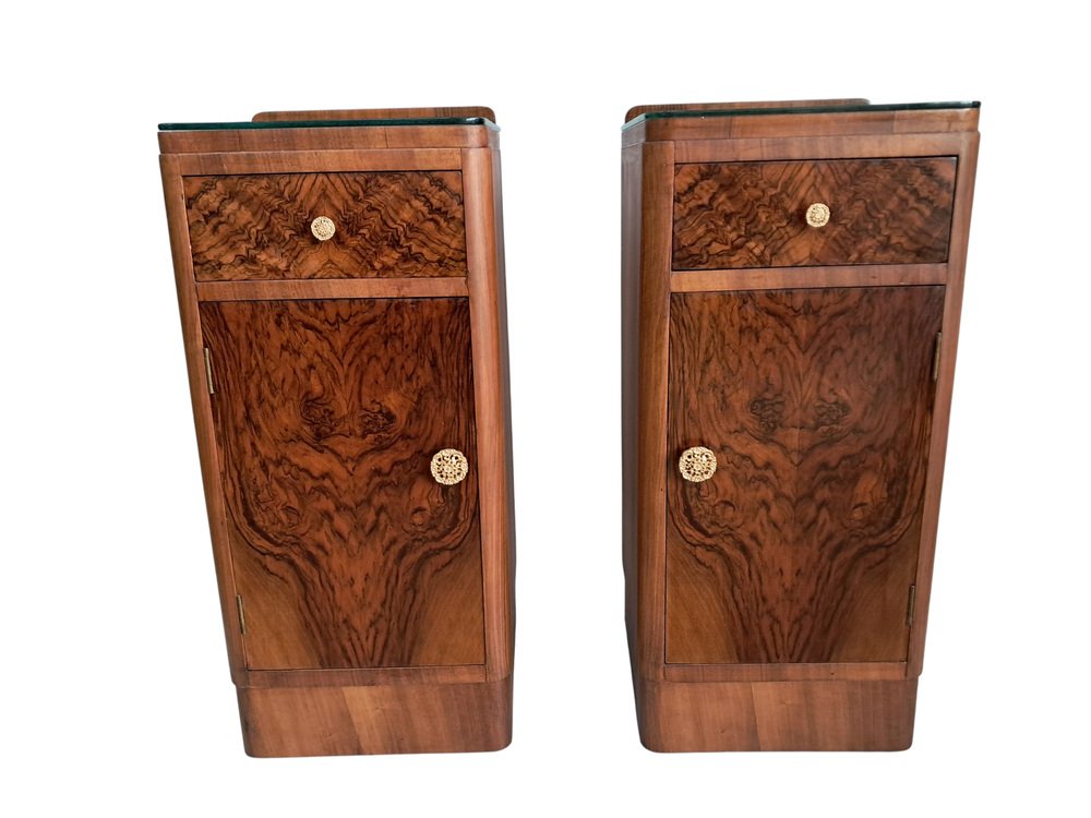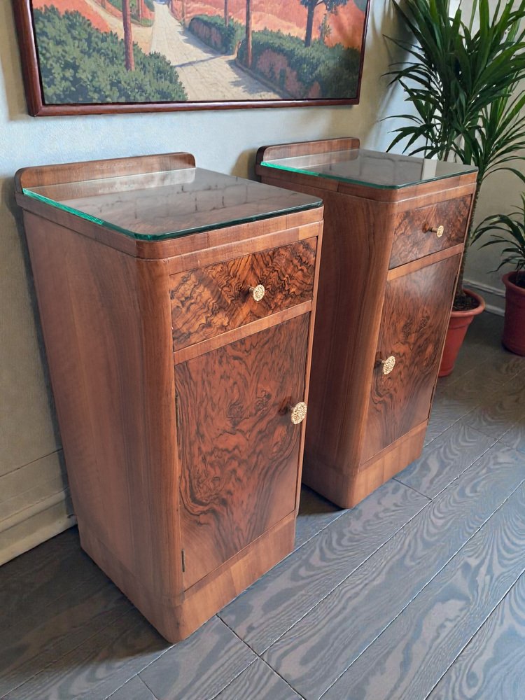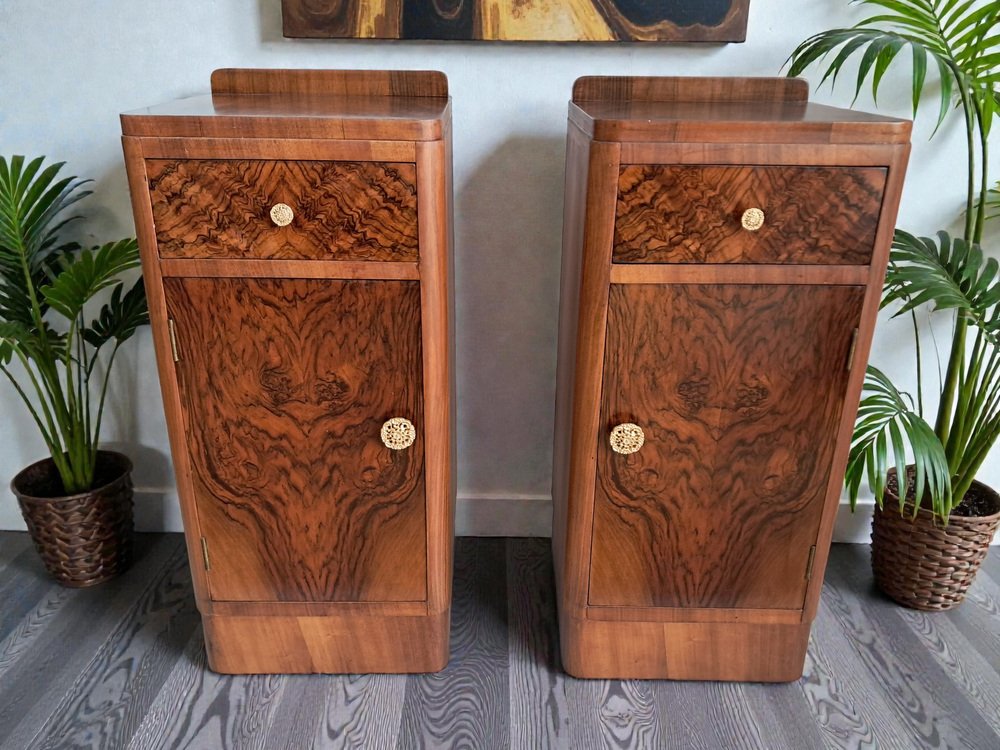 Este excepcional y cada vez más escaso par de mesitas de noche originales Art Déco de la década de 1930 captura a la perfección la elegancia y la artesanía de la época. Como se muestra, las mesitas cuentan con un hermoso revestimiento de chapa de nogal con nudos tanto en los frentes de los cajones como en las puertas de los armarios, creando unos dramáticos y simétricos patrones de vetas que llaman inmediatamente la atención. Los ricos tonos del nogal se complementan con la forma aerodinámica Art Déco: fíjese en las esquinas frontales suavemente redondeadas y la sutil base del zócalo, ambas características de la estética refinada y aerodinámica de la época. Cada mesita incluye: Un cajón superior con un llamativo frente de nogal y un pomo decorativo en tono dorado.