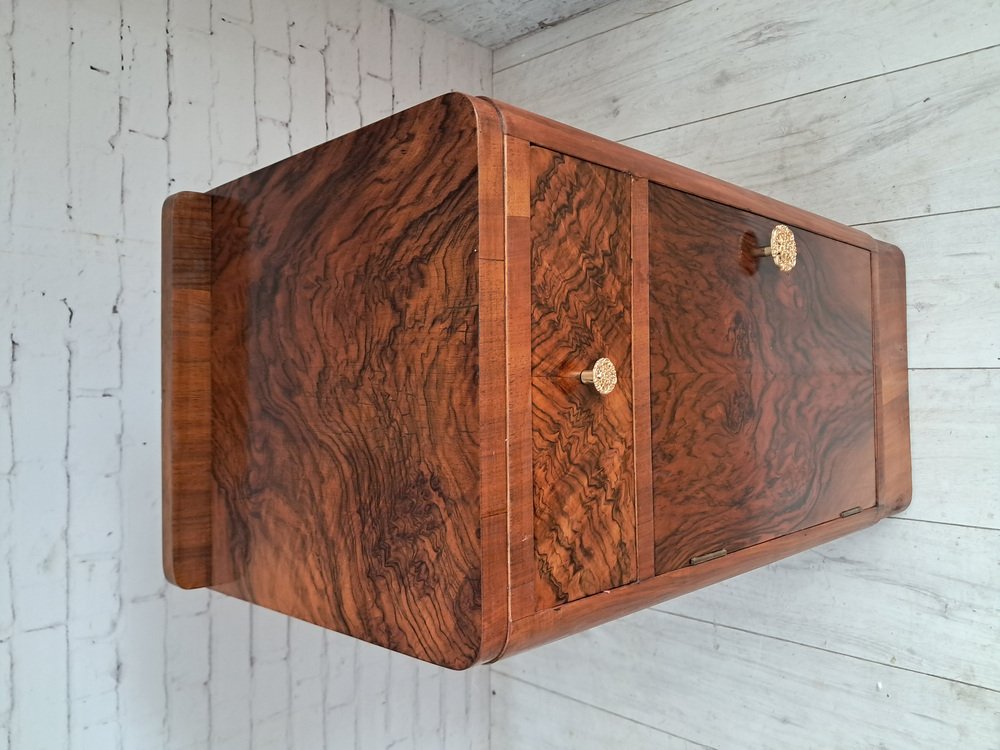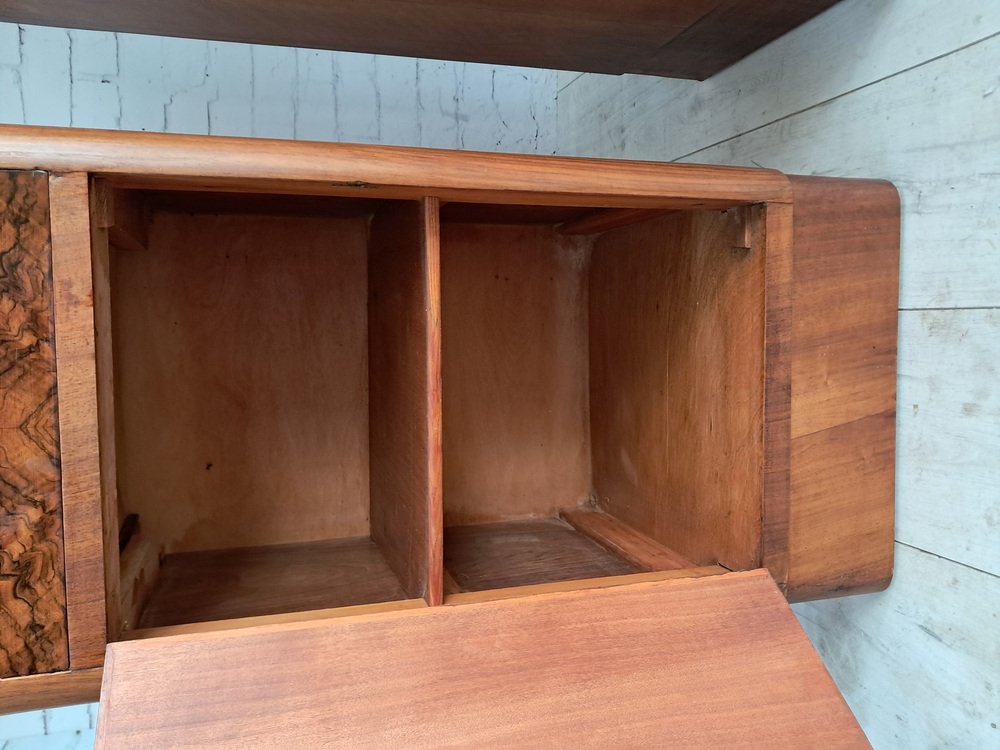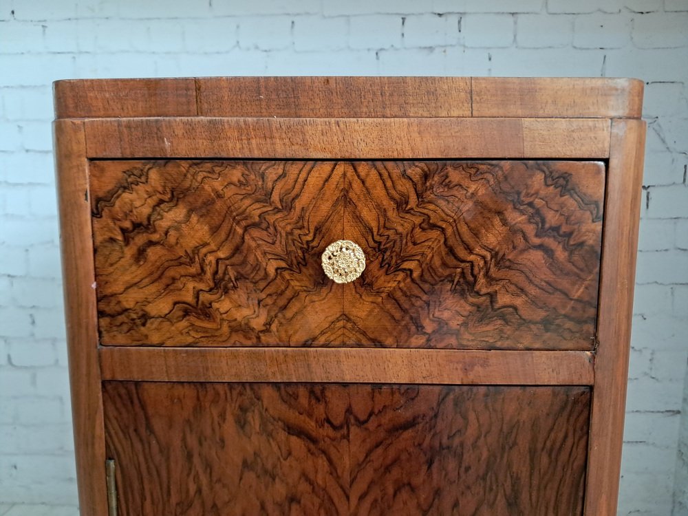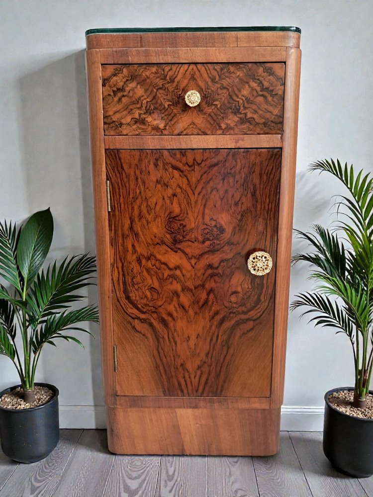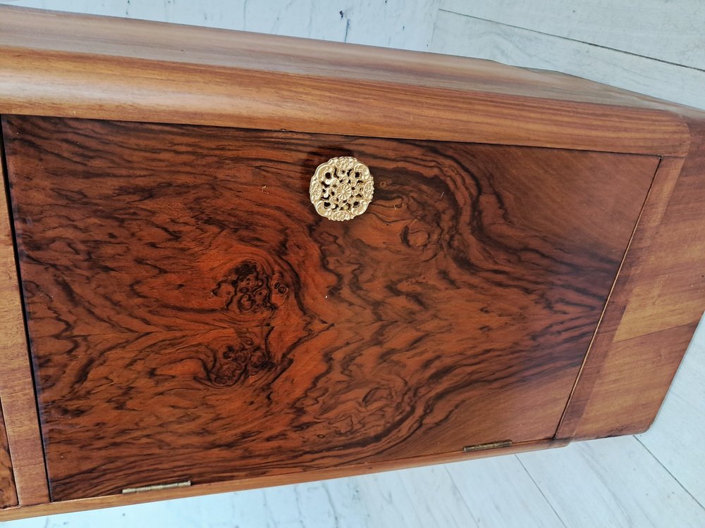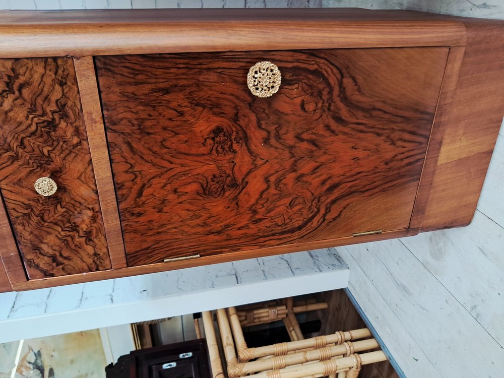 As shown, the cabinets feature a beautifully figured burr walnut veneer to both the drawer fronts and cupboard doors, creating dramatic, symmetrical grain patterns that immediately draw the eye. The rich walnut tones are complemented by the streamlined Art Deco form — note the gently rounded front corners and subtle plinth base, both characteristic of the era’s refined, aerodynamic aesthetic.