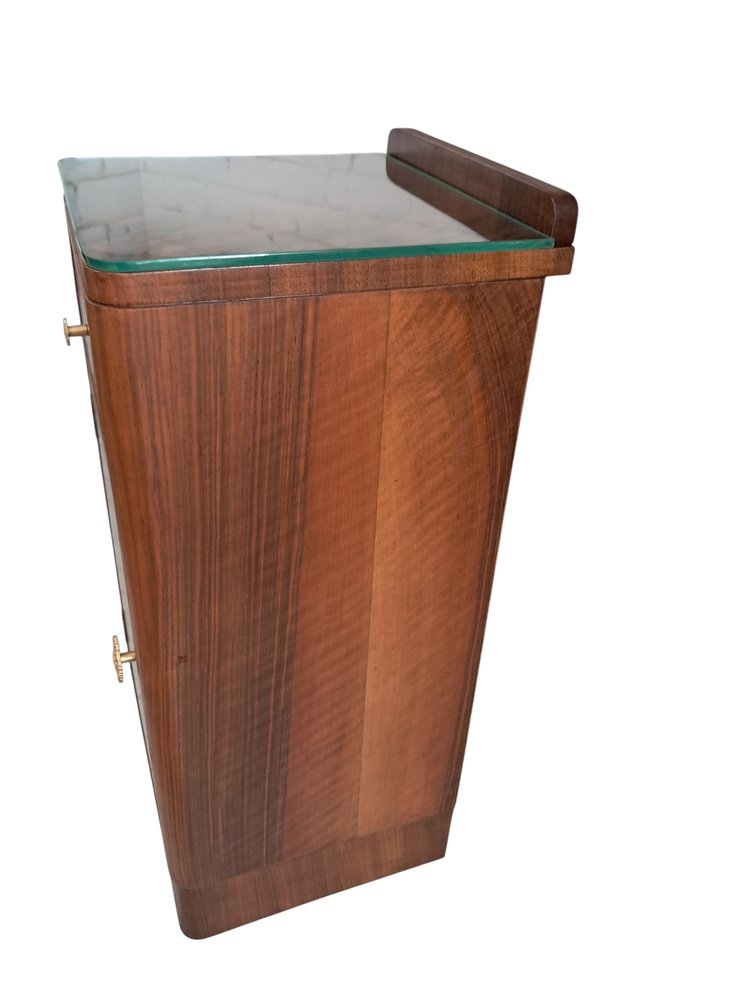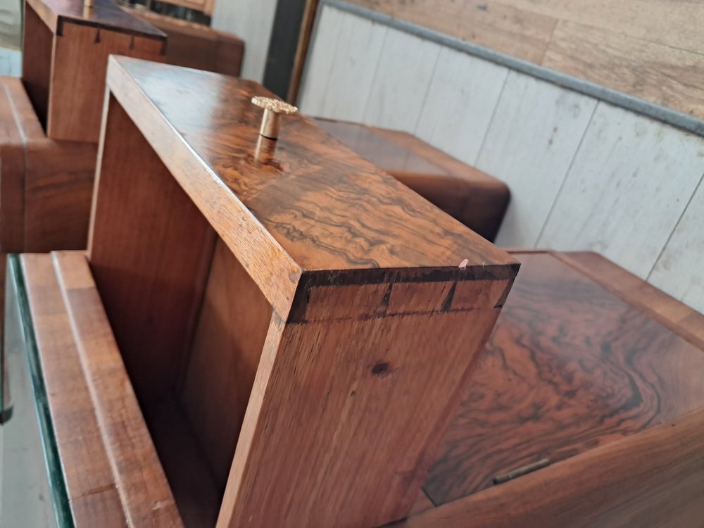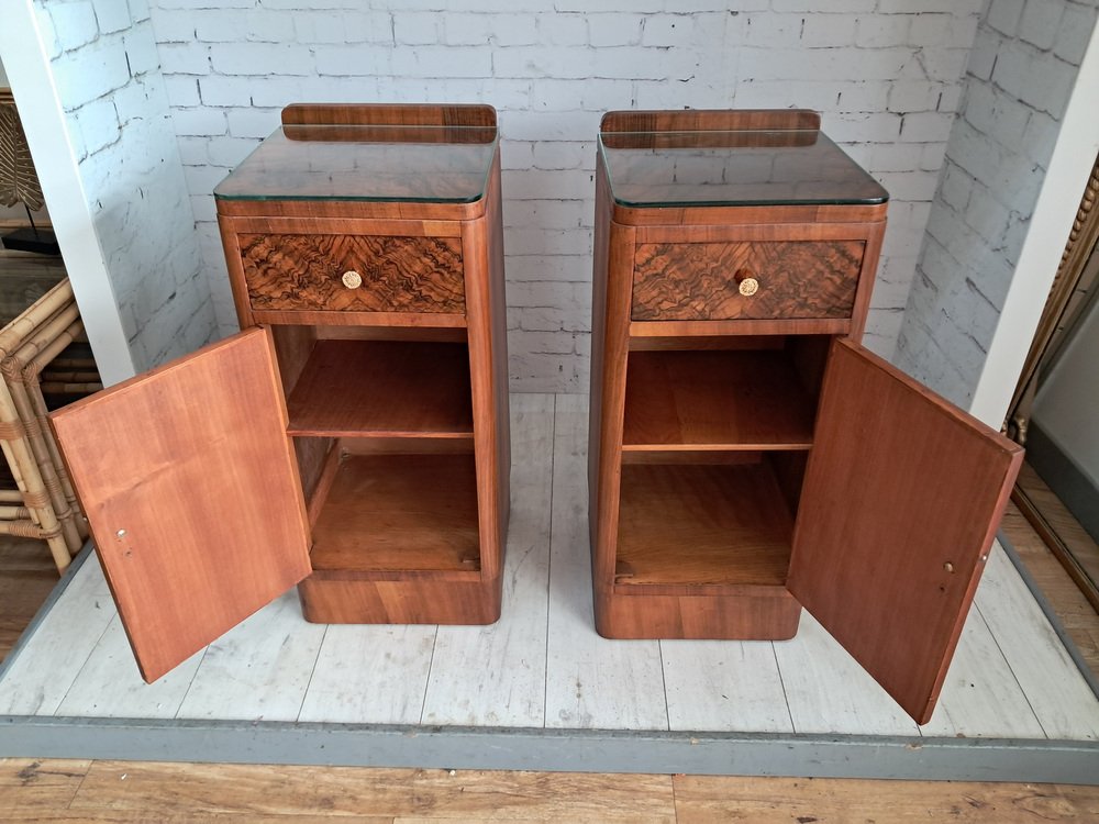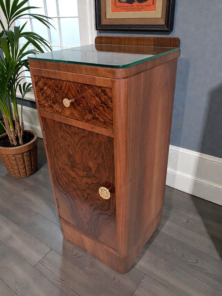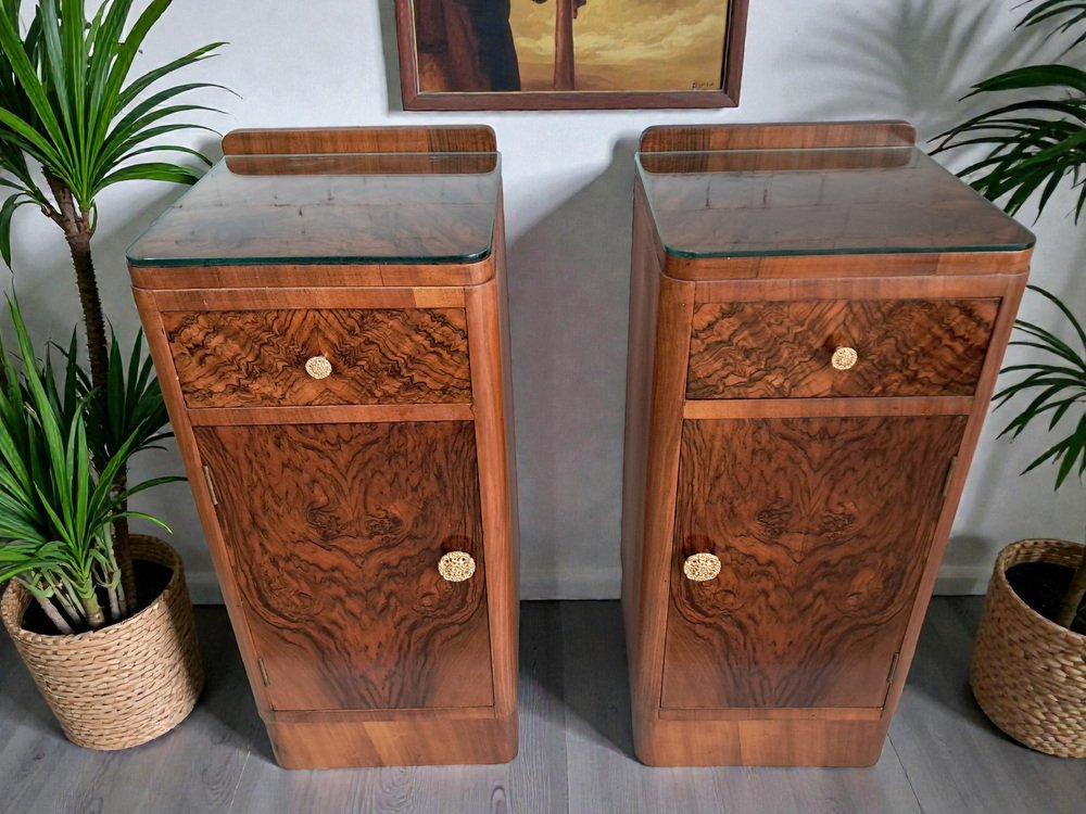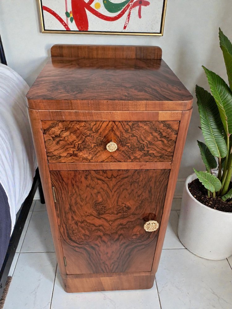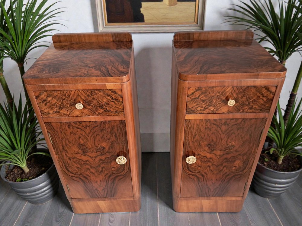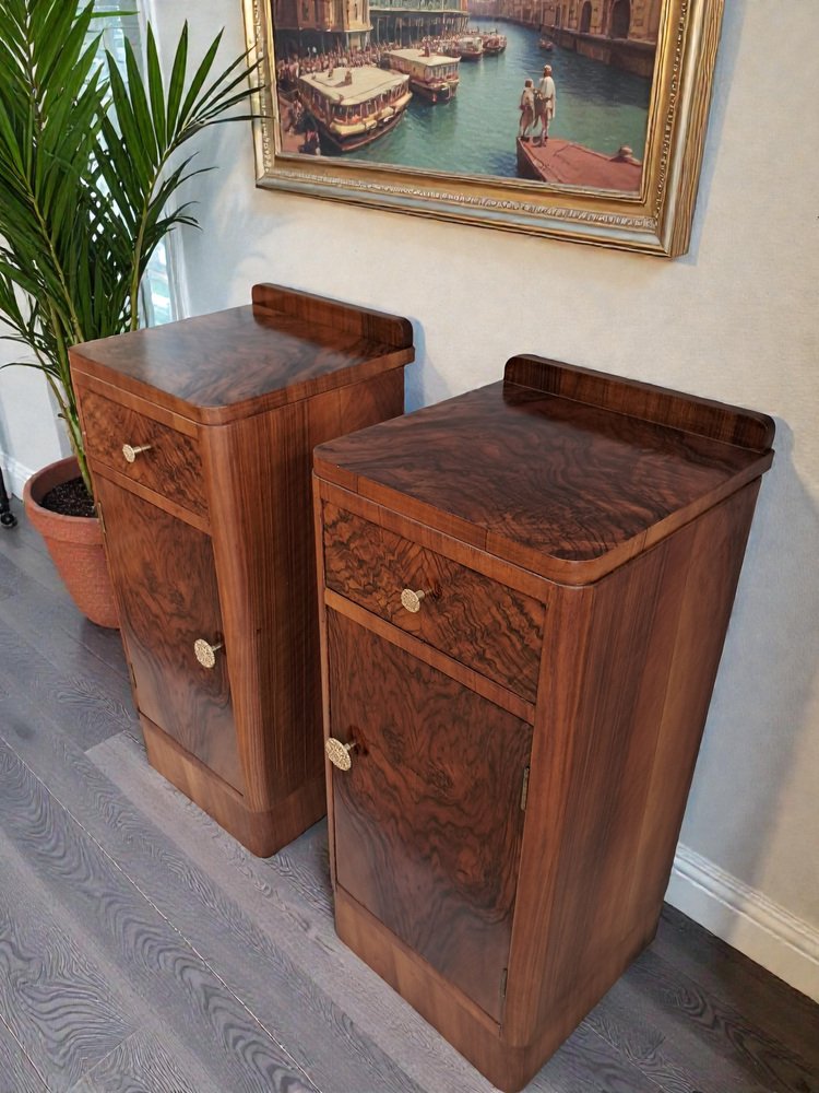 These bedside cabinets combine functionality with unmistakable 1930s glamour. Their condition is superb, the veneers vibrant and well-preserved, and the overall presentation crisp and elegant.