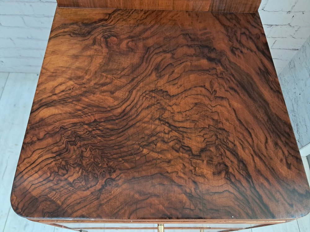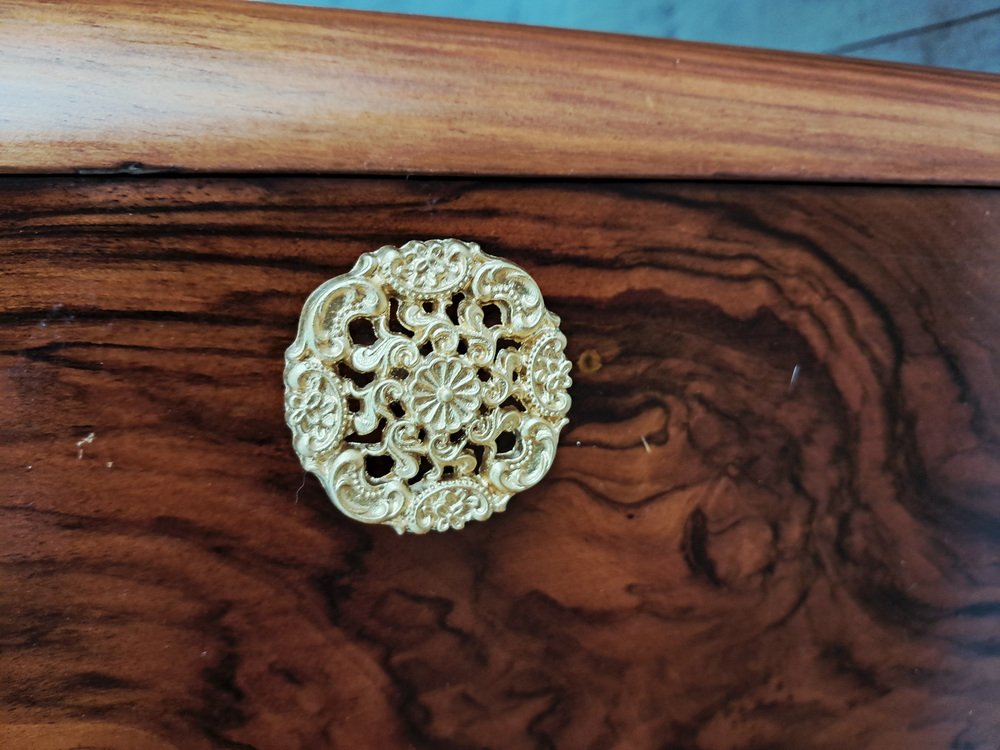 A top drawer with striking burr walnut frontage and a decorative gold-tone knob.