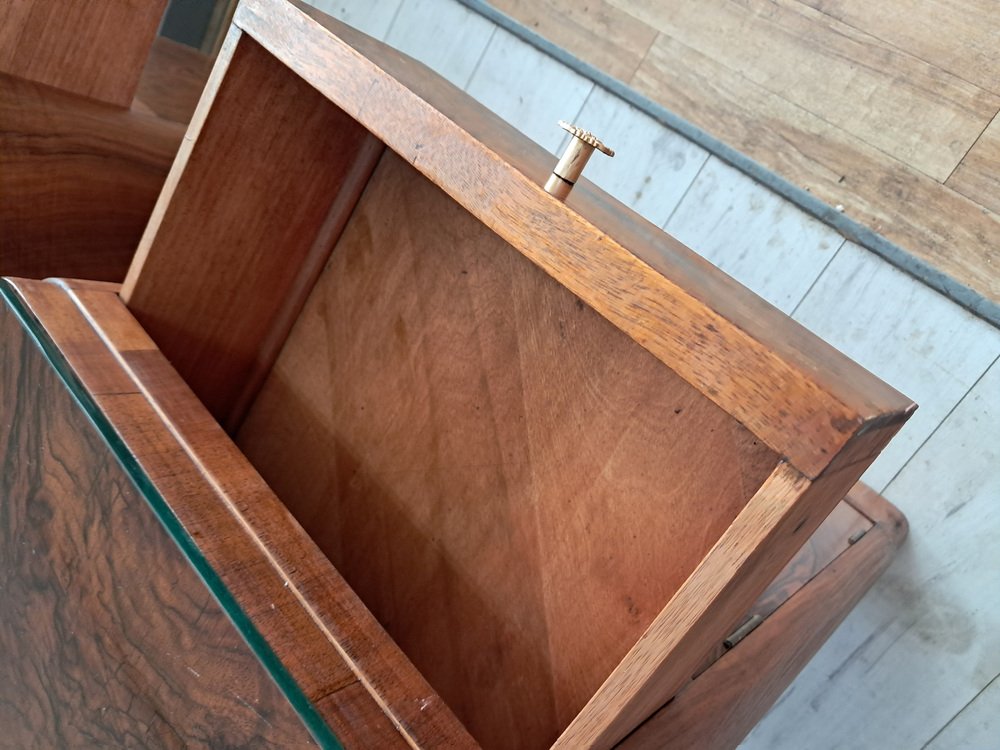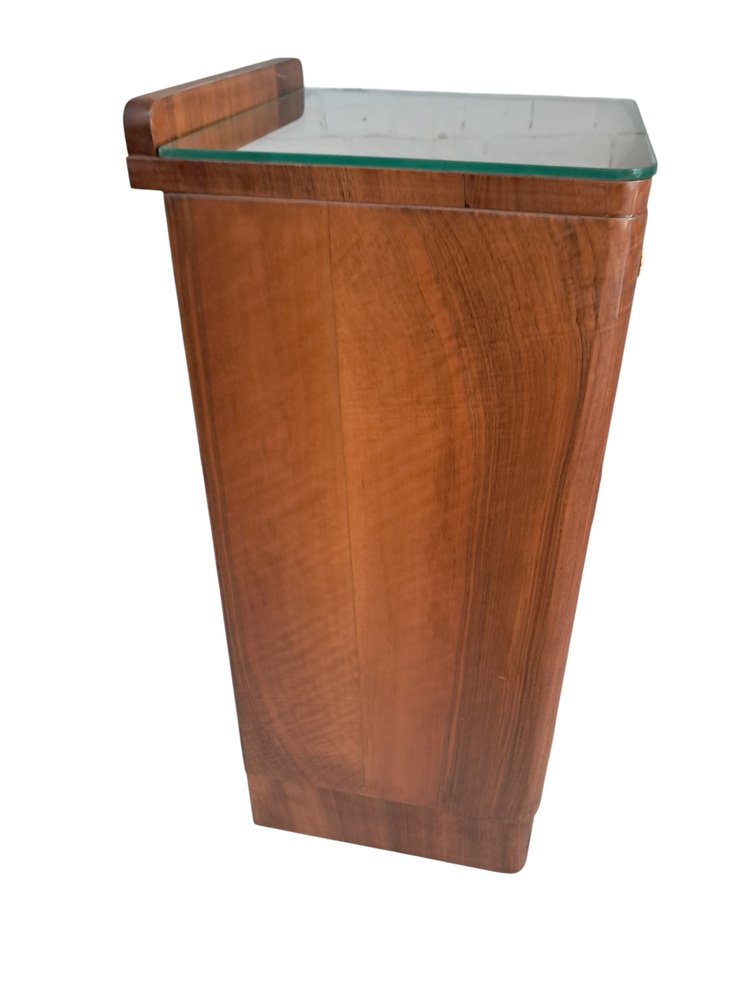 Medidas: Altura total: 80 cm Altura hasta la superficie de la mesa: 77,5 cm Anchura: 35 cm Profundidad: 35,5 cm Una oportunidad única para adquirir un auténtico par de mesitas de noche Art Déco originales, piezas llamativas que aportan estilo y espacio de almacenamiento práctico.