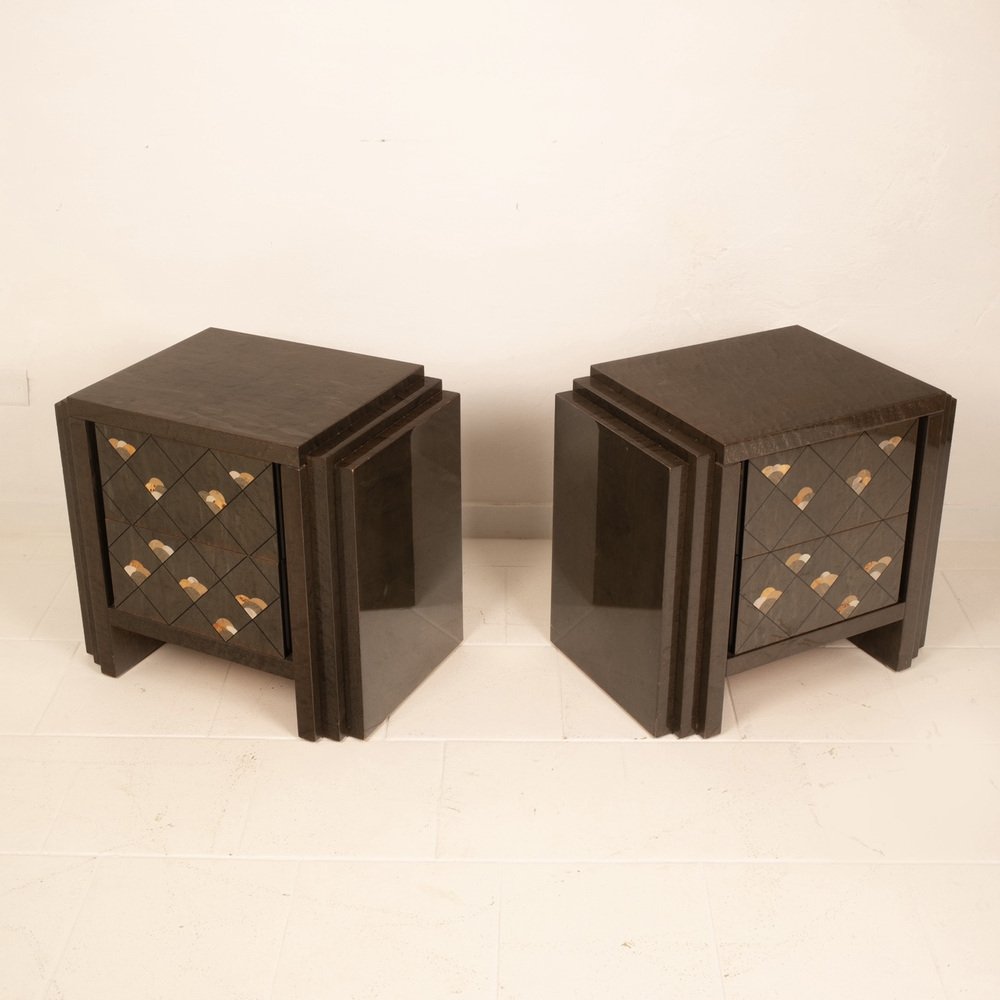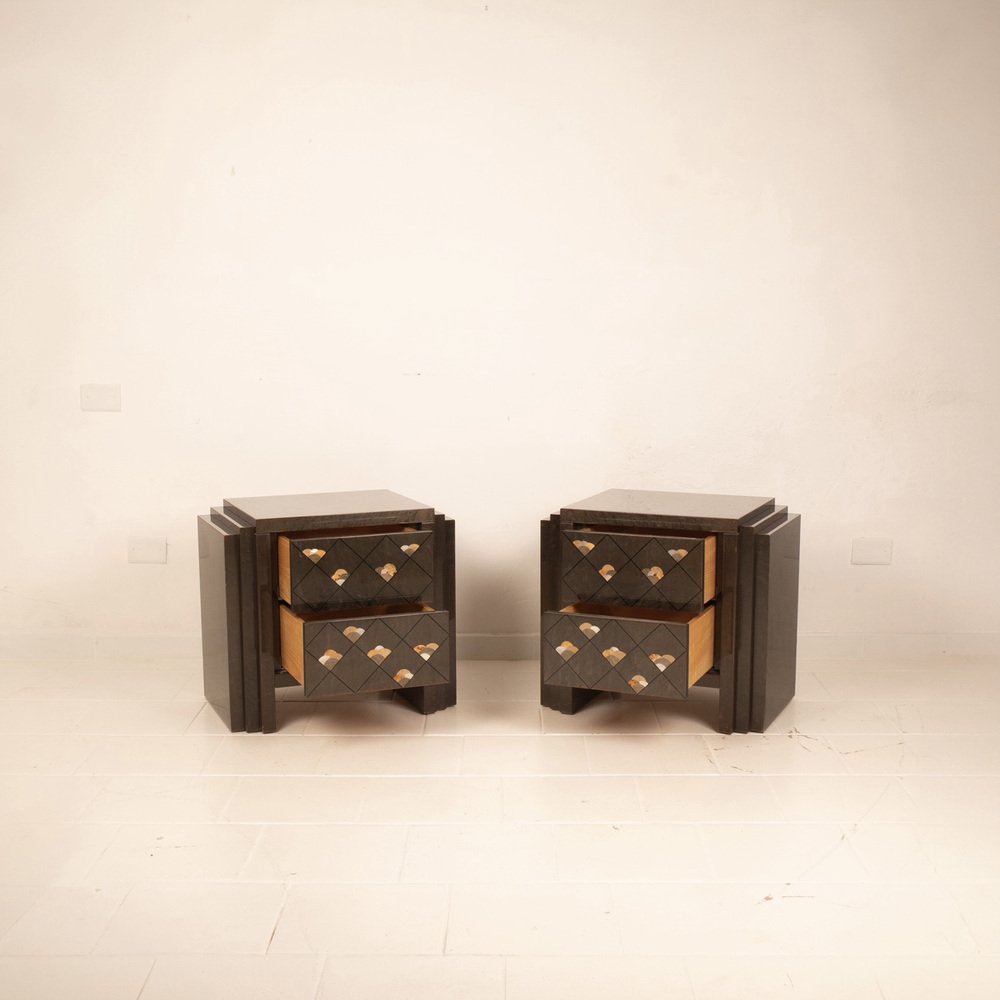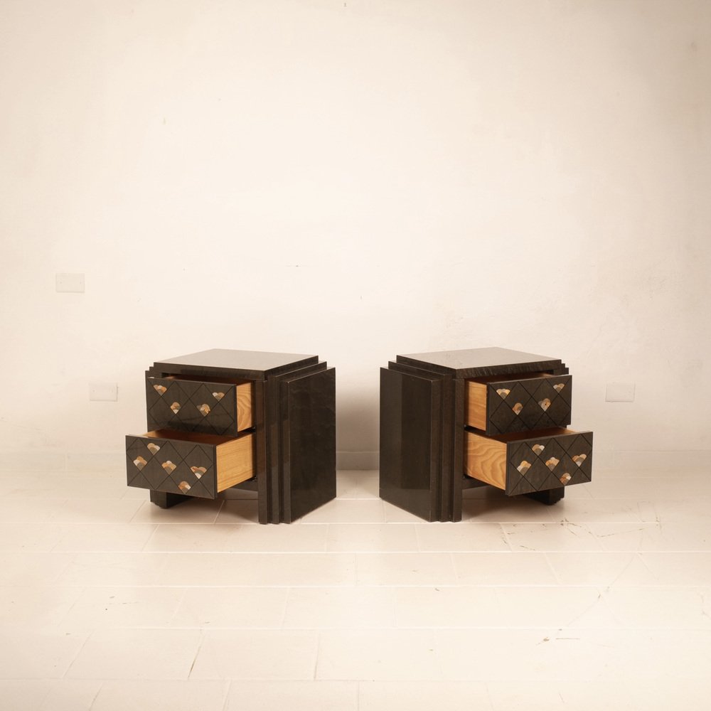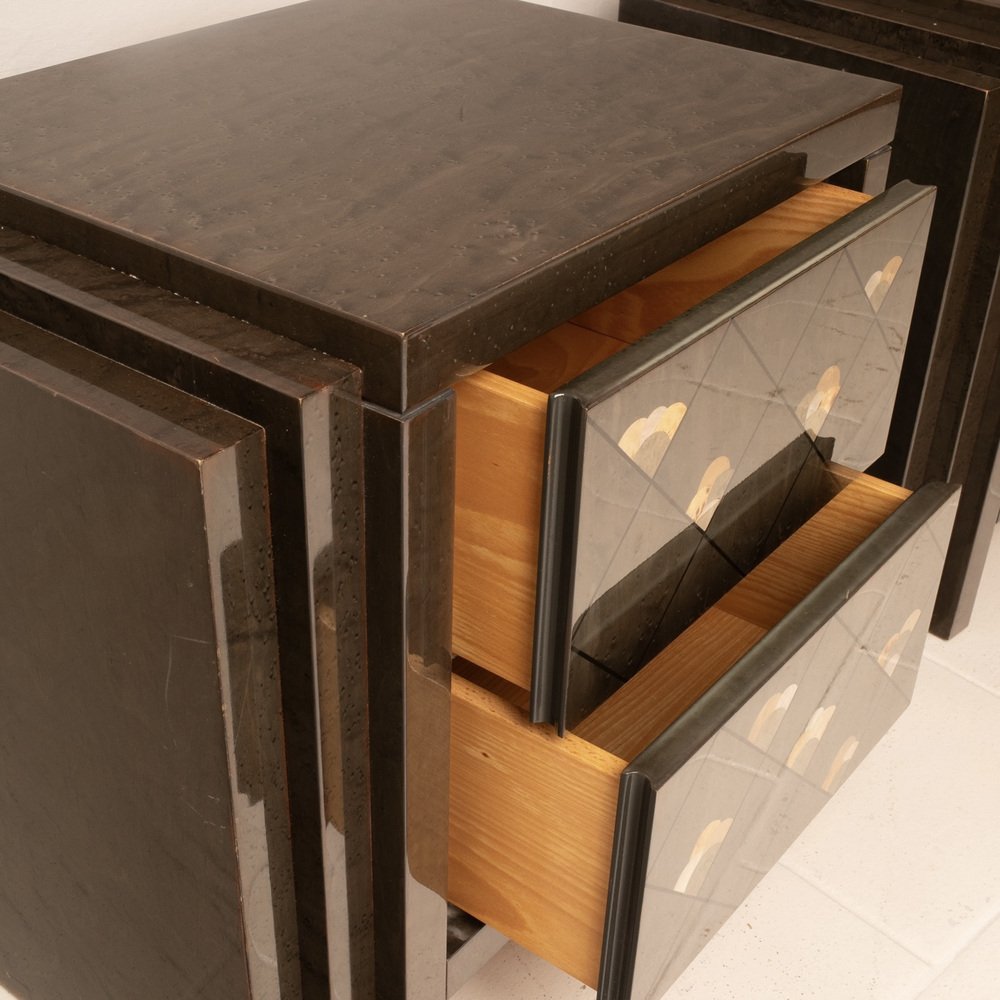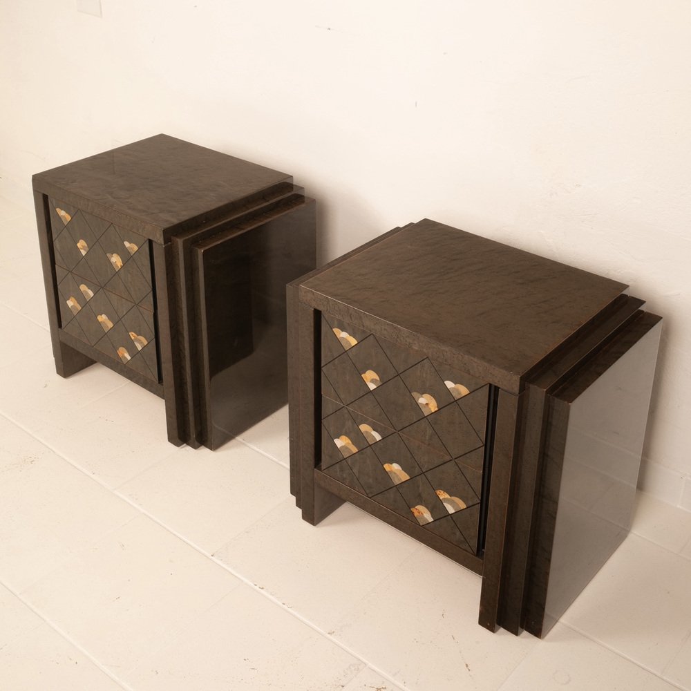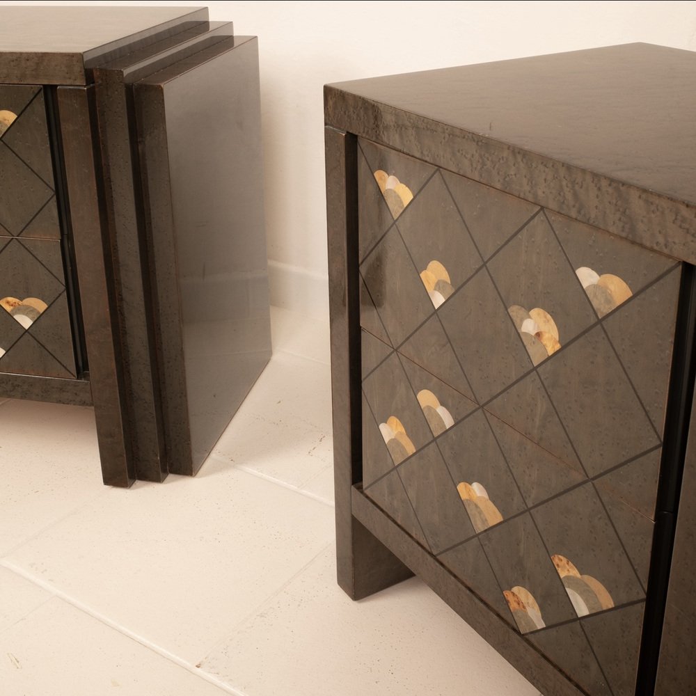 Extraordinario par de mesillas de noche diseñadas por Luciano Frigerio para Frigerio di Desio a principios de la década de 1980.