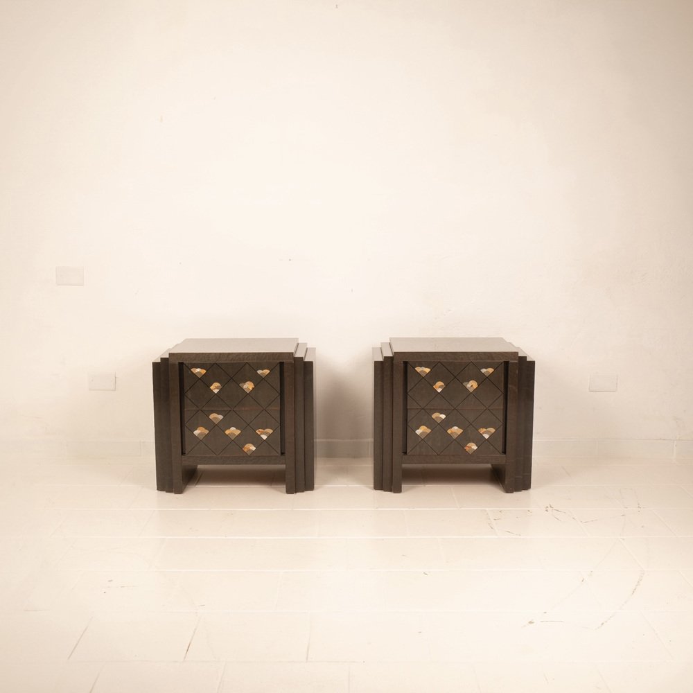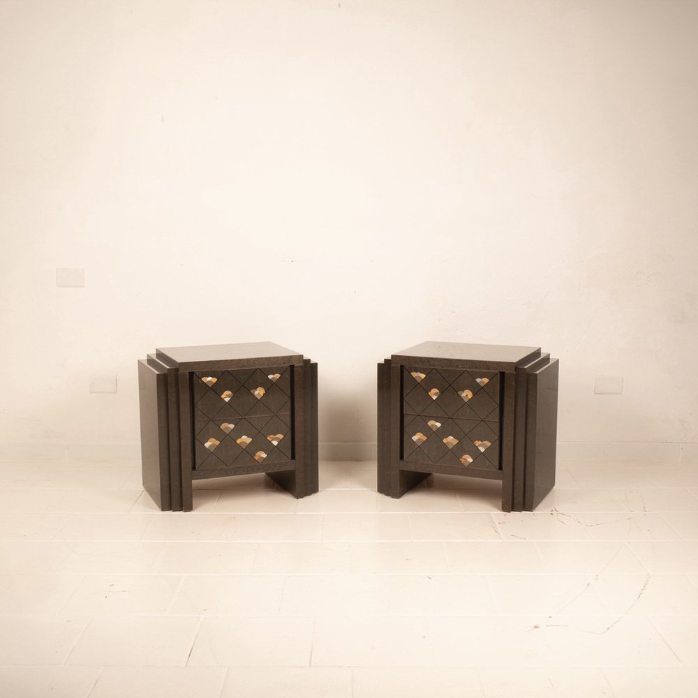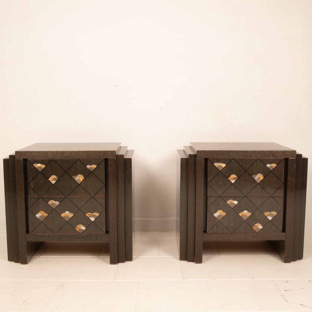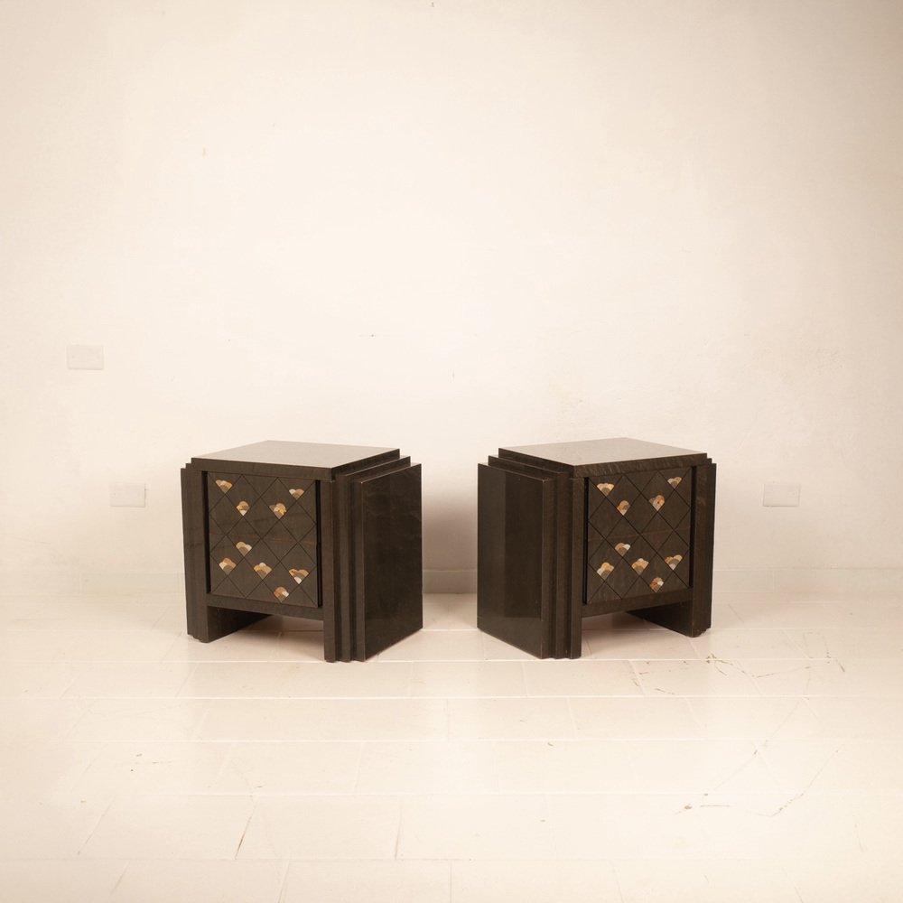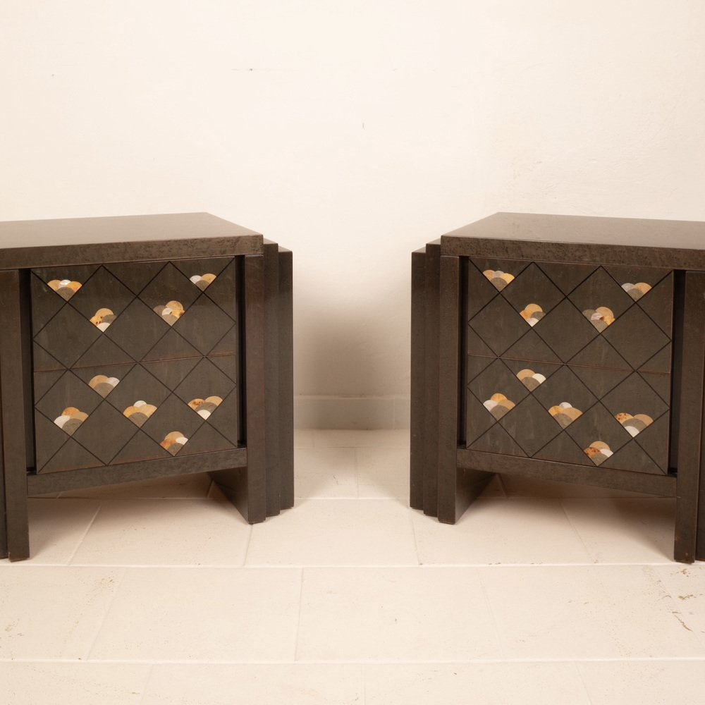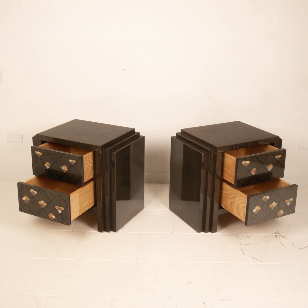 Extraordinario par de mesillas de noche diseñadas por Luciano Frigerio para Frigerio di Desio a principios de la década de 1980.