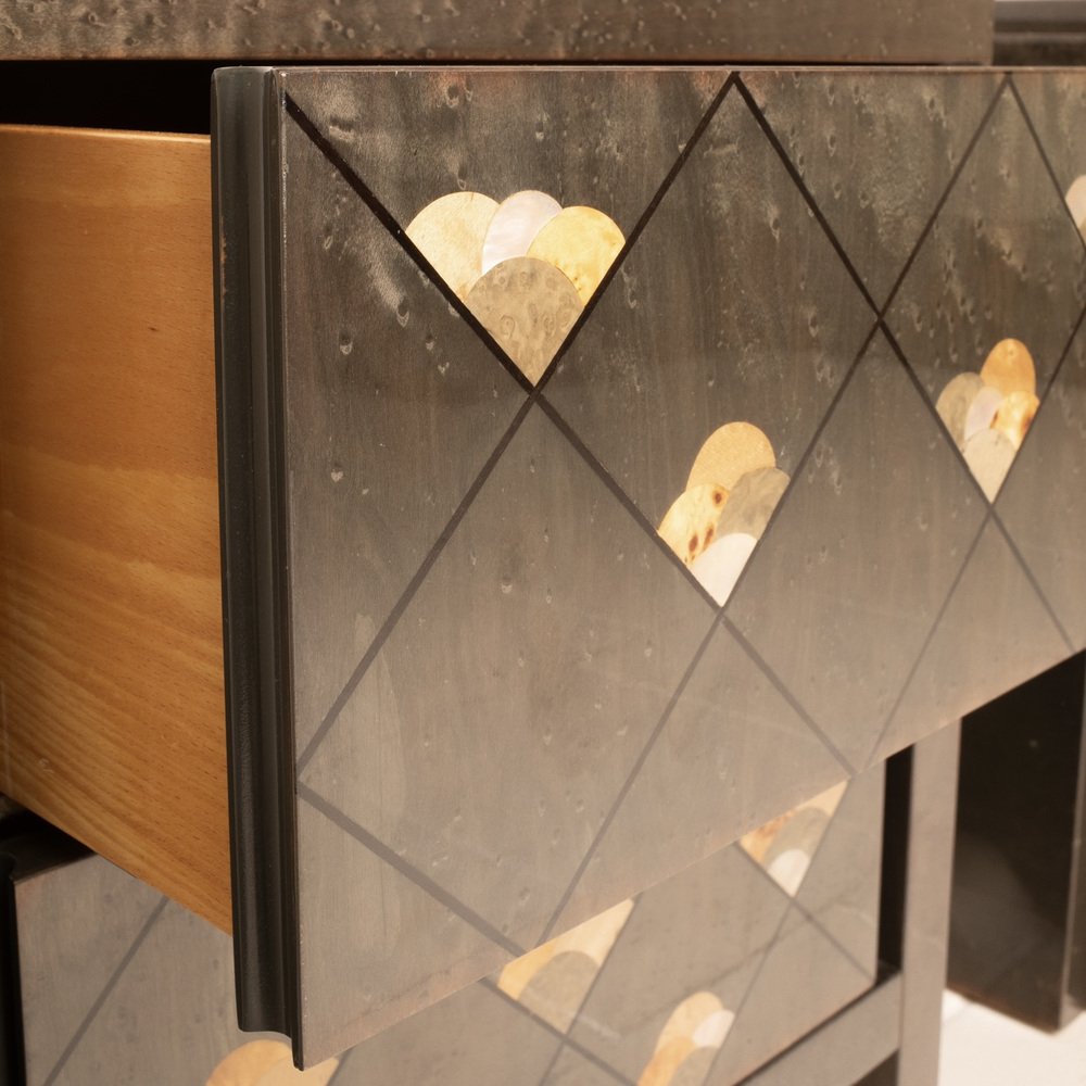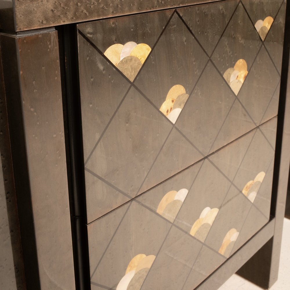 The bedside tables are entitled "moonlight" and are made of very precious maple root, also called partridge's eye, known for its iridescent and luminous nature, brown colored and adorned with a motif of octagonal lines decorated in wooden inlay.