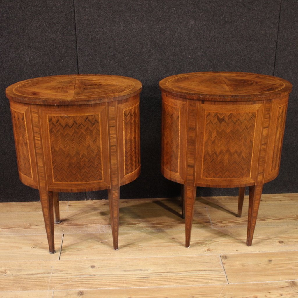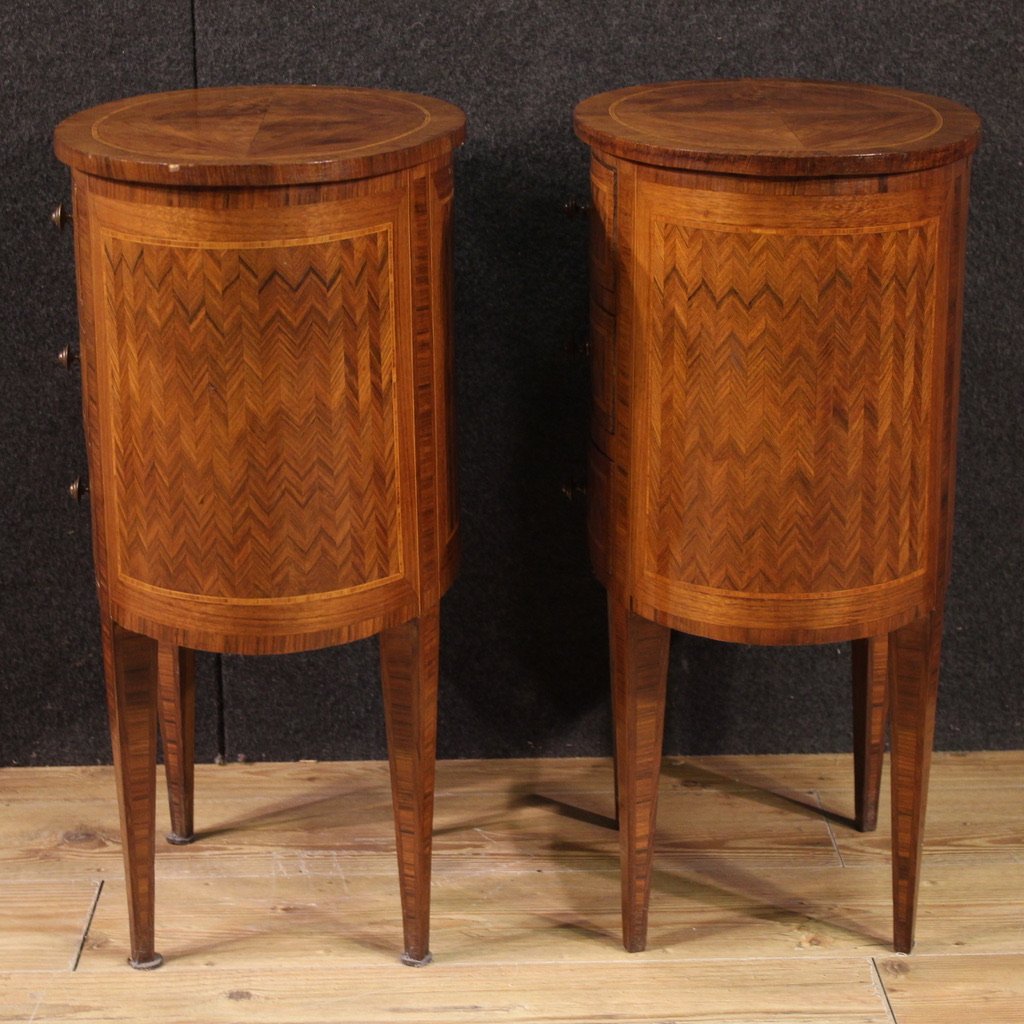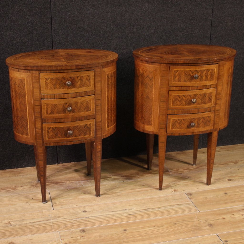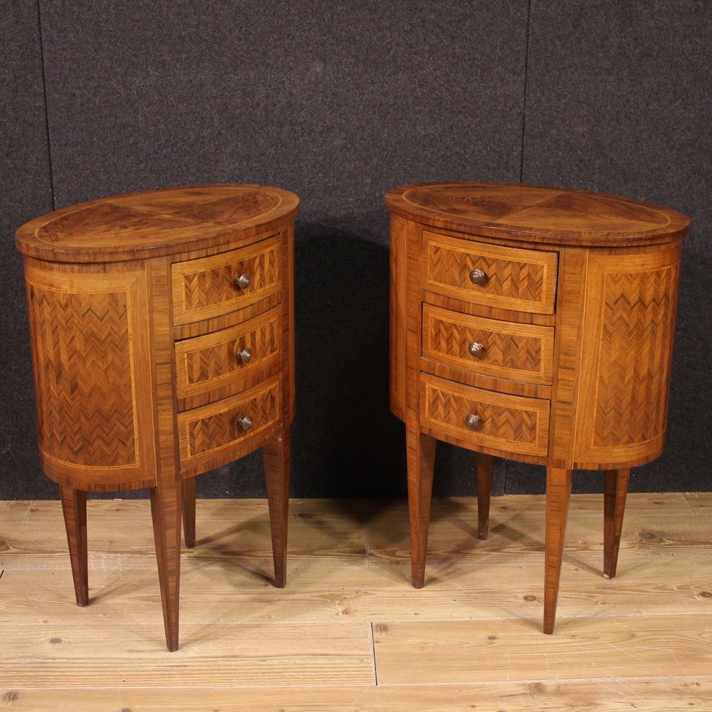 Pareja de mesillas de noche italianas de mediados del siglo XX. Muebles acabados por el centro con incrustaciones de nogal, arce y palisandro de excelente calidad. Las mesillas de noche de forma ovalada cuentan cada una con tres cajones y una tapa de madera, ofreciendo un buen tamaño y practicidad.