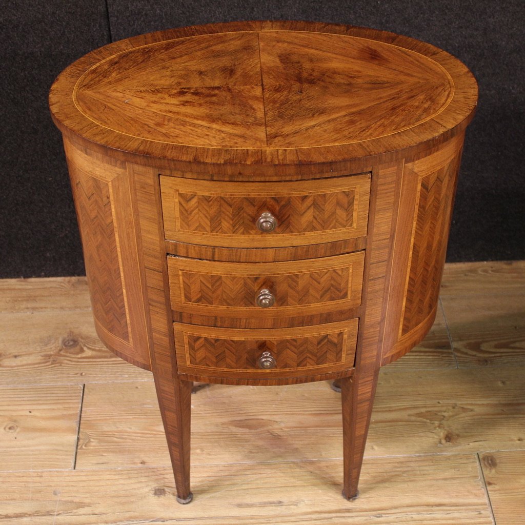 A pair of mid-20th-century Italian bedside tables. Furniture finished for the center inlaid with walnut, maple, and rosewood of excellent quality. Oval-shaped nightstands each feature three drawers and a wooden top, offering a good size and practicality.