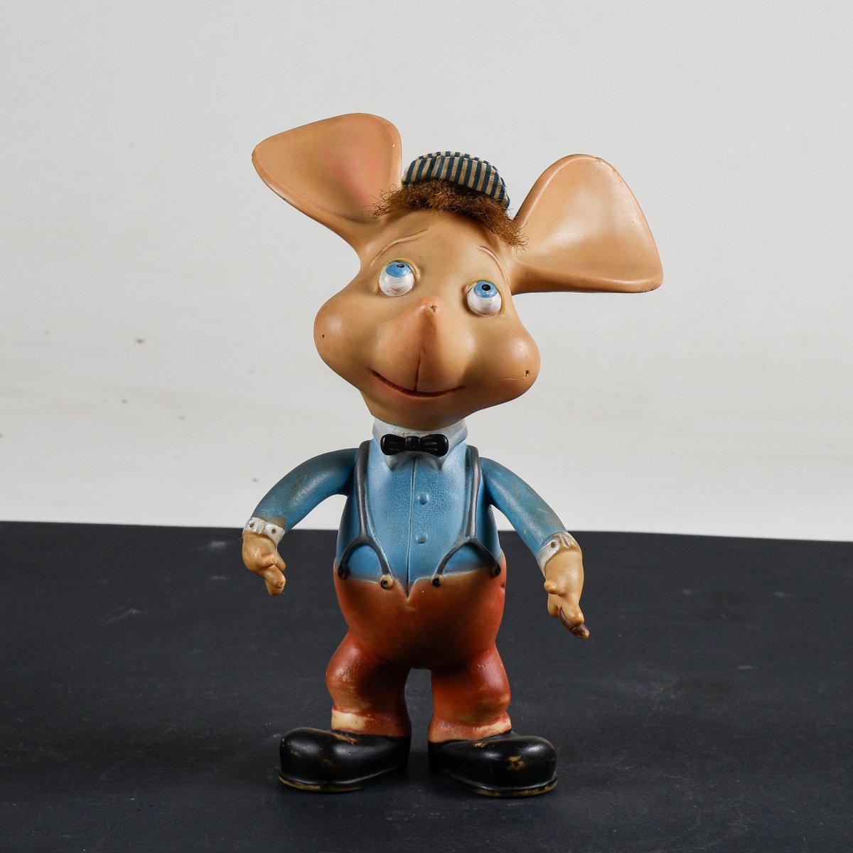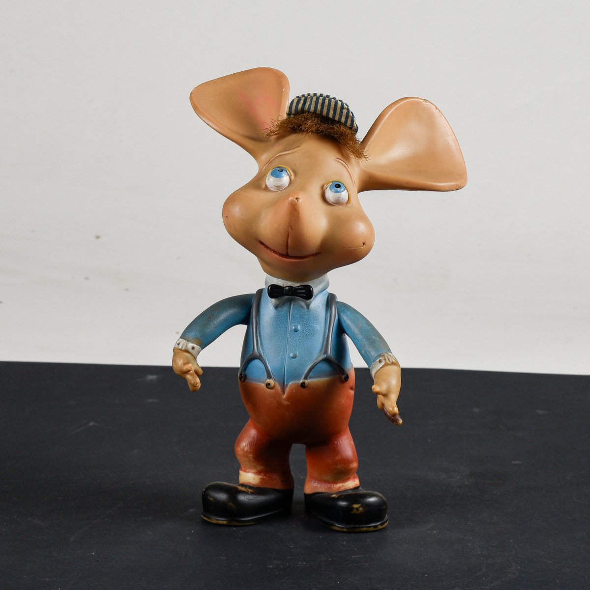 Rubber puppet Gigio the mouse with a cigar, a white and light blue striped cotton hat, synthetic hair, original from the 1960s, Italocremona production, on the right cheek there is a cut and a hole.