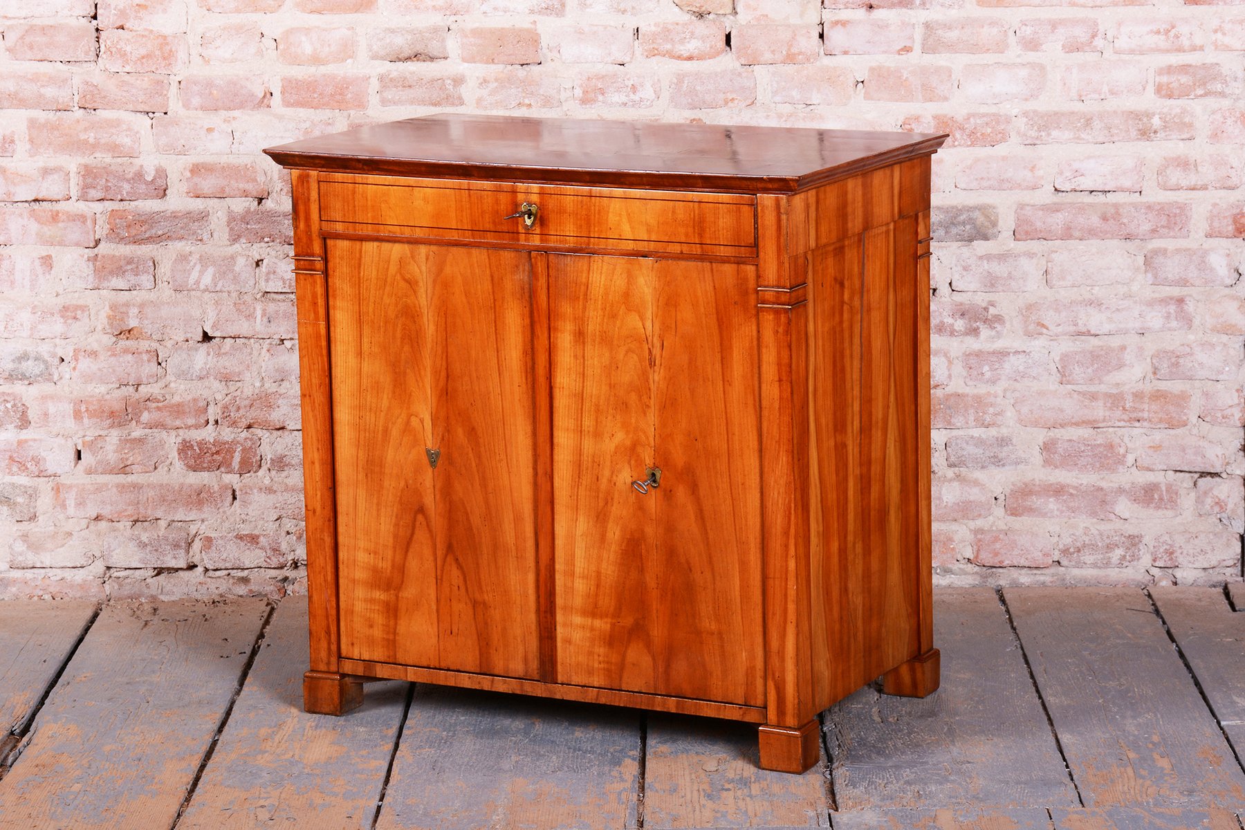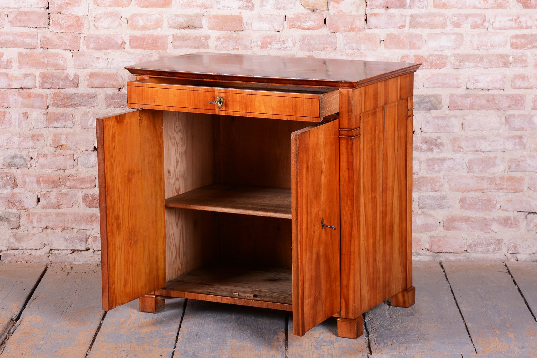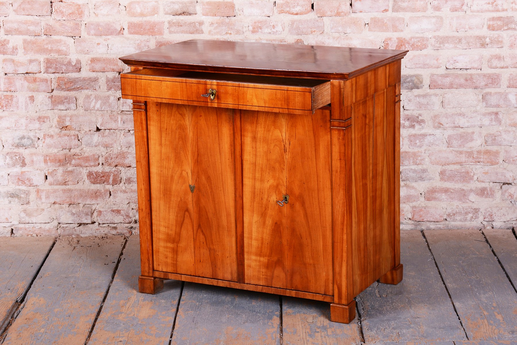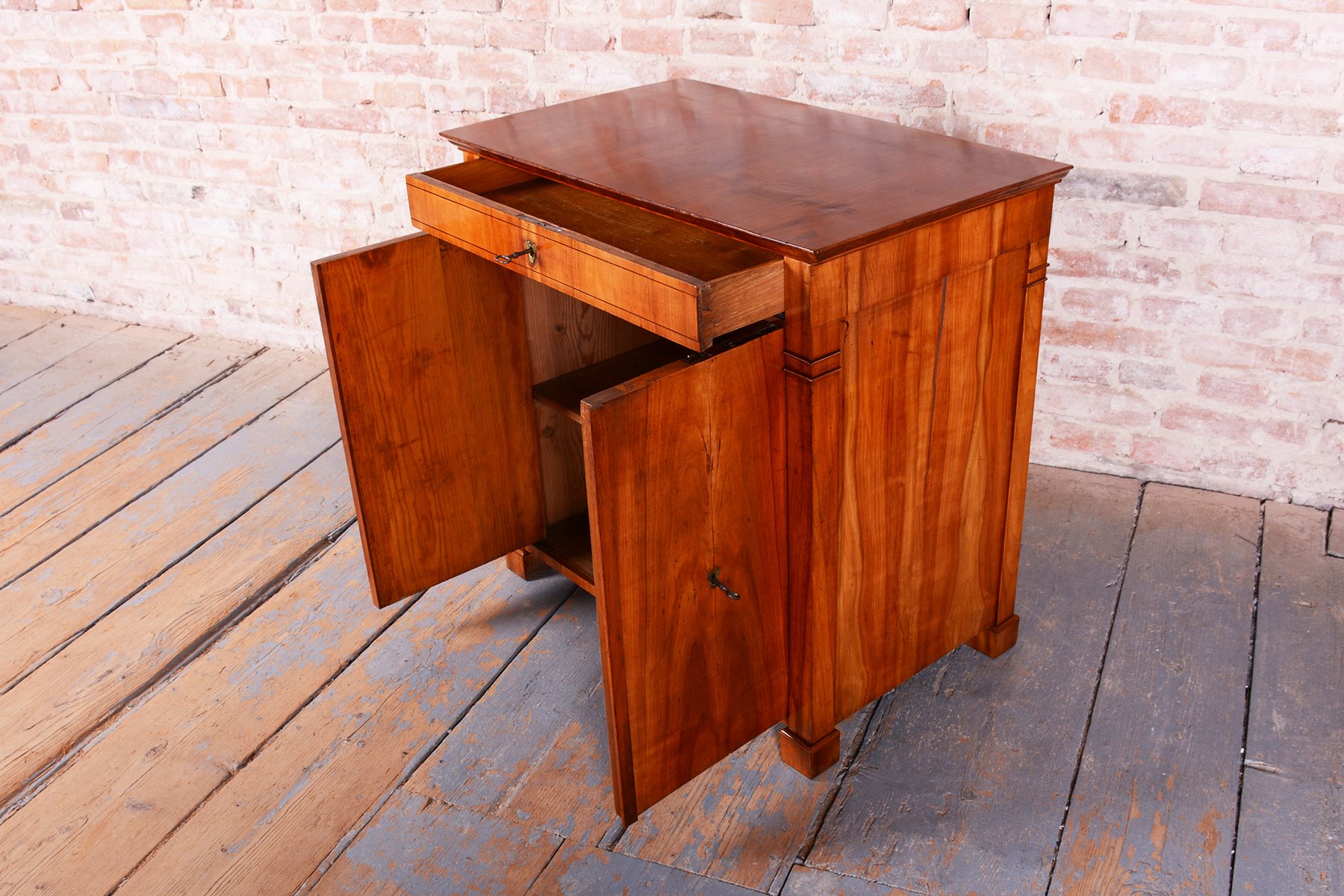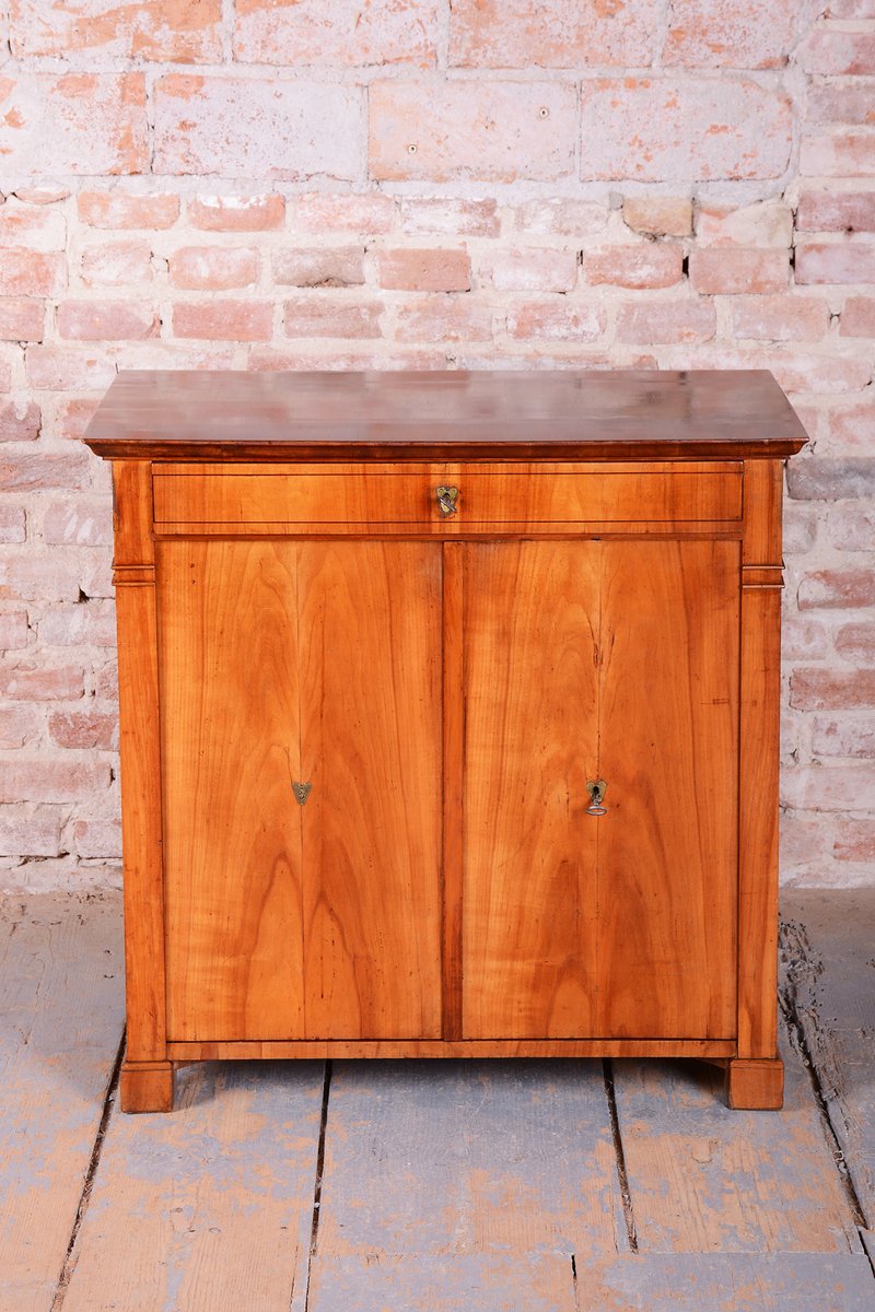 The cabinet is characterized by an exceptionally stable construction and remains fully functional even after nearly two centuries. The upper drawer and lower two-door compartment offer practical storage, while the clean lines and high-quality cherry wood make this commode a timeless centerpiece suitable for both modern and classically styled interiors.