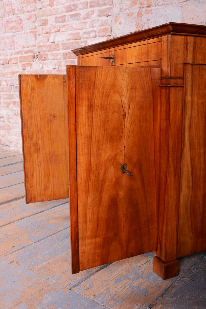 El armario se caracteriza por una construcción excepcionalmente estable y sigue siendo totalmente funcional incluso después de casi dos siglos. El cajón superior y el compartimento inferior de dos puertas ofrecen un práctico espacio de almacenamiento, mientras que las líneas limpias y la madera de cerezo de alta calidad hacen de este aparador una pieza central atemporal, adecuada tanto para interiores modernos como de estilo clásico. Ha sido repulido con laca de poliuretano para pianos por nuestro equipo profesional de restauración en Chequia, siguiendo el proceso original.