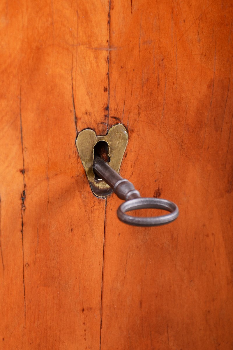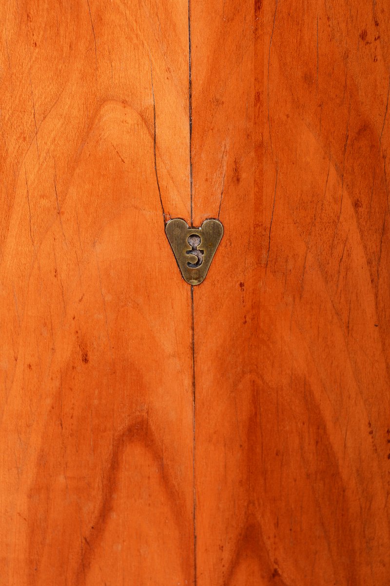 As part of a comprehensive restoration, the original wood polish was sensitively revived, allowing the surface to regain its depth and silky luster without compromising its historical patina. The exceptional value of this piece is highlighted by the fact that everything is original, including the hardware and a completely unique center-door lock, which is a rare detail for furniture from this period.