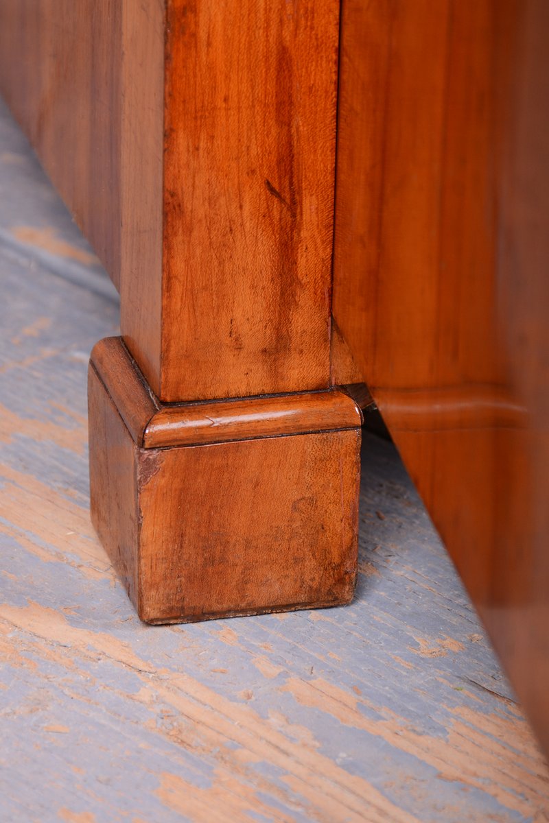 Esta elegante cómoda antigua, que funciona como un pequeño armario, es un excelente ejemplo de mobiliario de clase media de la primera mitad del siglo XIX. Originaria de Bohemia, esta pieza representa una época en la que se daba gran importancia a la precisión artesanal y a la belleza natural de los materiales. La superficie está acabada con chapa de cerezo de primera calidad, que se caracteriza por sus tonos cálidos y su delicado veteado, lo que confiere al conjunto un aspecto noble.