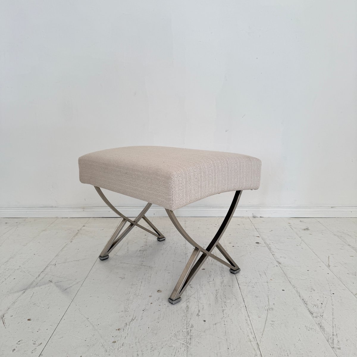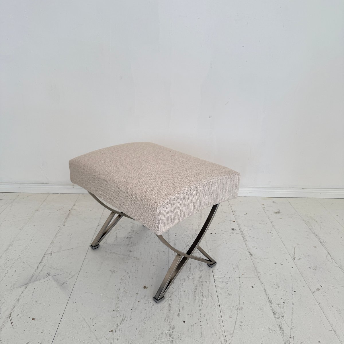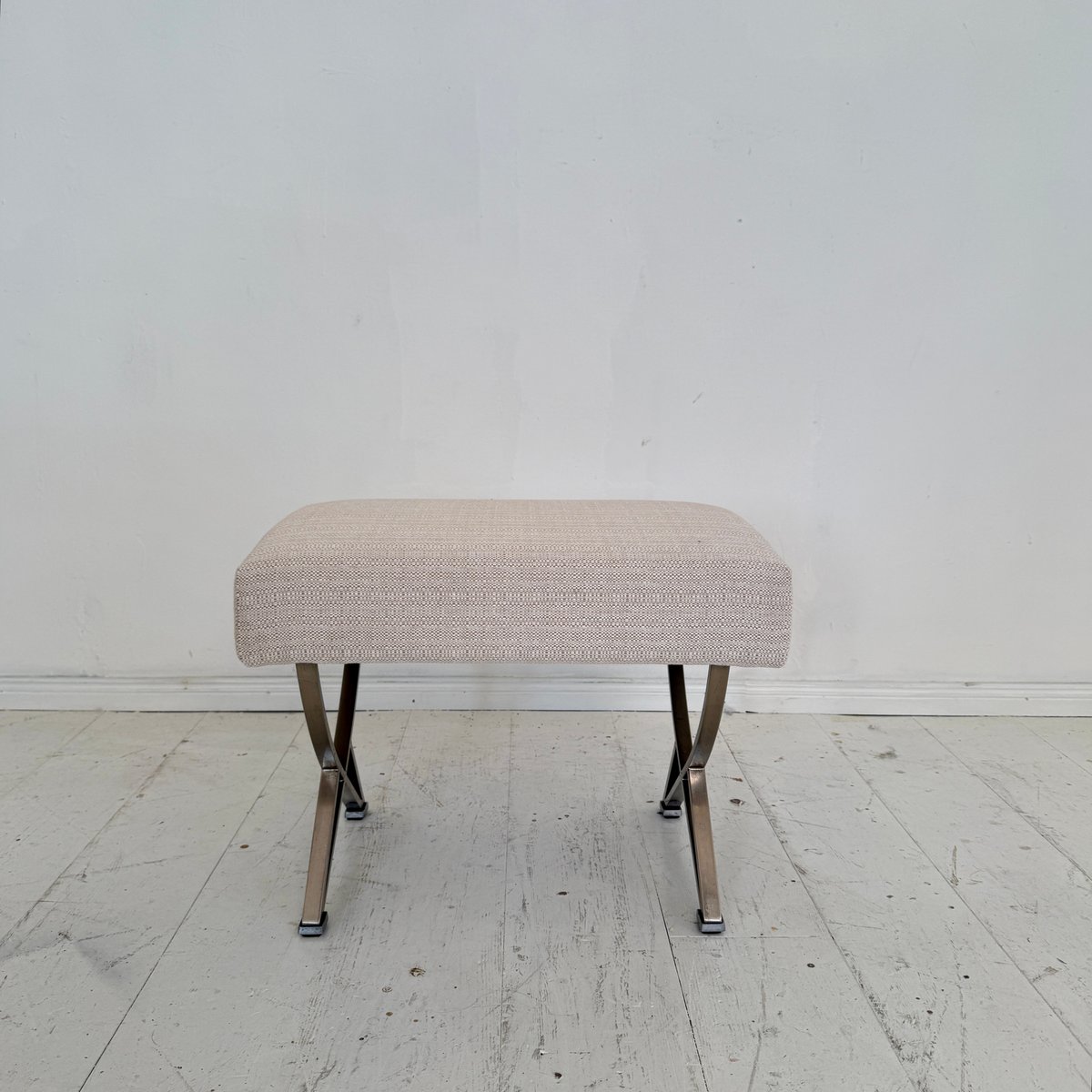 A sophisticated Mid-Century ottoman designed by Gianni Moscatelli for Formanova, Italy, around 1970. This piece exemplifies the designer’s refined approach to modern furniture, combining elegant proportions with functional comfort. The ottoman features a sleek X-form chromed steel base, creating a light yet architectural silhouette, while providing strength and stability. The seat is upholstered in a soft beige fabric, complementing the metallic frame with understated warmth and texture. Its minimalist design and clean lines reflect the essence of Italian modernism of the 1970s, balancing simplicity with luxury. Versatile in use, the ottoman can function as a footrest, additional seating, or as an accent piece in both contemporary and Mid-Century interiors. A timeless design object, it embodies the craftsmanship and aesthetic vision of Gianni Moscatelli.
