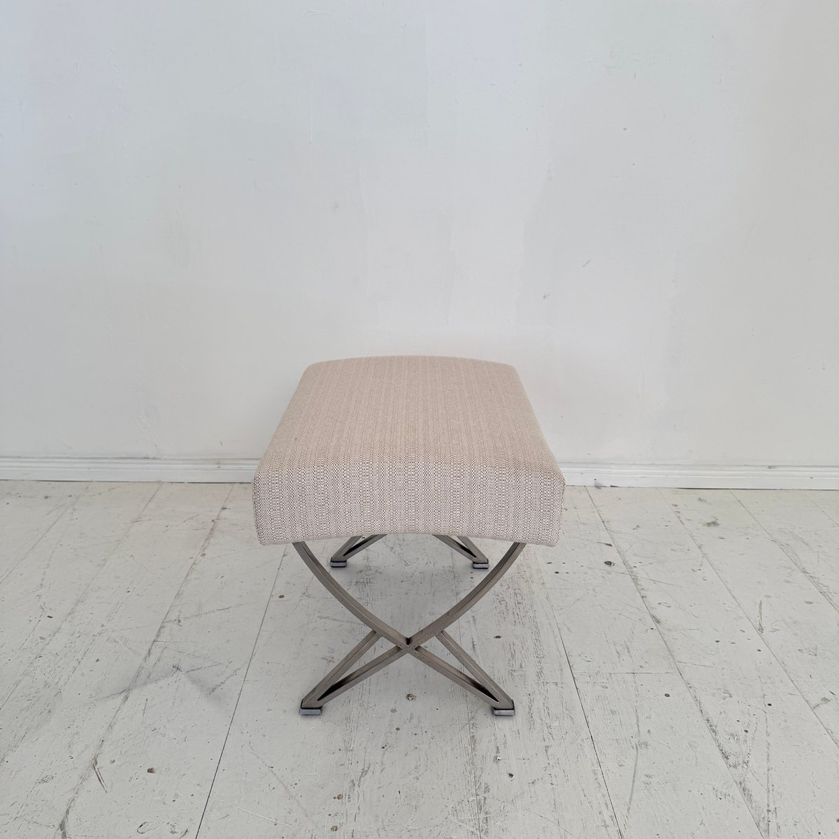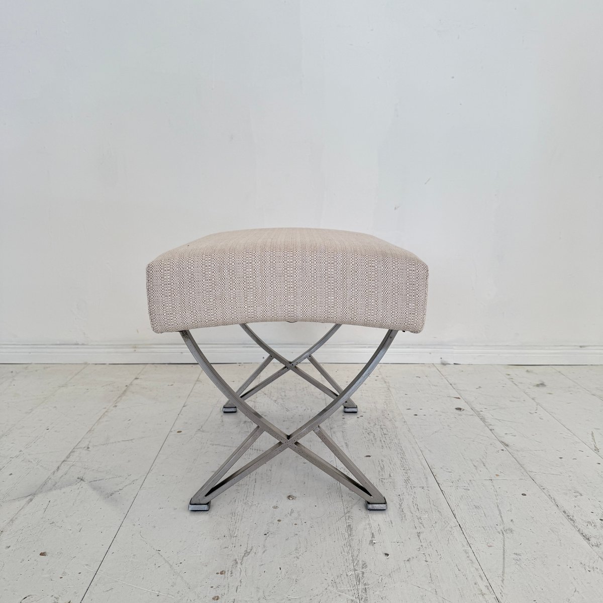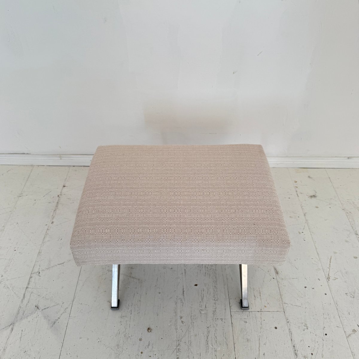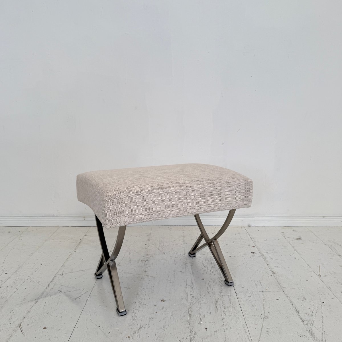 A sophisticated Mid-Century ottoman designed by Gianni Moscatelli for Formanova, Italy, around 1970. This piece exemplifies the designer’s refined approach to modern furniture, combining elegant proportions with functional comfort. The ottoman features a sleek X-form chromed steel base, creating a light yet architectural silhouette, while providing strength and stability. The seat is upholstered in a soft beige fabric, complementing the metallic frame with understated warmth and texture. Its minimalist design and clean lines reflect the essence of Italian modernism of the 1970s, balancing simplicity with luxury. Versatile in use, the ottoman can function as a footrest, additional seating, or as an accent piece in both contemporary and Mid-Century interiors. A timeless design object, it embodies the craftsmanship and aesthetic vision of Gianni Moscatelli.