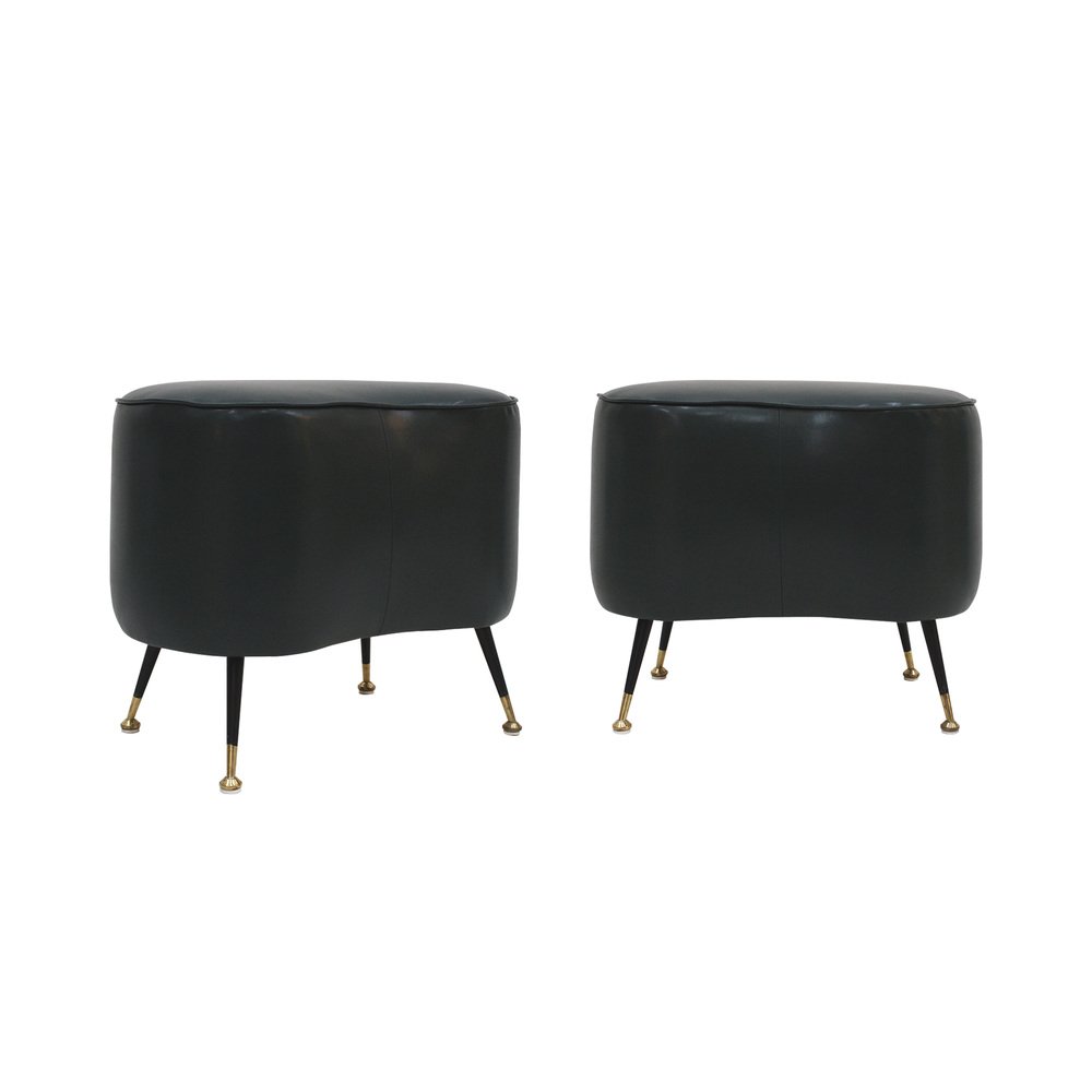 Pareja de reposapiés con estructura de madera maciza, tapizados en piel sintética verde, y patas de metal con remates de latón. Italia, años sesenta.