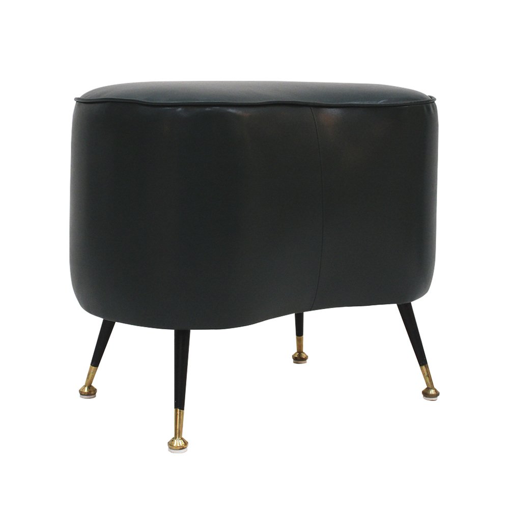 This pair of Italian footstools from the 1960s features a solid wood structure, green faux-leather upholstery, and metal legs with brass ends. The design reflects materials and construction methods characteristic of mid-century Italian furniture, combining visual lightness with structural stability. The elongated seat shape and balanced leg proportions create a clean, functional profile suitable for use as auxiliary seating or as an accent piece alongside a console or dressing table.