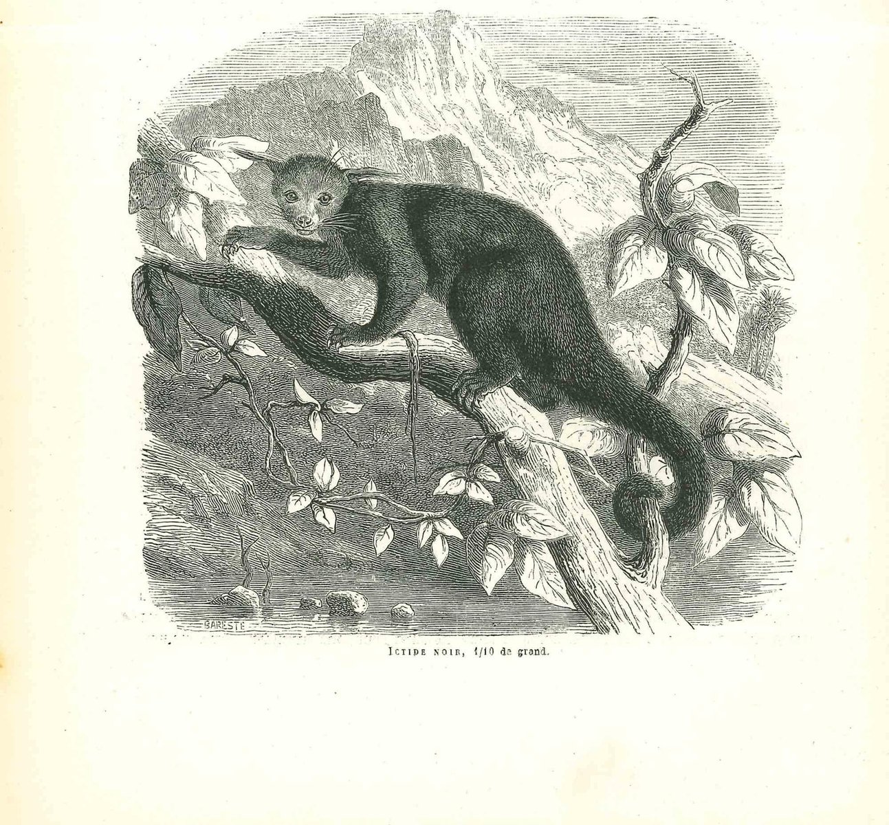 Ictide Noir is an original lithograph on ivory-colored paper, realized by Paul Gervais (1816-1879). The artwork is from The Series of "Les Trois Règnes de la Nature", and was published in 1854. Good conditions. Titled on the lower. with the notes on the rear. The series of artworks of "Les Trois Règnes de la Nature" represent animals through deft strokes and precise anatomical studies, which include its movement, behavior, shape, and structures of the body expressed at the same time aesthetically creatively and scientific too, usually with a beautiful landscape in the perspective or in the picturesque scenery. Paul Gervais (Paris, 26 September 1816 - 10 February 1879) was a French zoologist and paleontologist, obtained a doctorate in science and medicine, obtained a doctorate in science and medicine from 1841 he opened the Department of Zoology and Anatomy compared to the Faculty of Science of Montpellier, where he presided over in 1856. Between 1848 and 1852 he received his important opera French Zoology and Paleontology.