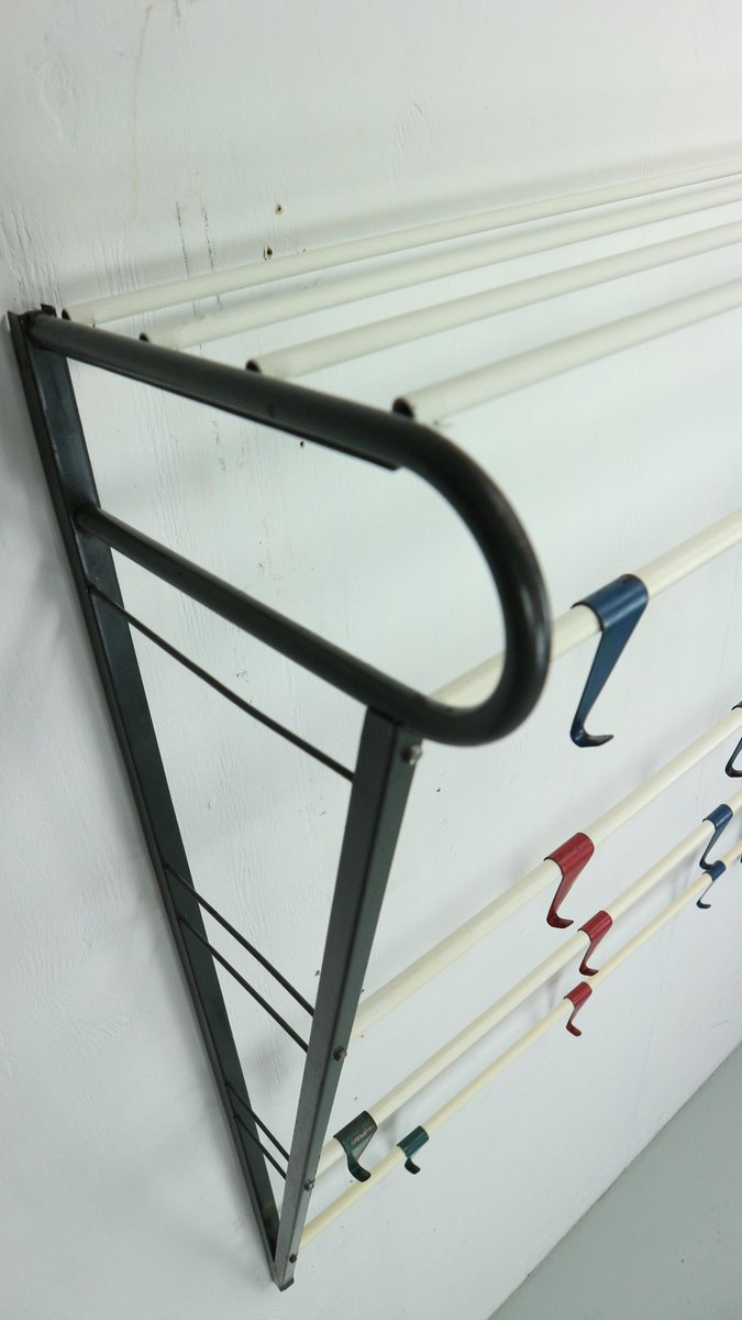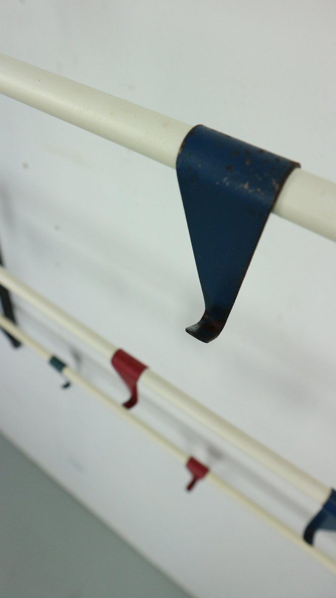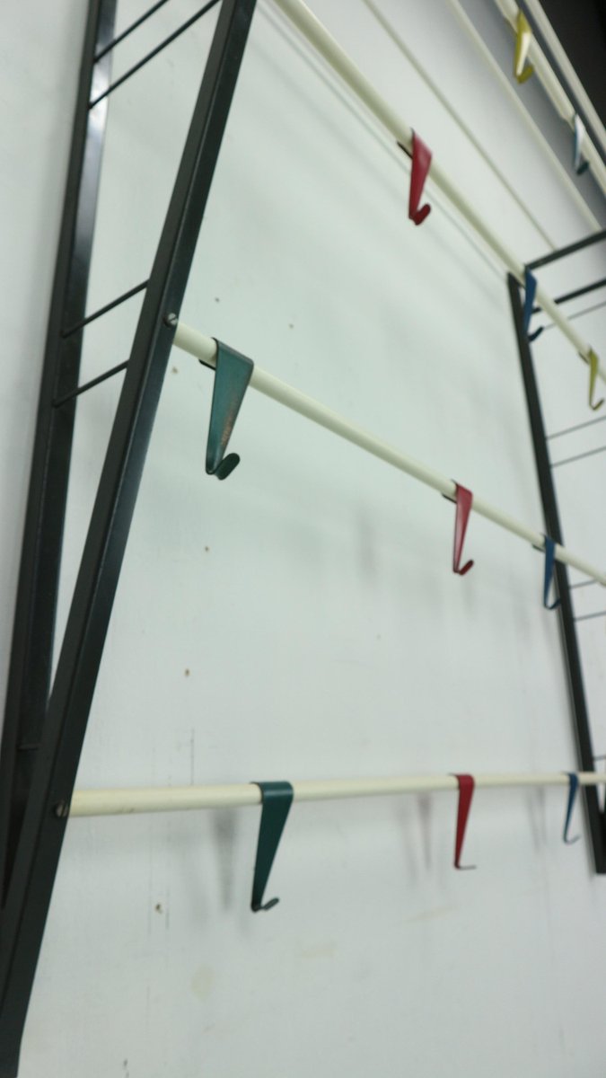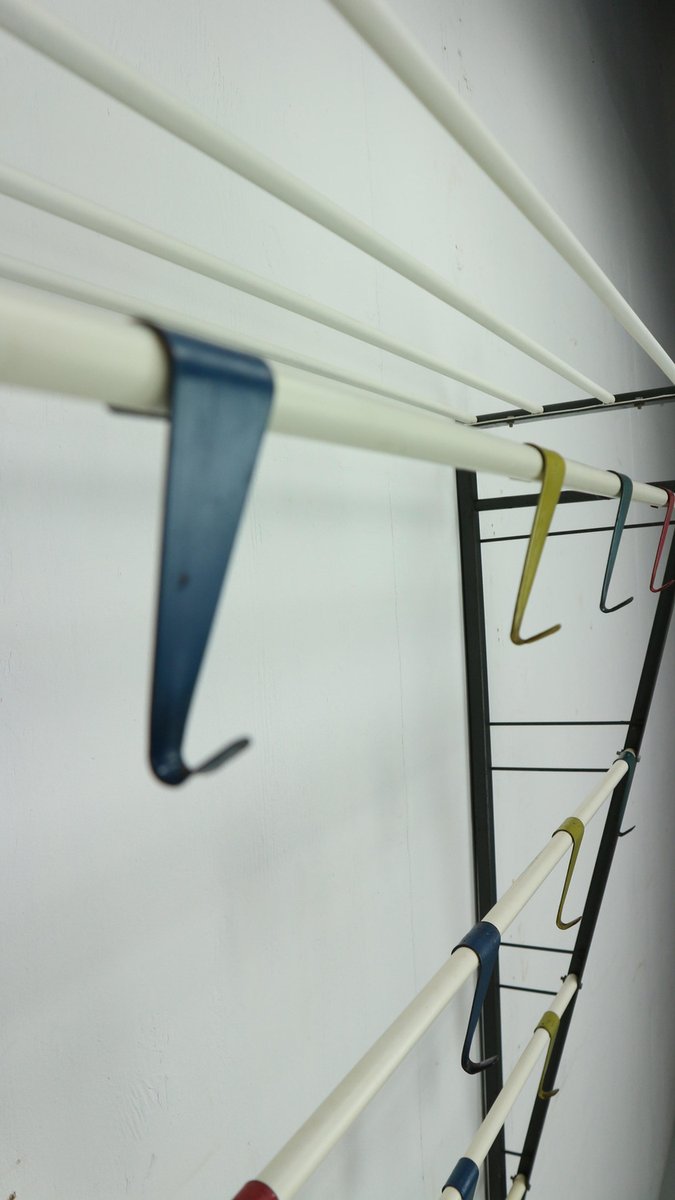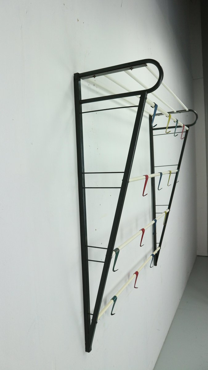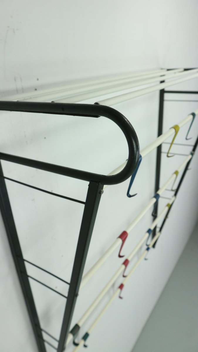 Vintage coat & hat rack designed by the Dutch designer Coen de Vries in the 1950s and manufactured by Devo in the Netherlands. This coat rack is a rare first edition, embodying the timeless elegance and functionality of mid-century design. The coat rack features a lacquered steel frame, providing both durability and a sleek aesthetic. The hooks are formed from bent wires in a vibrant colour, adding a playful touch to the overall design, you can slide in both sides the way you want to hand items. This unique combination of materials and colours sets this coat rack apart, making it a standout piece in any interior. In good original condition, this coat rack exhibits minor wear consistent with its age and use, which only adds to its authentic character. The patina acquired over time showcases its vintage appeal, contributing to its overall charm and allure.