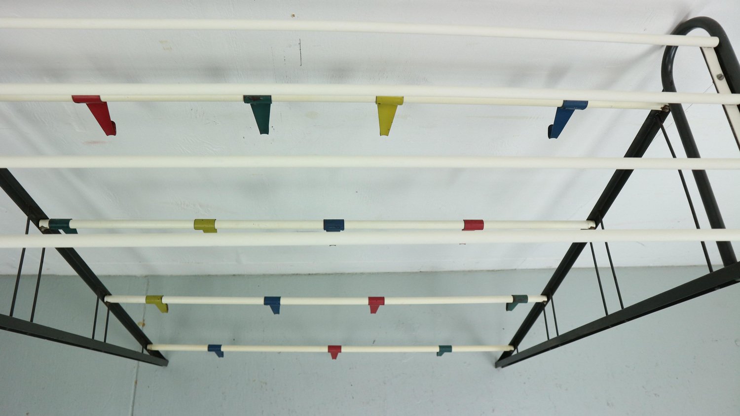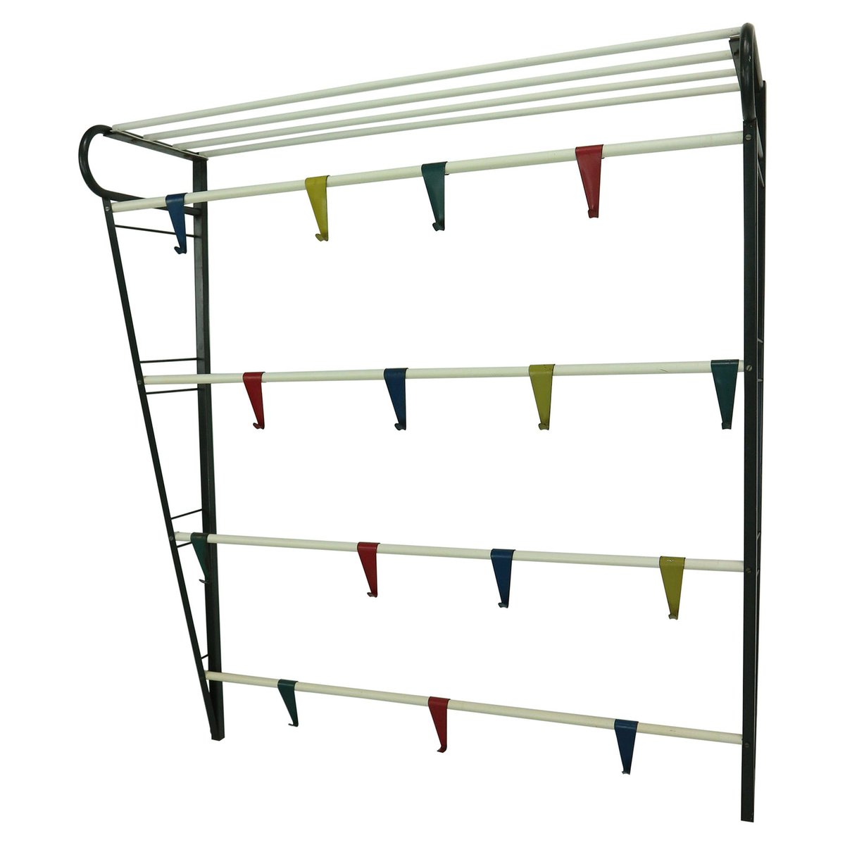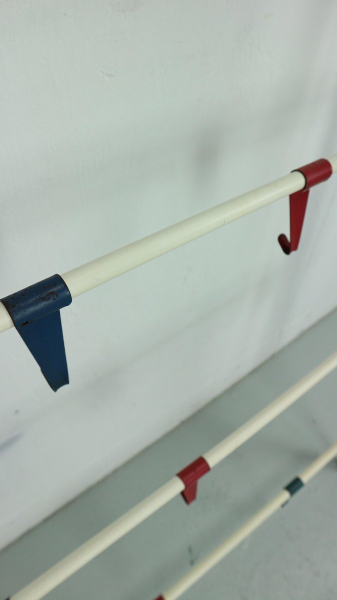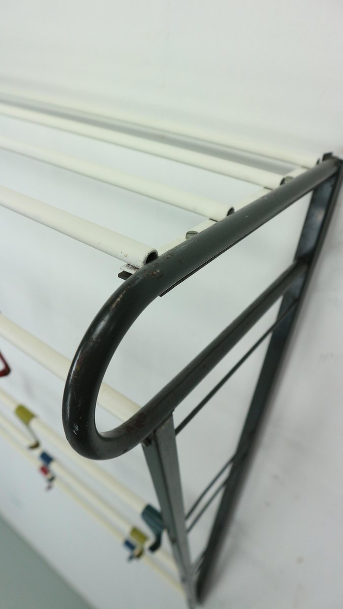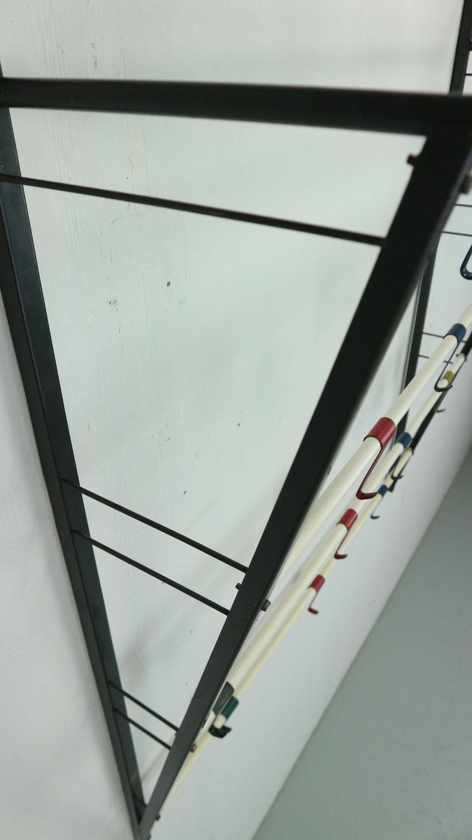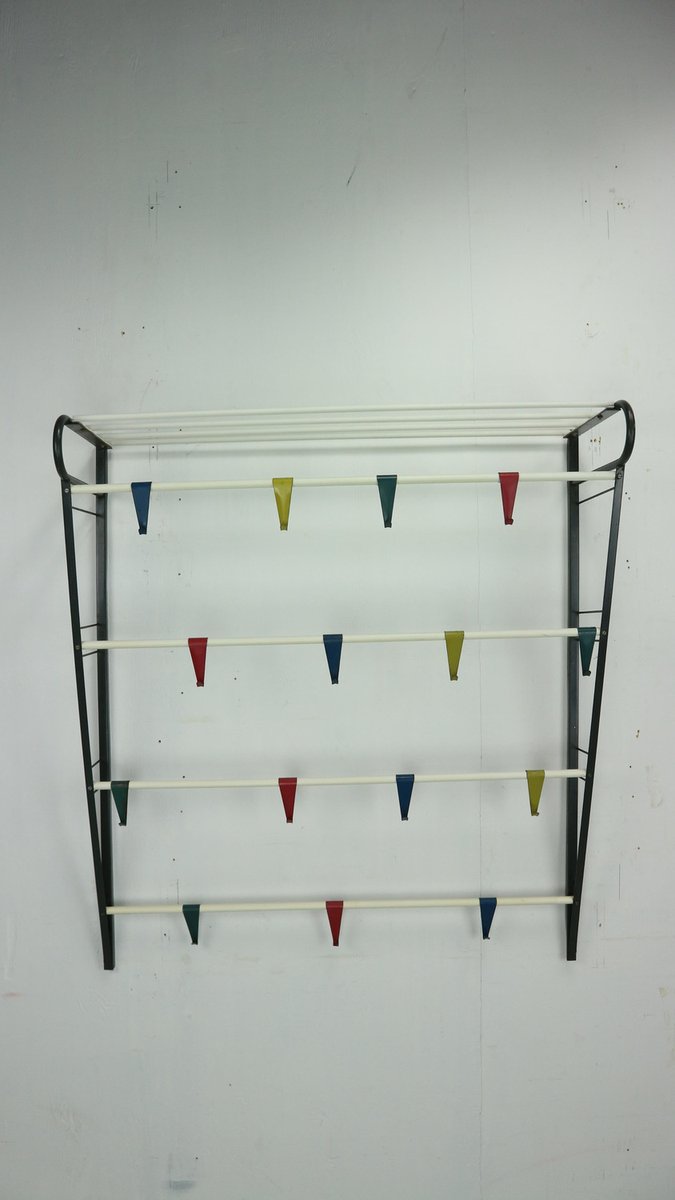 Vintage coat & hat rack designed by the Dutch designer Coen de Vries in the 1950s and manufactured by Devo in the Netherlands. This coat rack is a rare first edition, embodying the timeless elegance and functionality of mid-century design. The coat rack features a lacquered steel frame, providing both durability and a sleek aesthetic. The hooks are formed from bent wires in a vibrant colour, adding a playful touch to the overall design, you can slide in both sides the way you want to hand items. This unique combination of materials and colours sets this coat rack apart, making it a standout piece in any interior. In good original condition, this coat rack exhibits minor wear consistent with its age and use, which only adds to its authentic character. The patina acquired over time showcases its vintage appeal, contributing to its overall charm and allure.