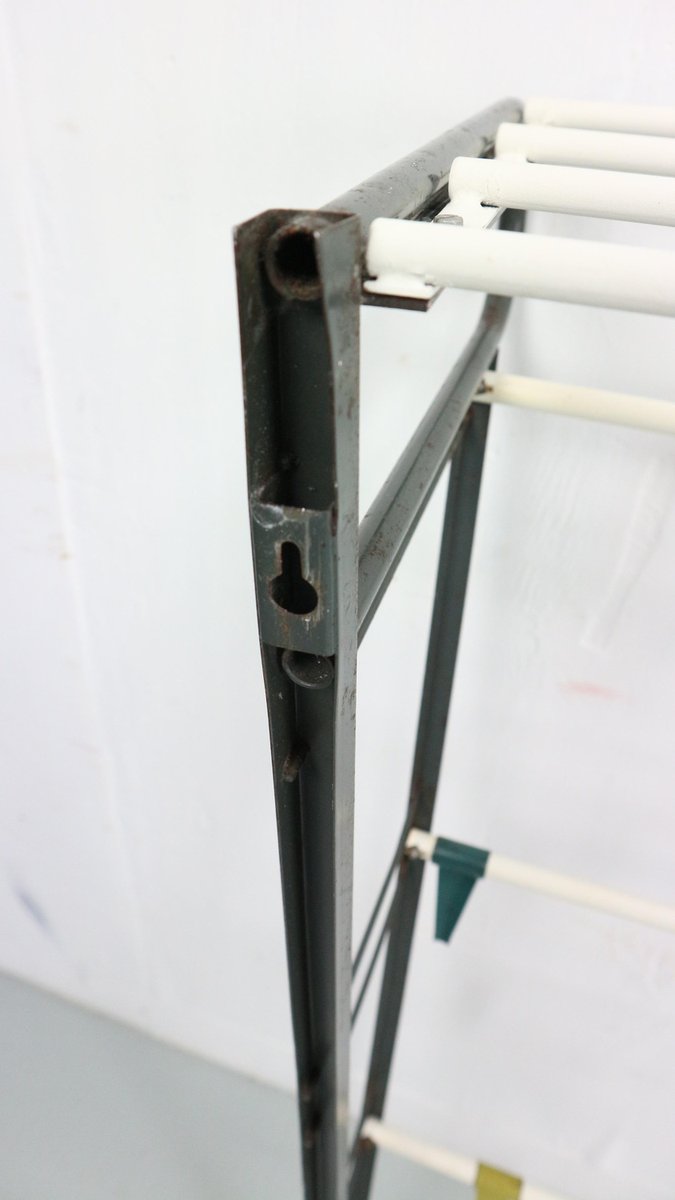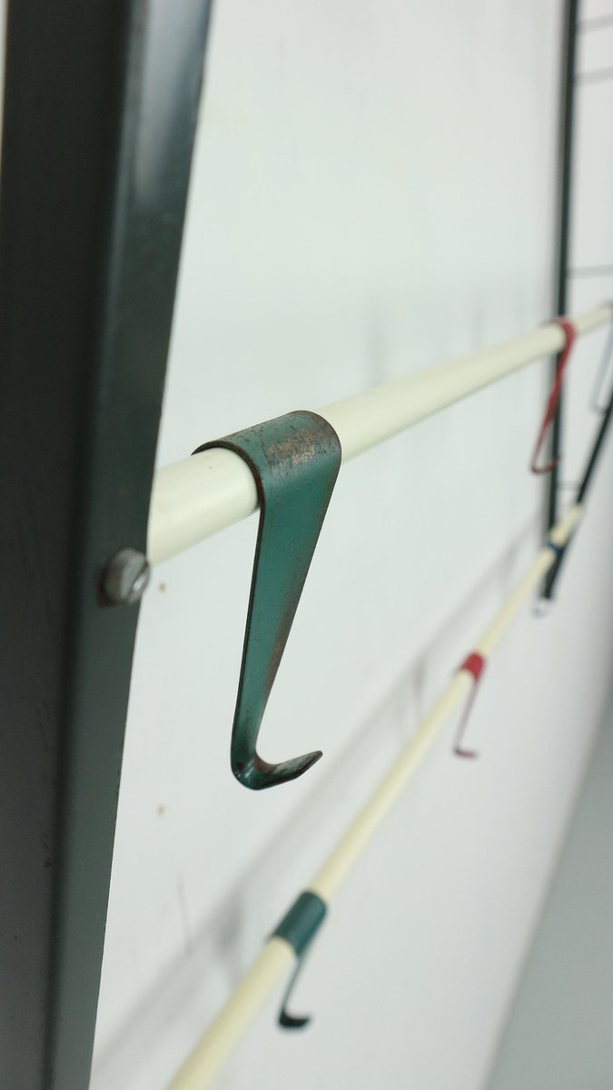 Perchero vintage diseñado por el diseñador holandés Coen de Vries en la década de 1950 y fabricado por Devo en los Países Bajos. Este perchero es una rara primera edición que encarna la elegancia atemporal y la funcionalidad del diseño de mediados de siglo. El perchero tiene una estructura de acero lacado que le confiere durabilidad y una estética elegante. Los ganchos están formados por alambres doblados en un color vibrante, lo que añade un toque juguetón al diseño general, pudiendo deslizarlos a ambos lados de la forma que desee para guardar los objetos. Esta combinación única de materiales y colores distingue a este perchero, convirtiéndolo en una pieza destacada en cualquier interior. En buen estado original, este perchero muestra un desgaste menor acorde con su edad y uso, que no hace sino añadir autenticidad a su carácter. La pátina adquirida con el paso del tiempo realza su atractivo vintage, contribuyendo a su encanto y atractivo general.