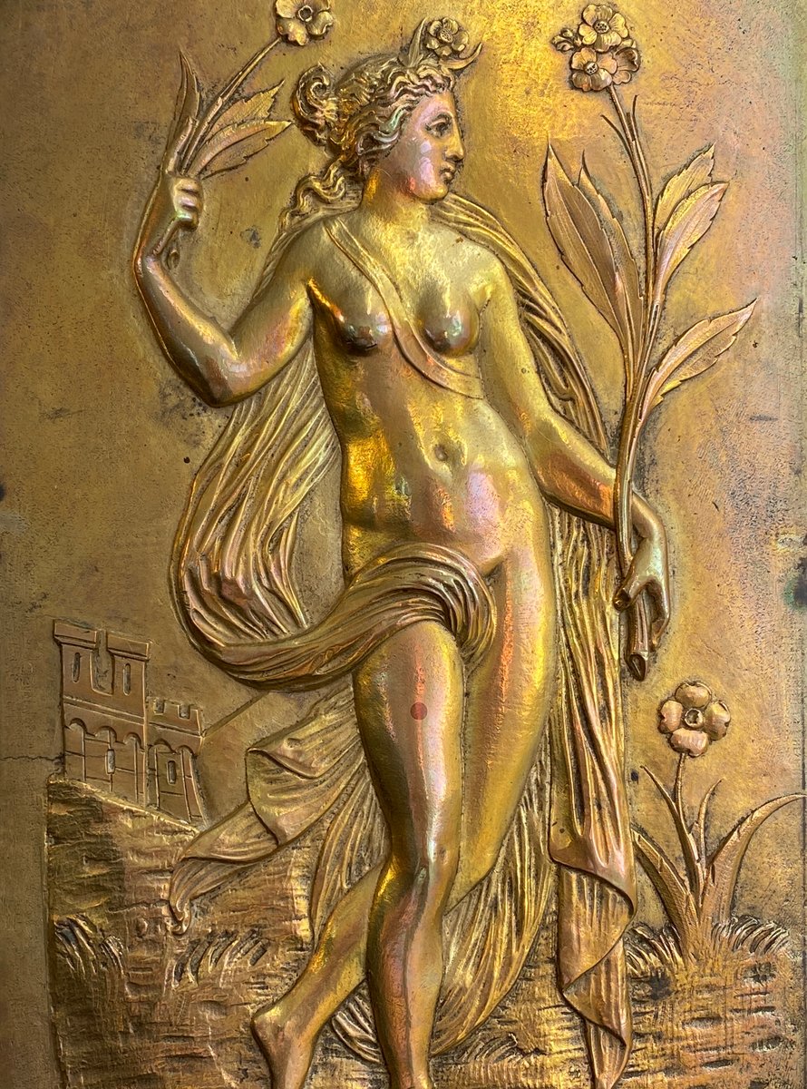 Placas en bajorrelieve antiguos de bronce con motivos de primavera y verano, Francia, década de 1880. Juego de 2