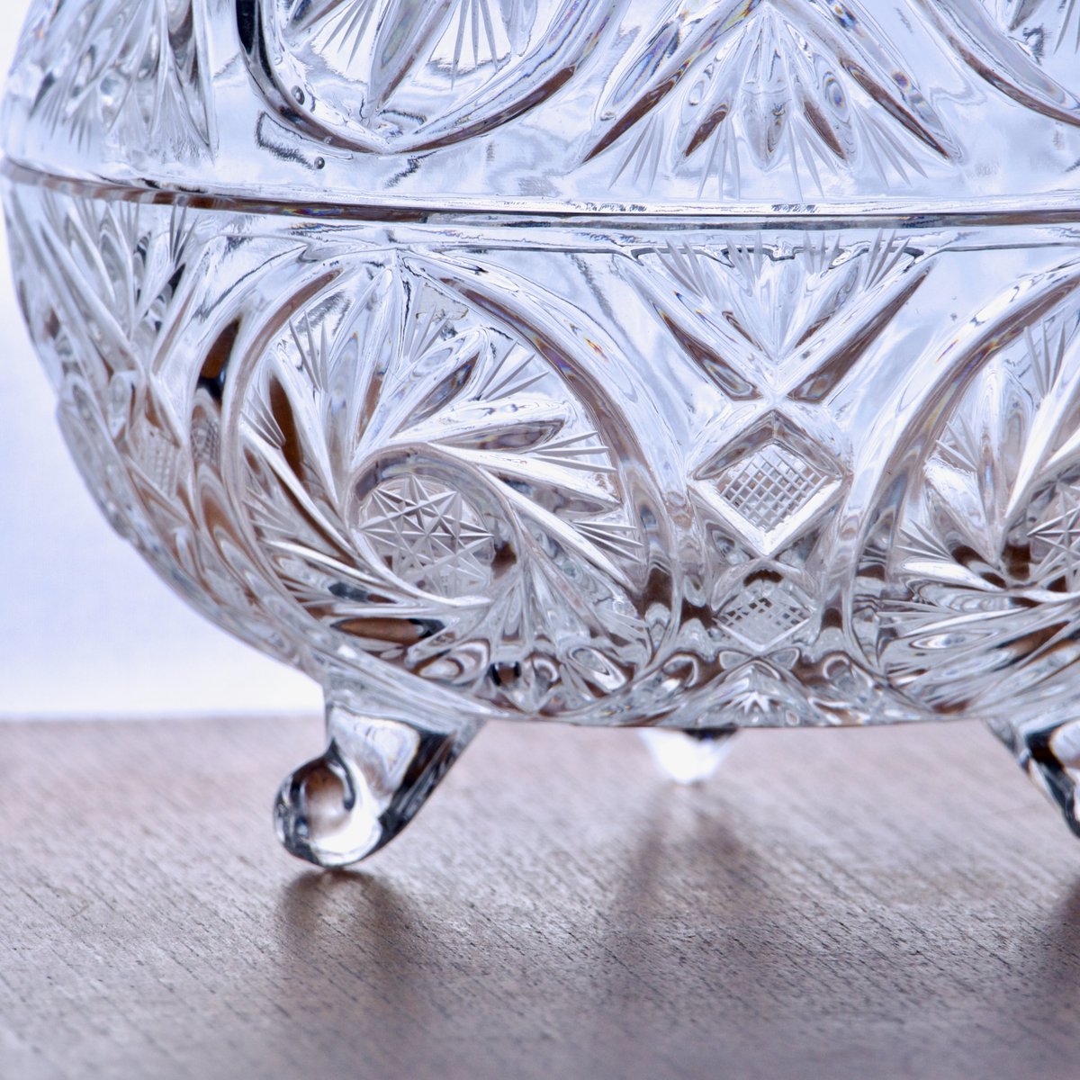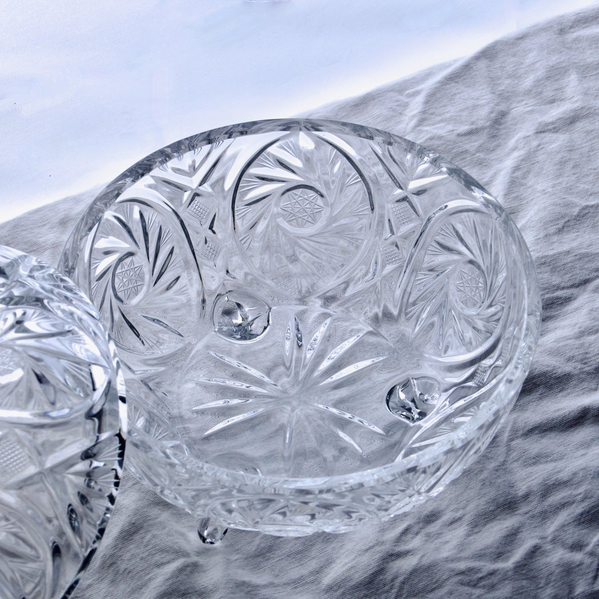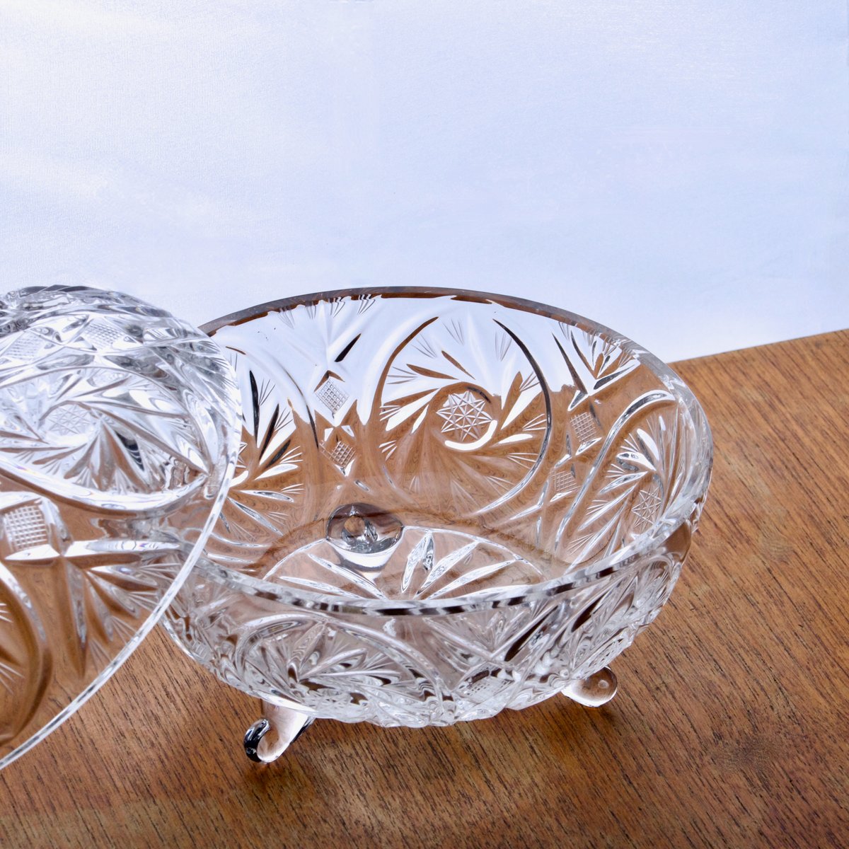 A magnificent and large antique tripod candy dish in hand-cut and engraved crystal, first half of the 20th century.