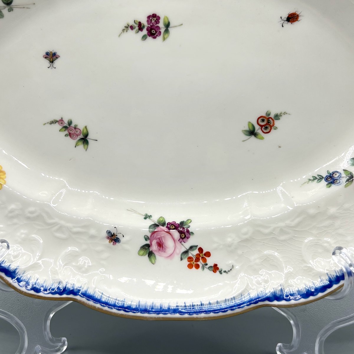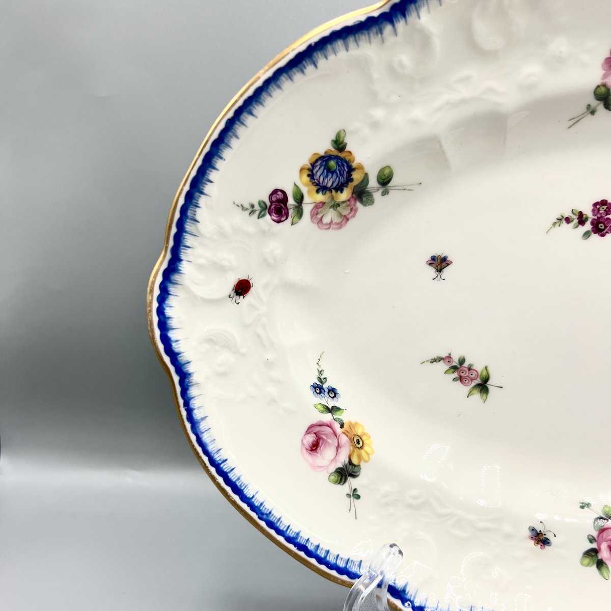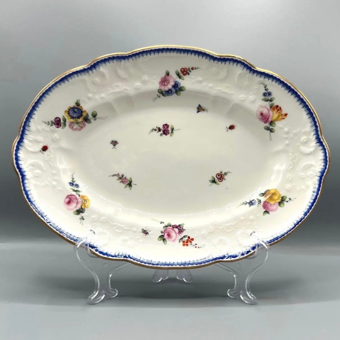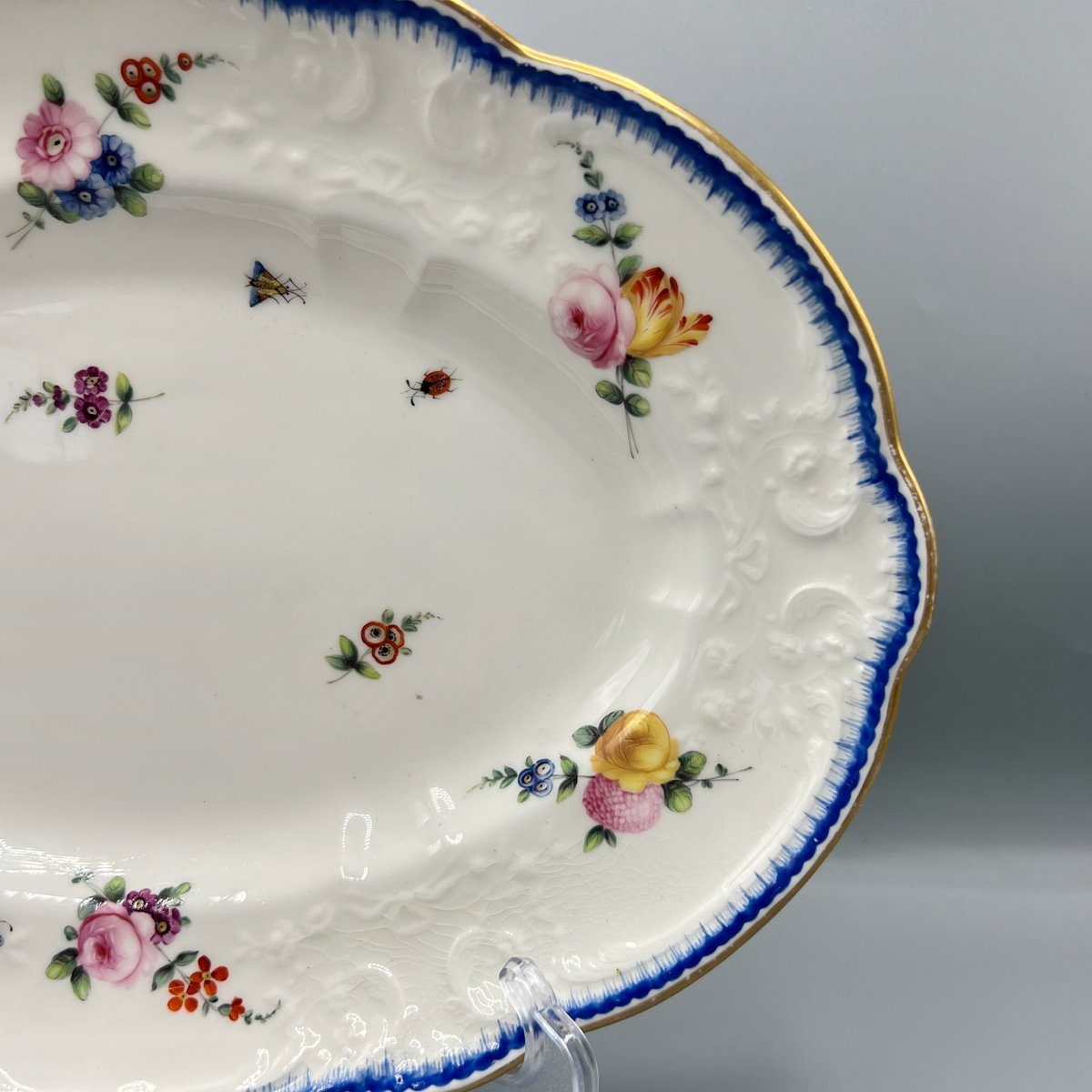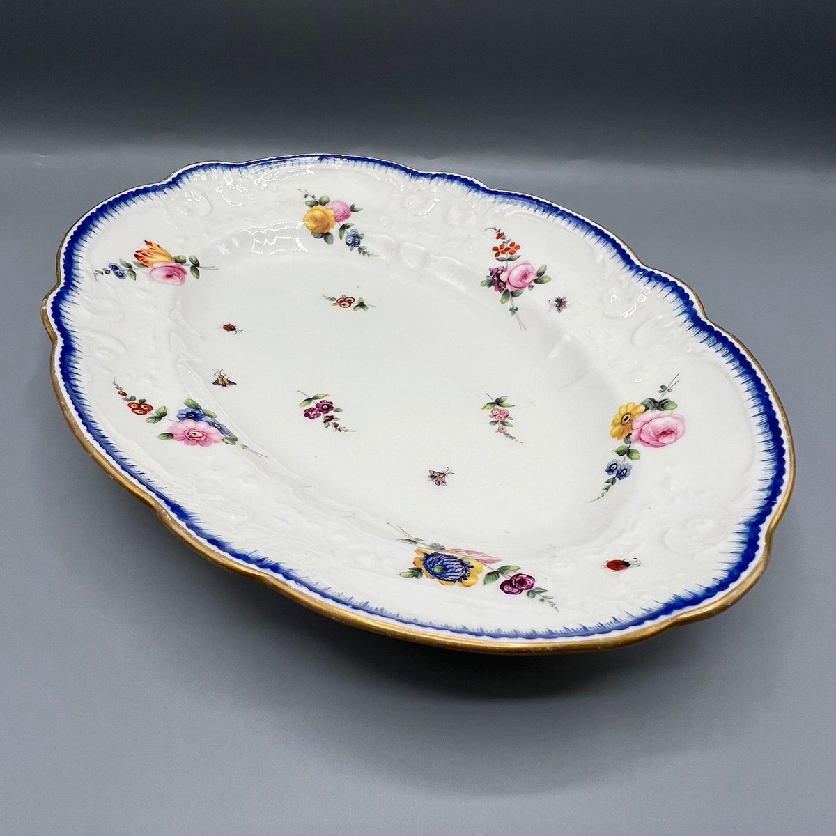 A rare early 19th-century Nantgarw porcelain oval serving dish, dating to circa 1817–1820. This finely potted example is hand-painted with naturalistic sprays of flowers, butterflies, and insects, scattered across a crisp white ground with moulded rim details picked out in blue and gilt.