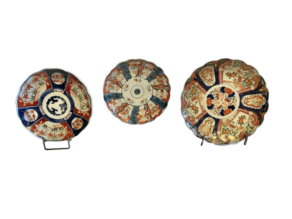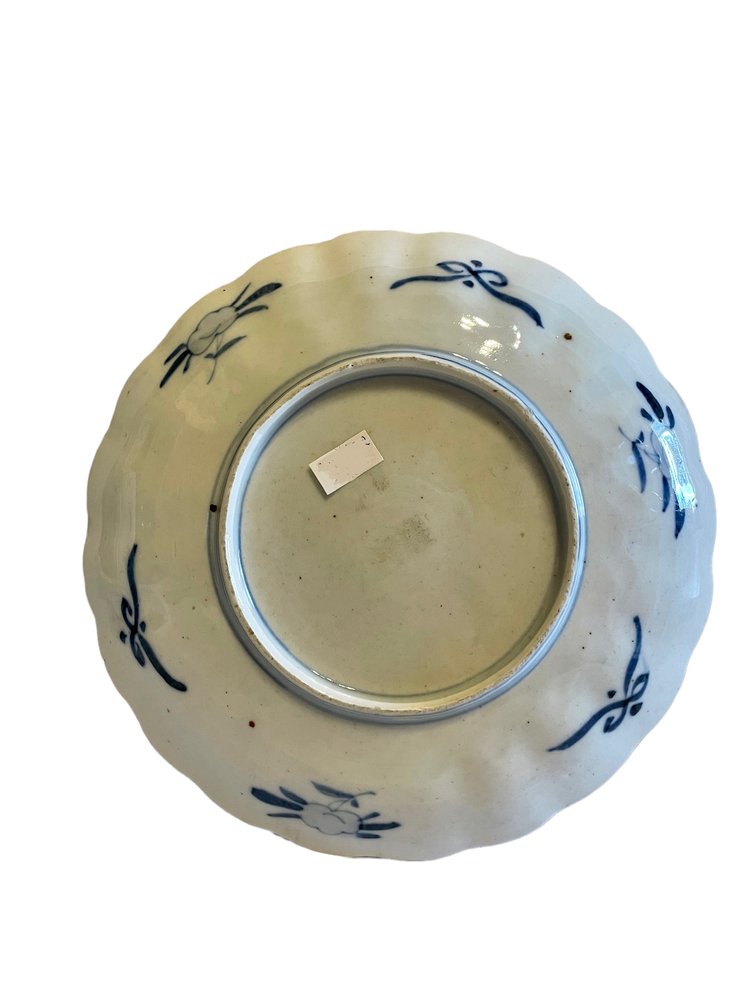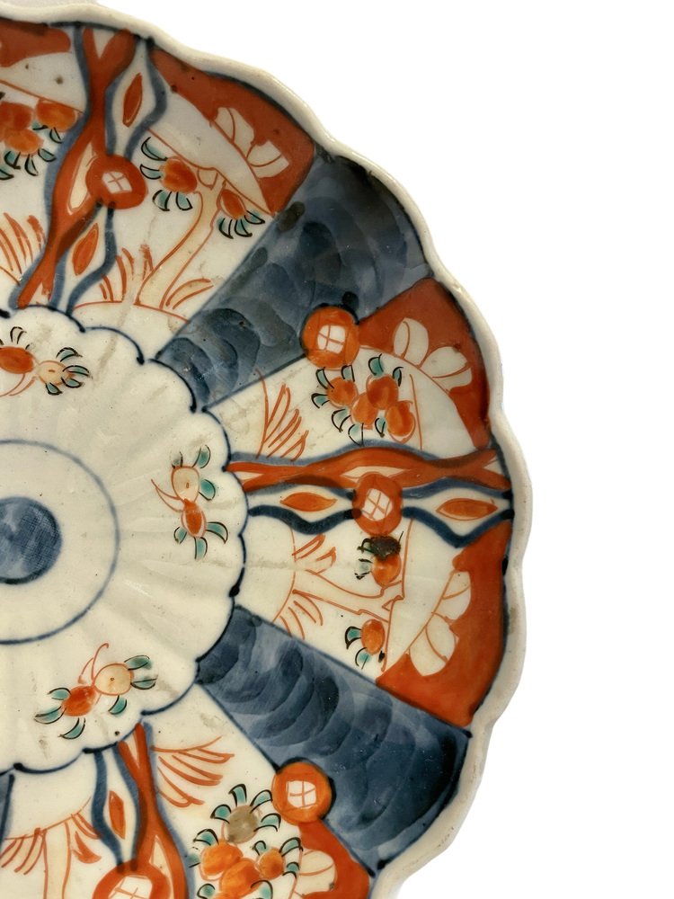 Un plato que es un bello ejemplo de la porcelana japonesa Imari. Ricamente decorado con adornos tradicionales pintados a mano en tonos cobalto y rojo. La decoración bicolor sobreesmaltada combinada con el azul subyacente es característica de la porcelana Imari. La decoración del plato, dispuesta por zonas, crea una disposición regular y alternada de motivos vegetales en franjas rojas y circulares. El centro de la composición está marcado con un punto de cobalto rodeado de una línea. Los bordes del plato con un motivo decorativo en forma de galleta.