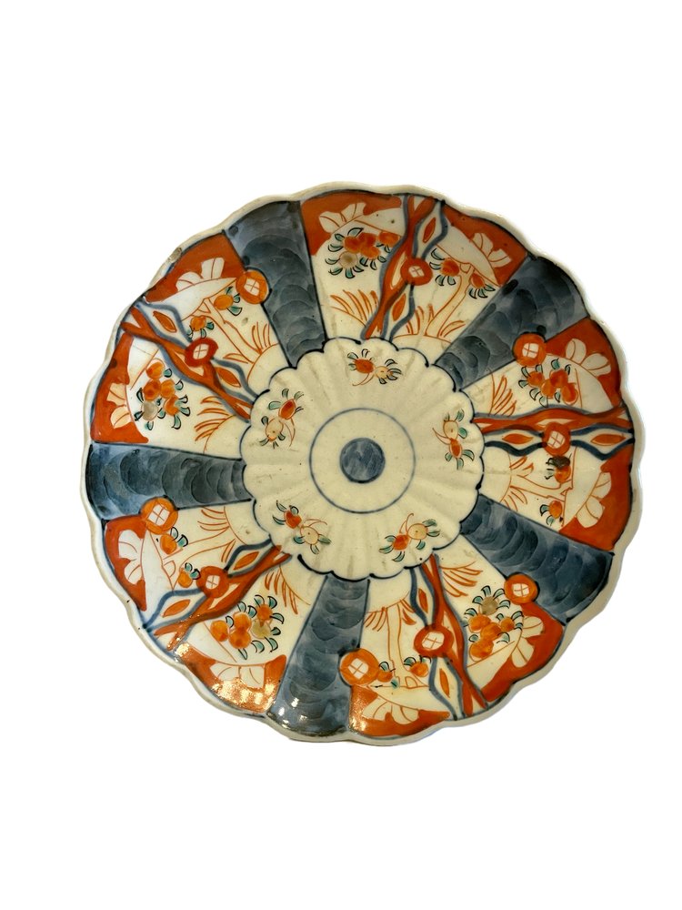 A plate that is a beautiful example of Japanese Imari porcelain. Richly decorated with traditional, hand-painted decorations in shades of cobalt and red. Two-color overglaze decoration combined with underglaze blue is characteristic of Imari porcelain. The decoration of the plate arranged in zones creates a regular, alternating arrangement of plant motifs in red and circular stripes. The center of the composition is marked with a cobalt point surrounded by a line. The edges of the plate with a decorative biscuit pattern.