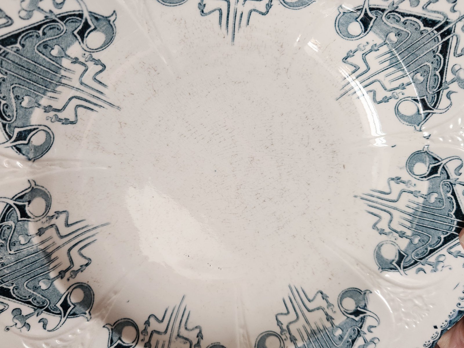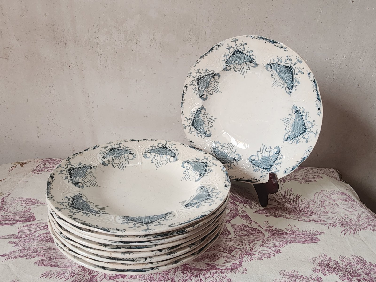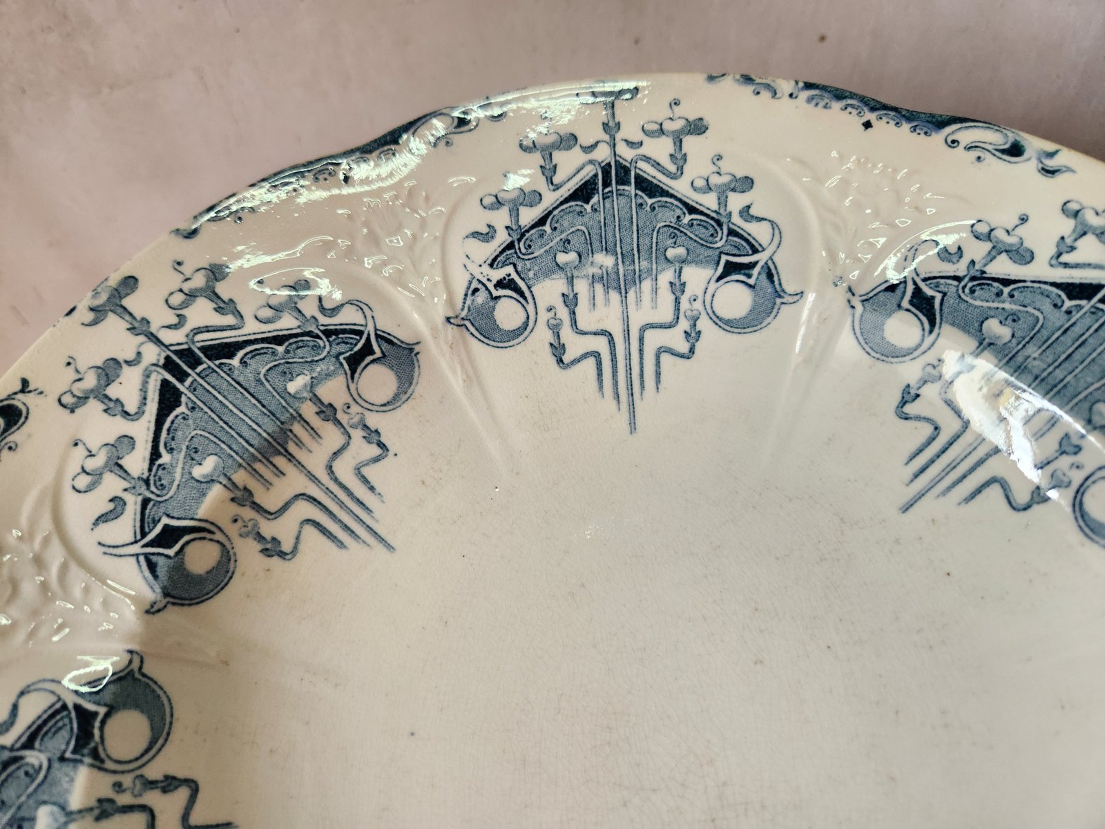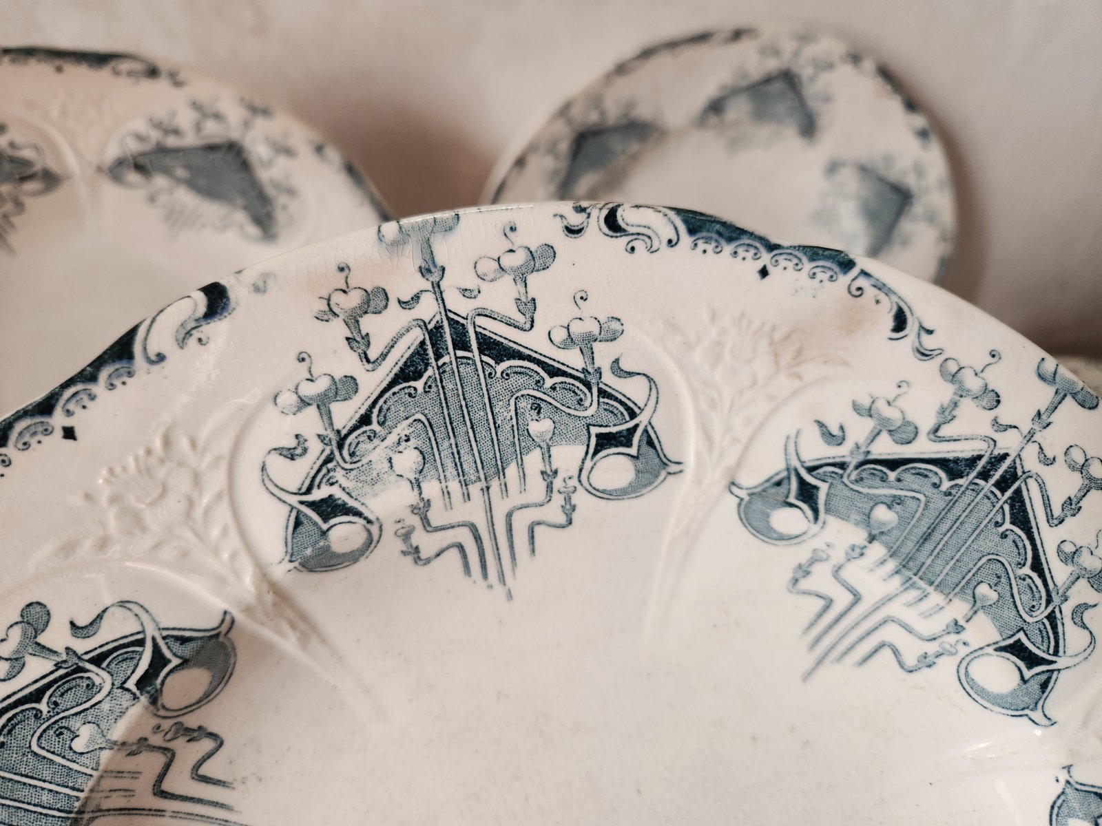 Antiguo juego de nueve platos huecos de piedra ferruginosa de transferencia azul bizantina de Longwy, terre de fer, de finales del siglo XIX. Hermosa decoración en un patrón muy Art Nouveau con una decoración subyacente en relieve.