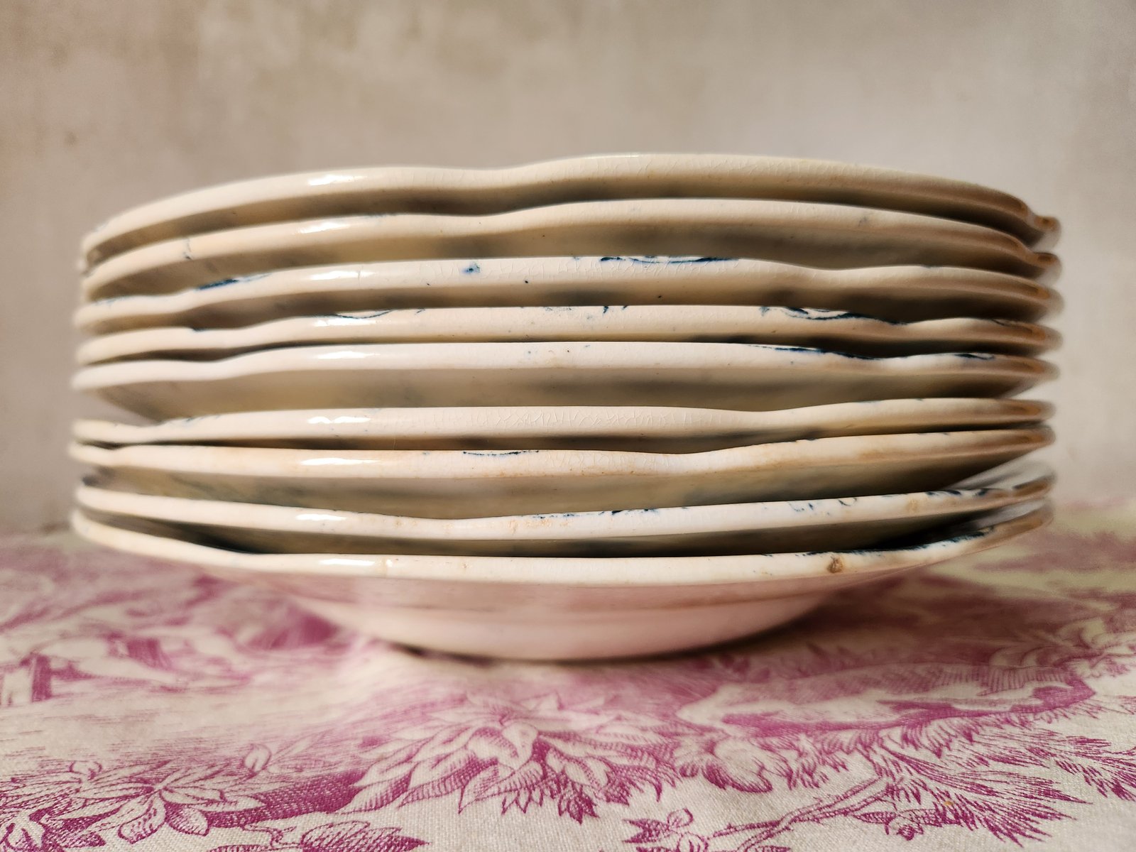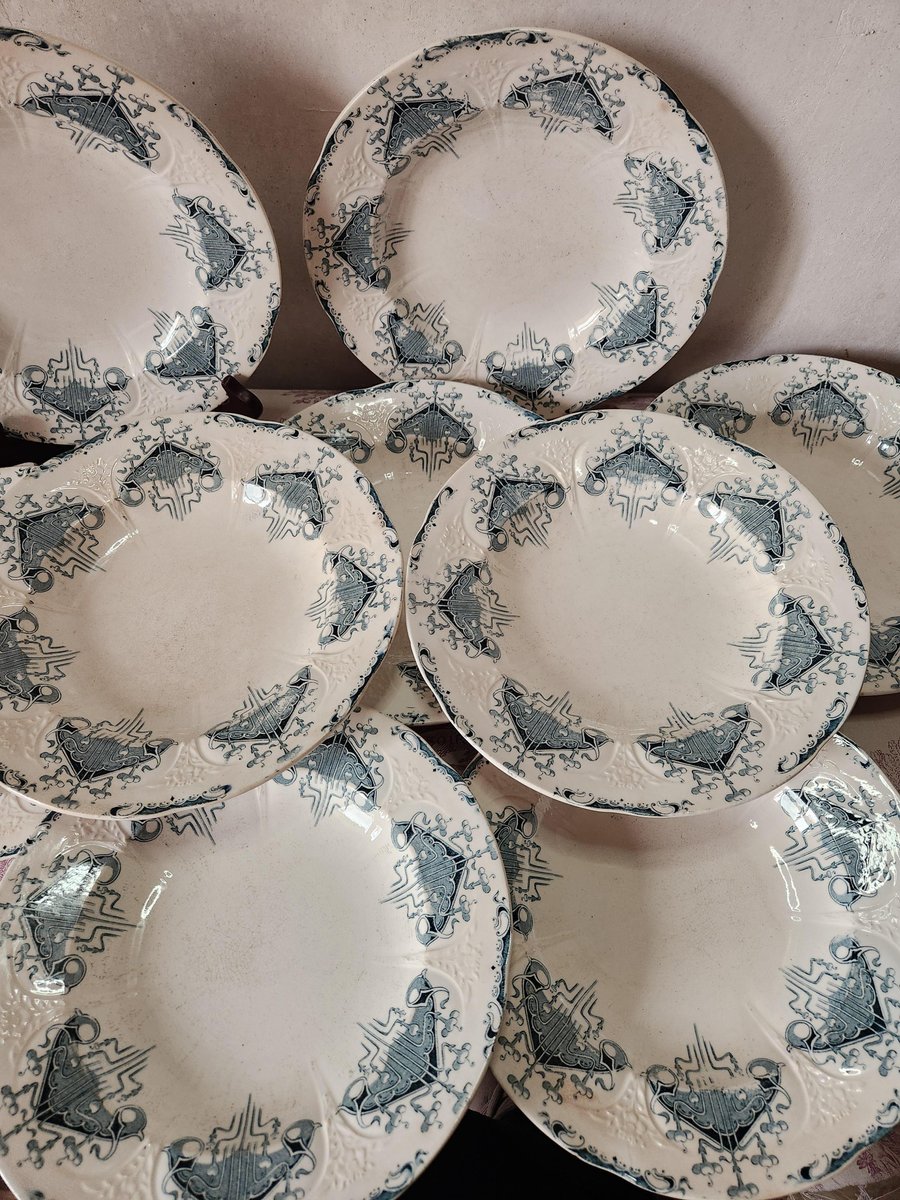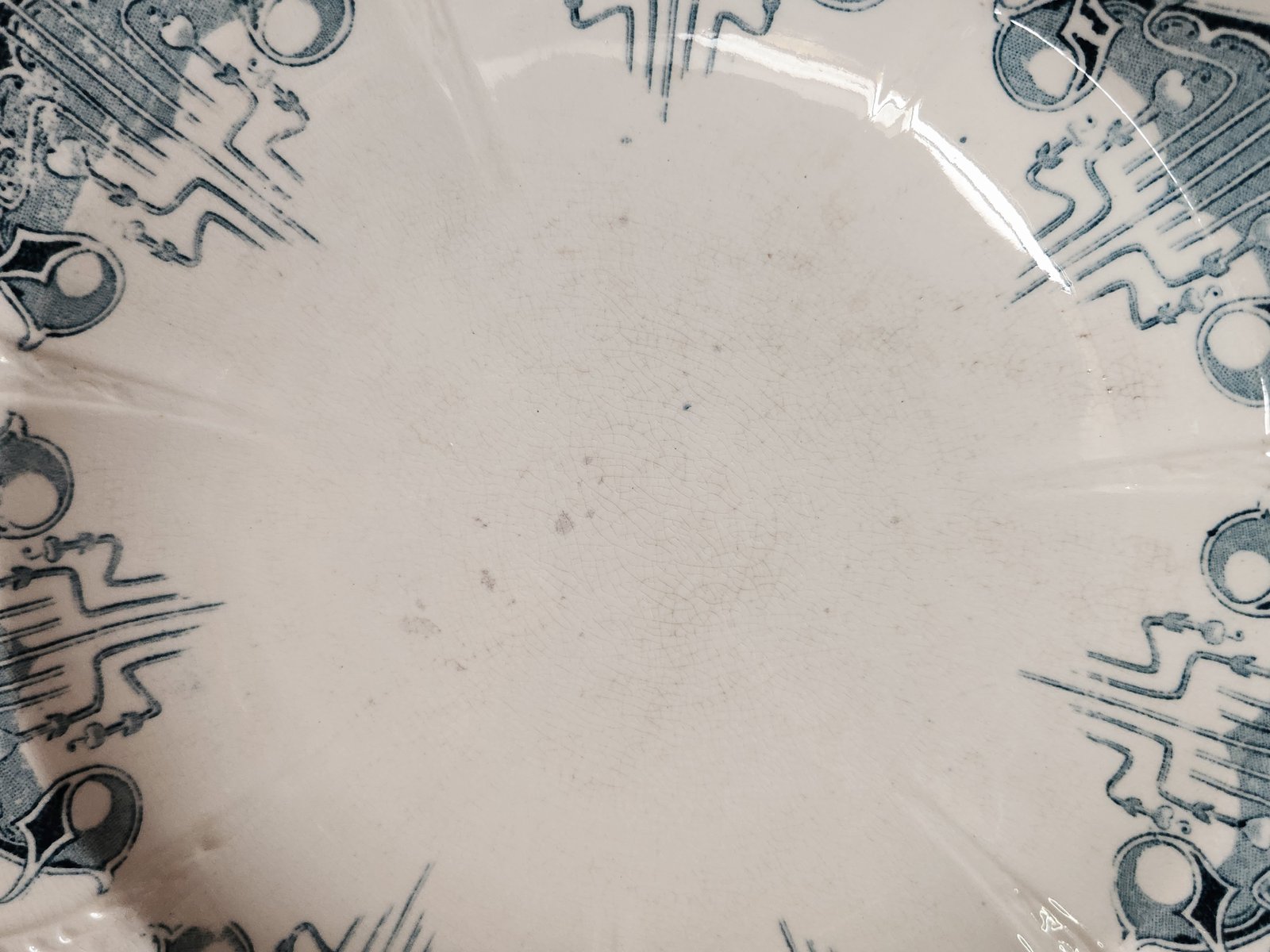 Antiguo juego de nueve platos huecos de piedra ferruginosa de transferencia azul bizantina de Longwy, terre de fer, de finales del siglo XIX. Hermosa decoración en un patrón muy Art Nouveau con una decoración subyacente en relieve.